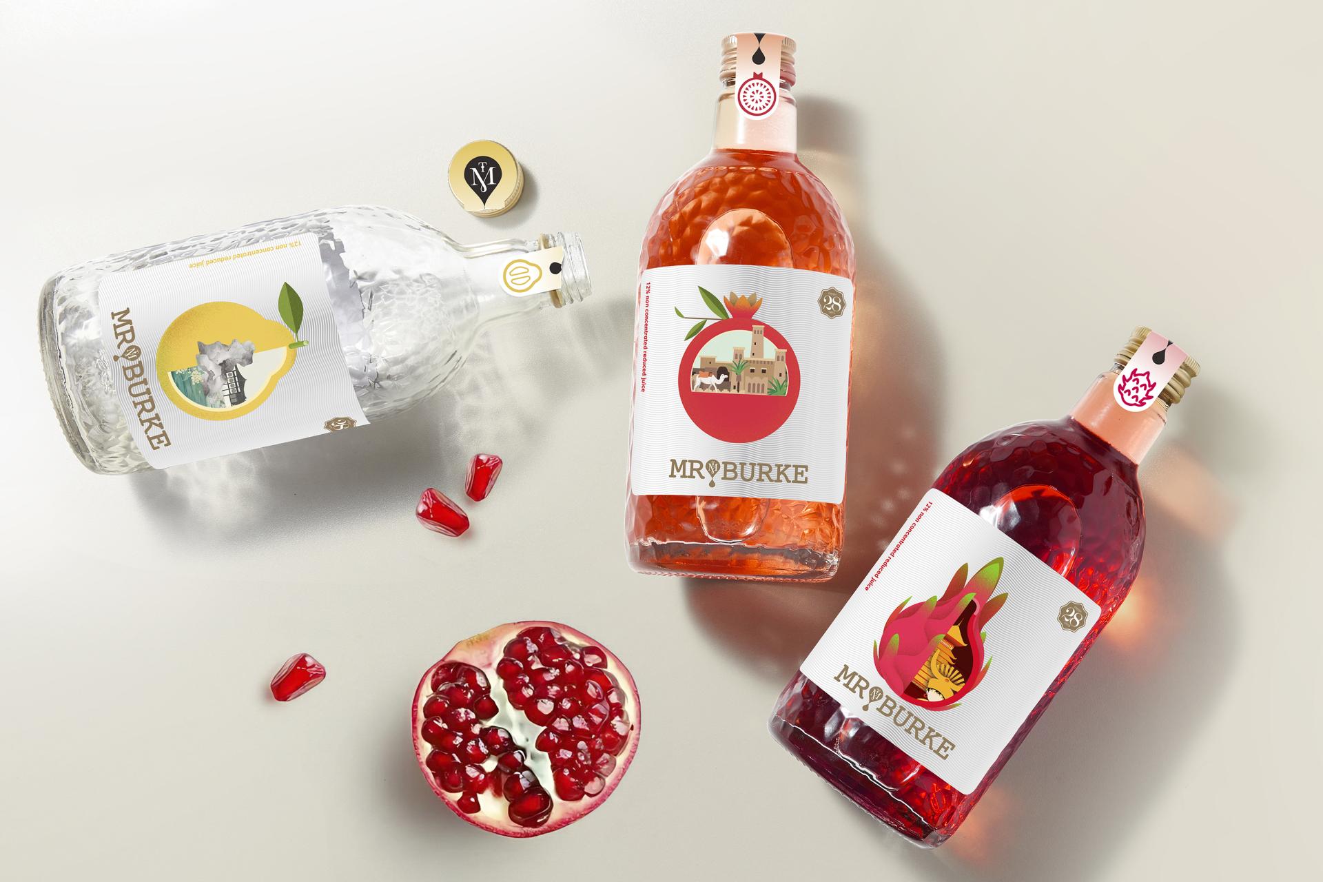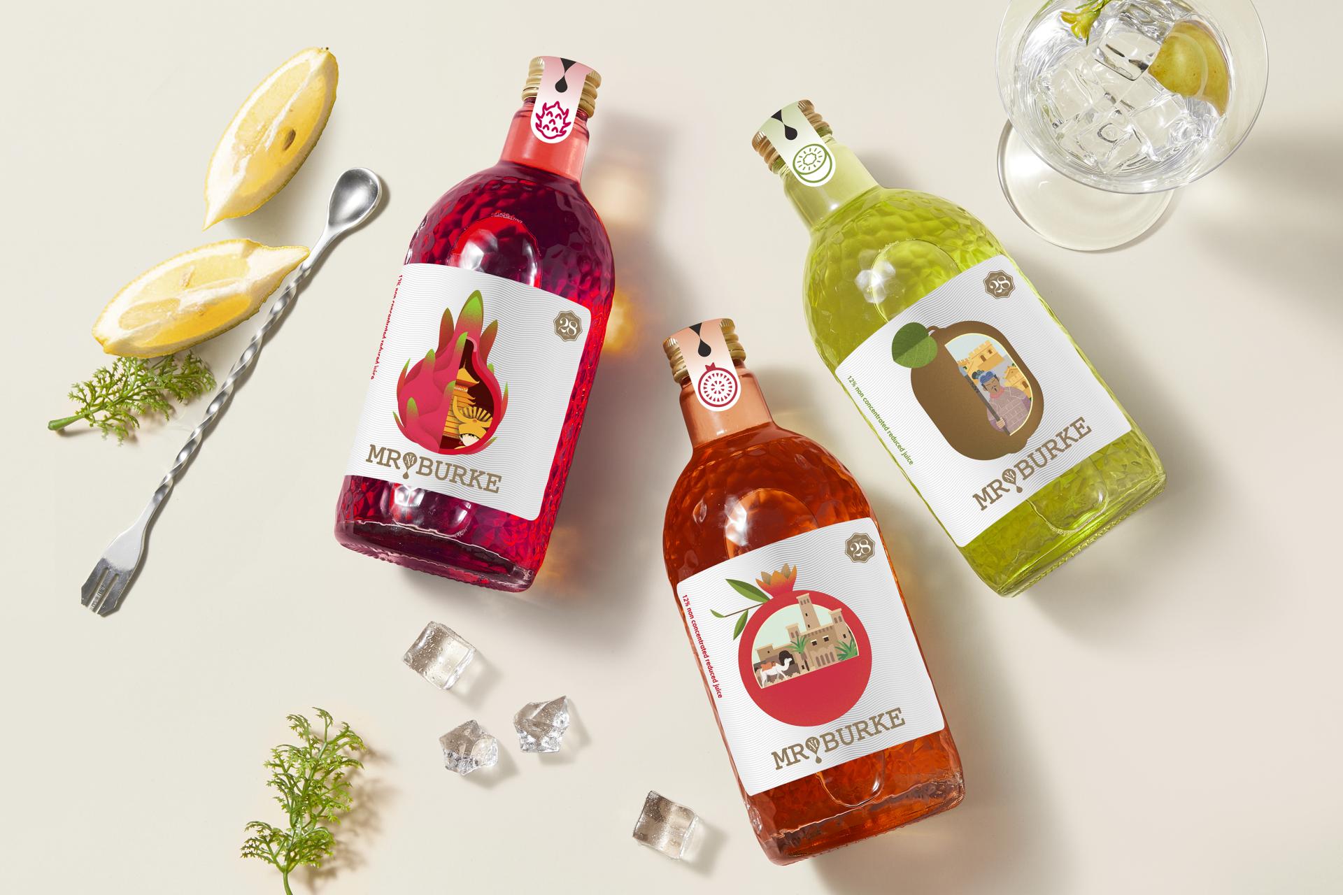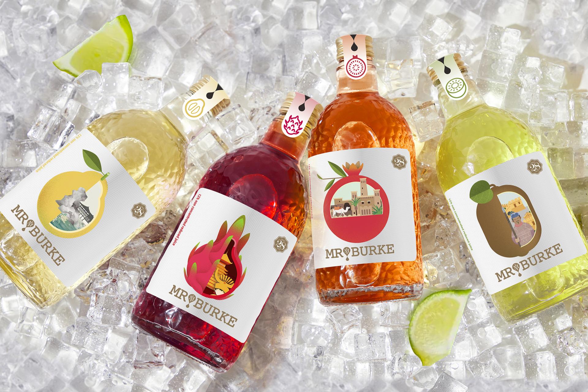 The Mr. Burke fruit wine series, part of the MONTES brand, is conceived for expressive, free-spirited young adults. Drawing from the traditions and landscapes of renowned fruit-growing regions, each label distills the character of its fruit into clean, geometric compositions, interlacing them with motifs from surrounding nature and local heritage. The result is a contemporary decorative language enriched with cultural resonance.