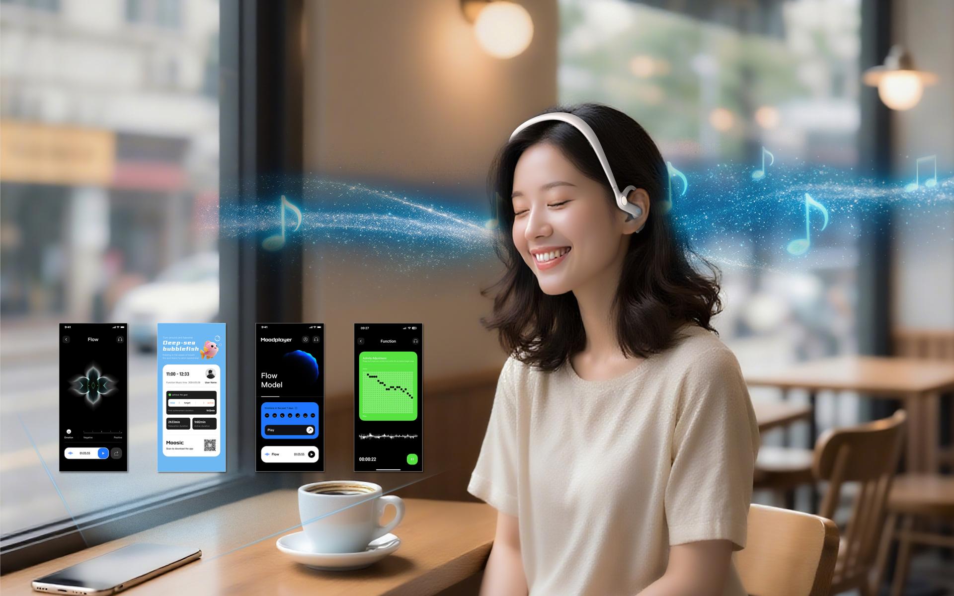 Paired with a dedicated app, Moosic creates an emotional feedback loop—Flow responses map the mental landscape, while Function tunes brain states (focus/relaxation) via frequency-modulated melodies. The app automatically generates intuitive real-time EEG data, helping users track their mental patterns.