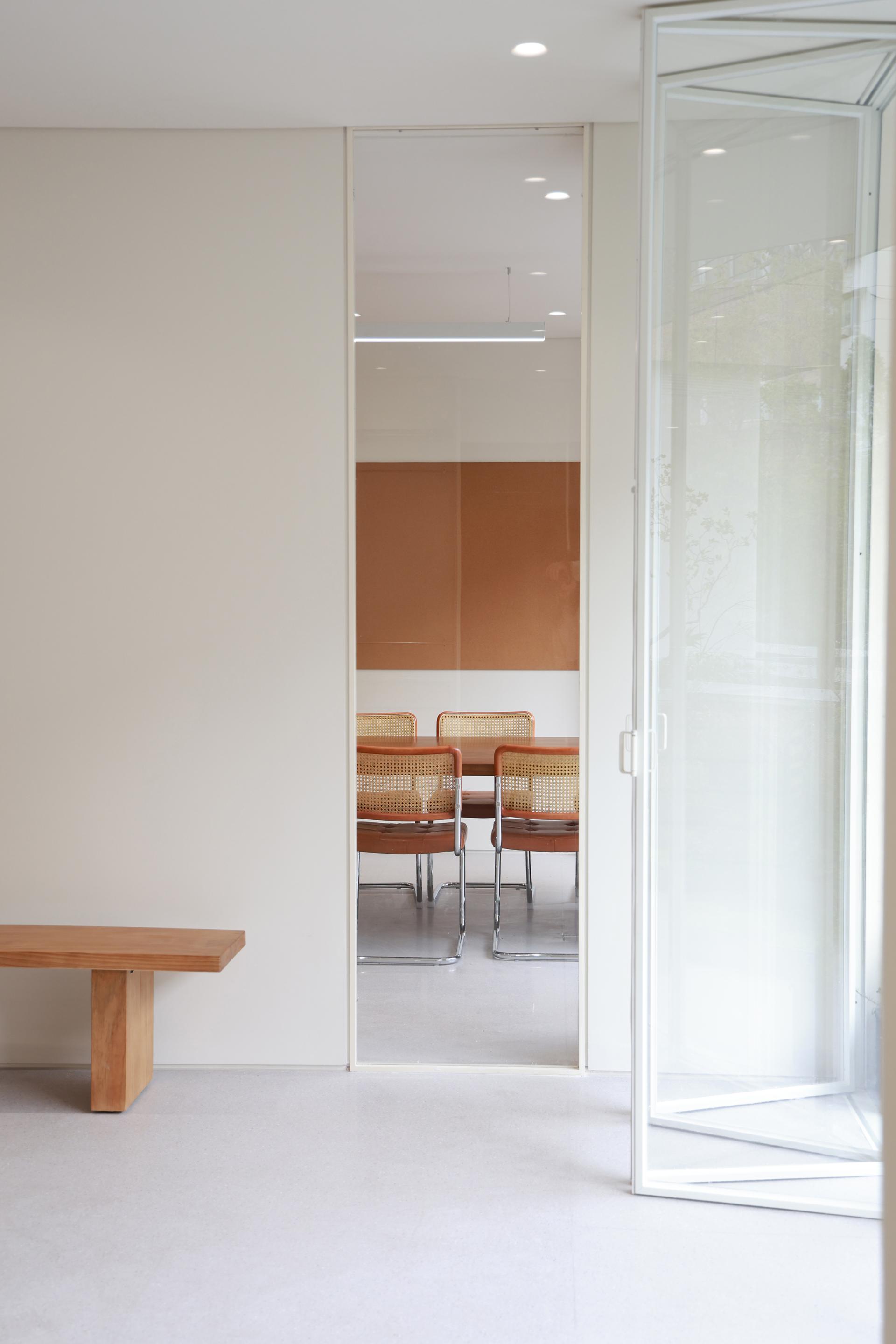 Visual Connectivity: Glass partitions and light-toned flooring enhance transparency, ensuring indoor–outdoor continuity. A neutral palette (off-white, light wood, brown accents) grounds the space, punctuated by vibrant material samples for dynamism.