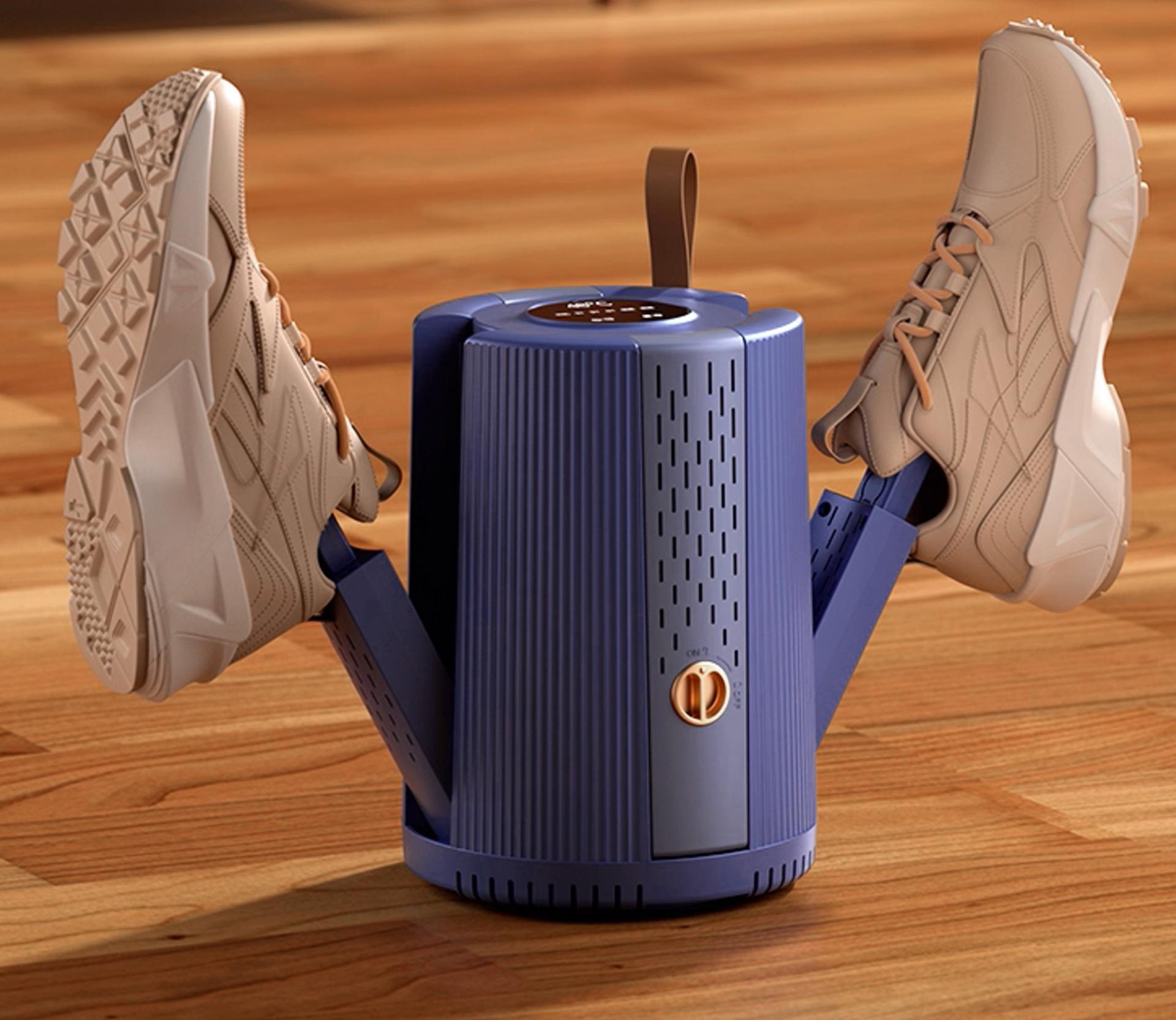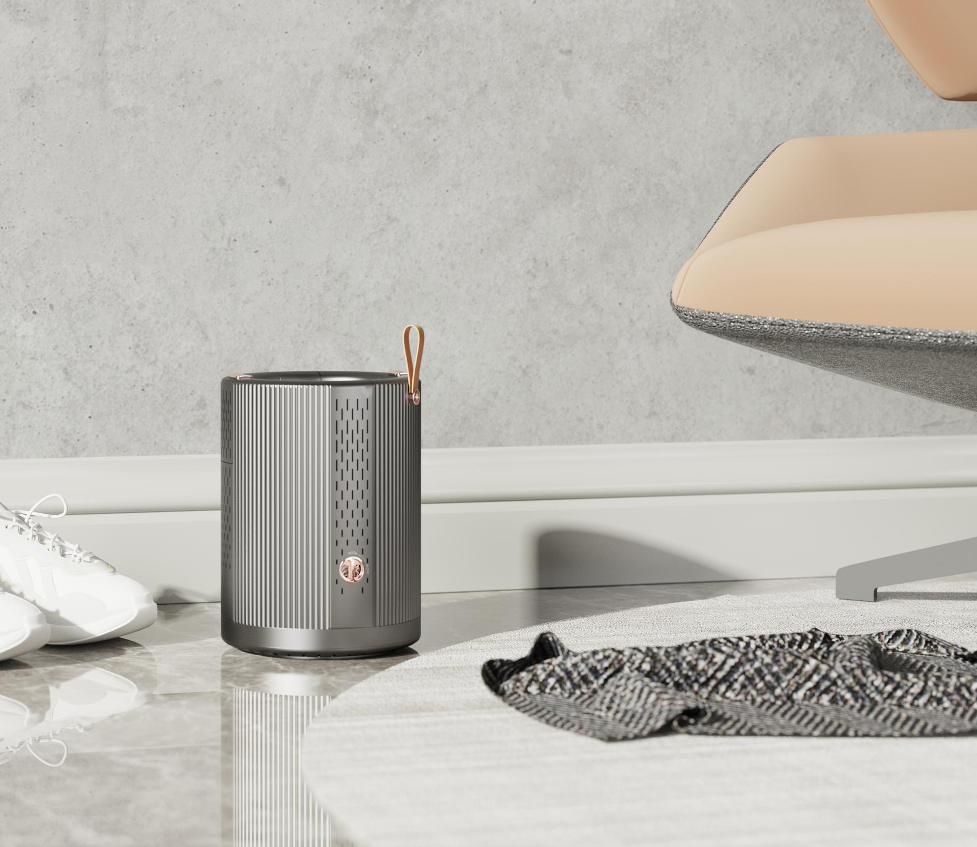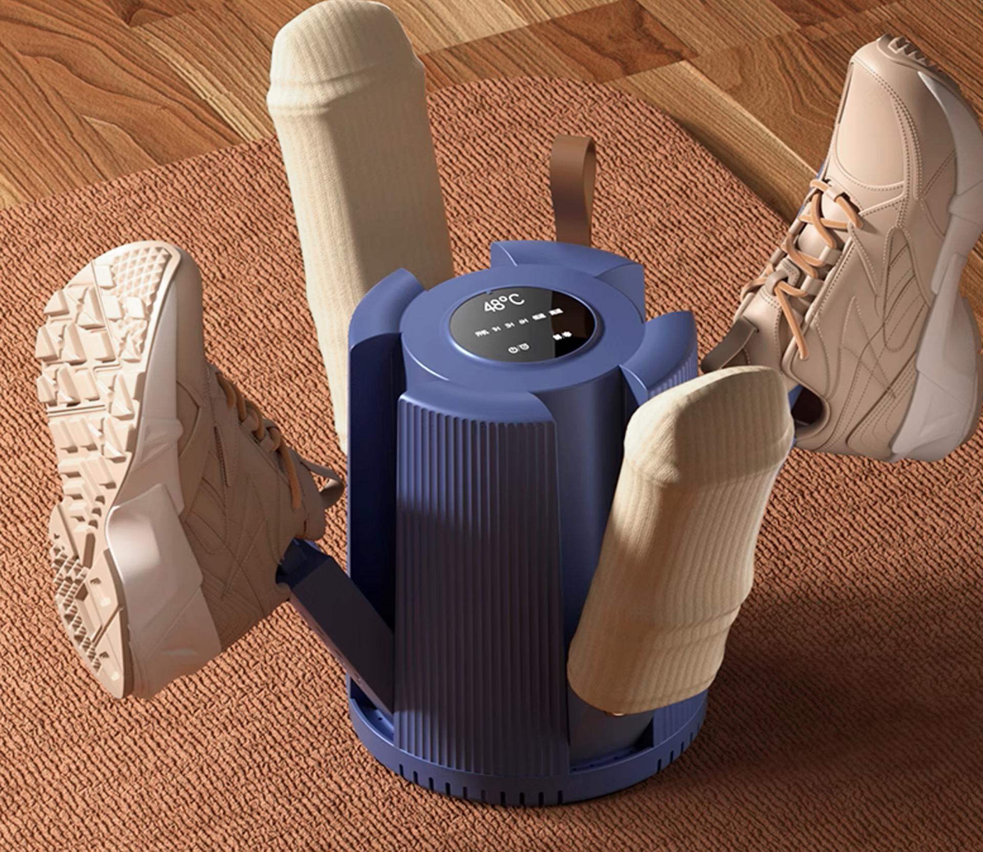 This smart shoe dryer reimagines functional hardware as a piece of geometric art: a minimalist cylindrical form that radiates quiet tech appeal. Four hidden air columns—its core innovation—deploy or retract with a simple push. Two of the columns telescope outward, allowing two pairs of shoes to be dried simultaneously while still occupying a remarkably small footprint.