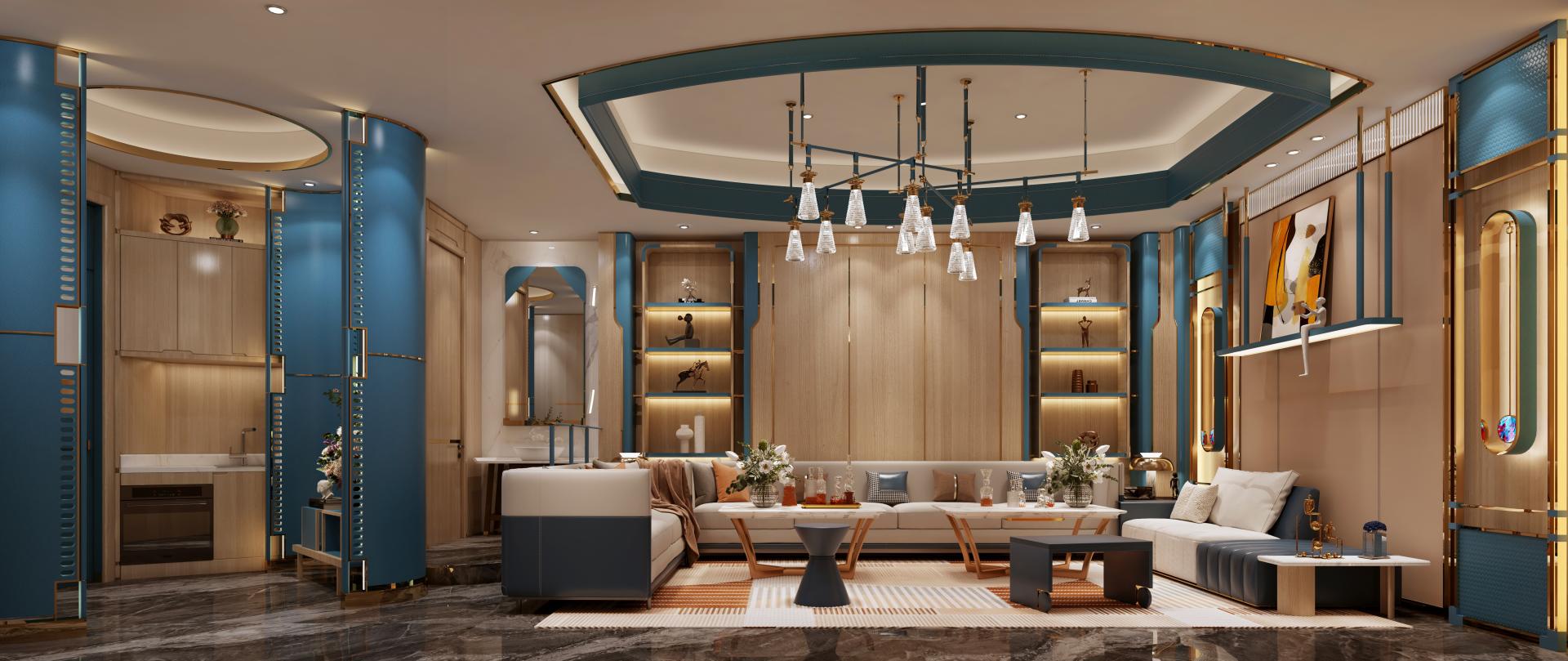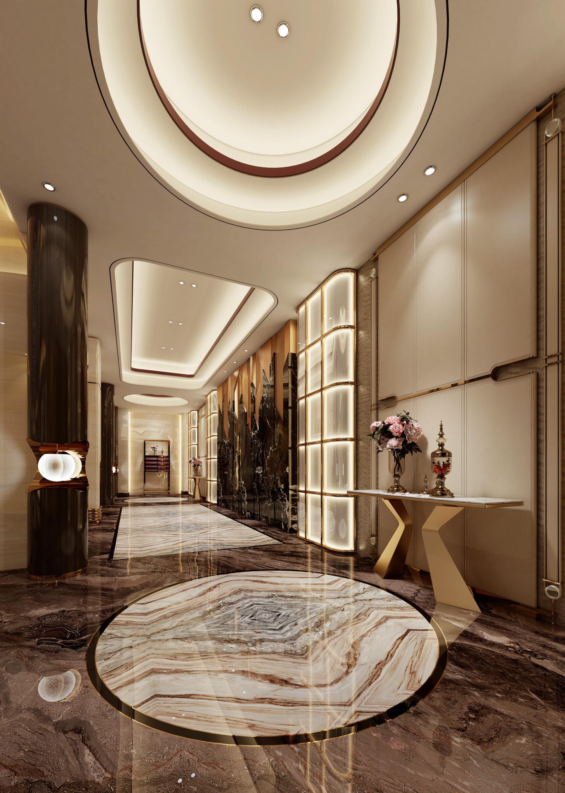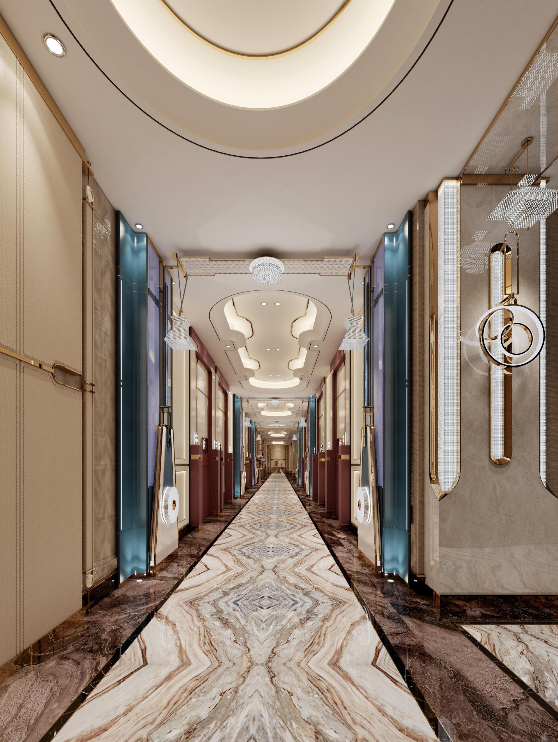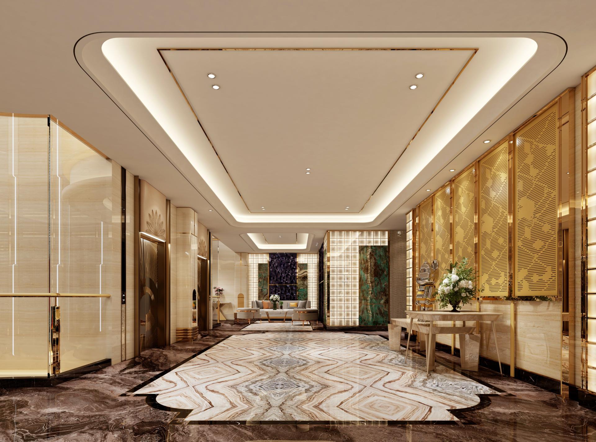 The core of the design is the interplay of light and spatial structure, evoking the sensation of floating through a galaxy. The central hall features a starry sky ceiling, seamlessly integrating LED screens with concealed lighting to continuously simulate twinkling stars and dynamic celestial scenes. Wall treatments combine natural marble, wood veneer, and leather, while selective accents of stainless steel and glass enhance spatial depth, hierarchy, and contemporary elegance. Intelligent control systems synchronize lighting, audio, and environmental settings, creating adaptable atmospheres for both business meetings and entertainment functions while ensuring privacy and comfort.