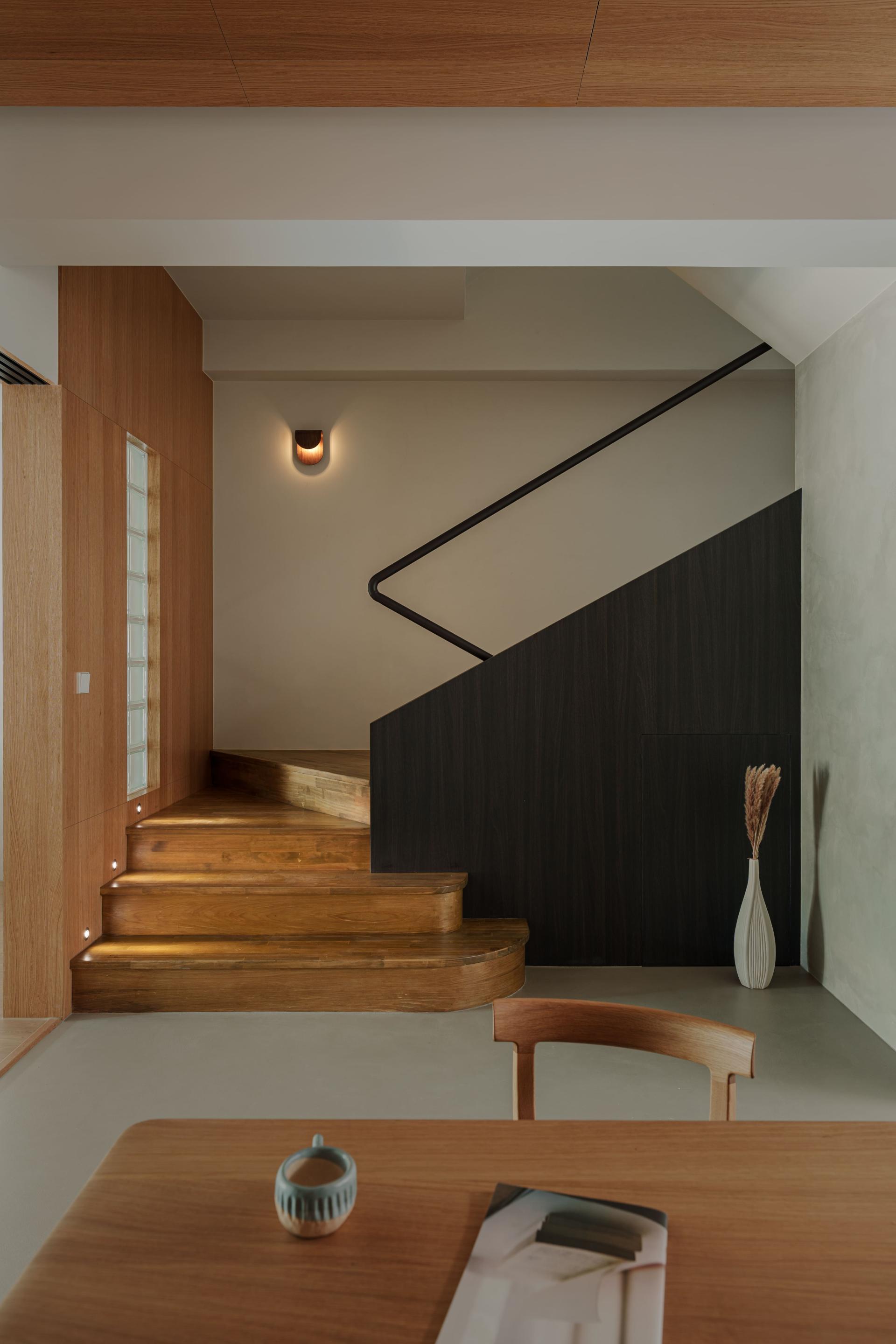 We reoriented the staircase treads toward the living room, allowing the dining space to reclaim balanced proportions. Sliding fluted-glass doors between the living and dining areas provide privacy without blocking light. Clear grey glass between dining and kitchen ensures visual connection and interaction during cooking. By layering transparency and translucency, we created a dynamic boundary that shifts with daily life—open for fluidity, closed for intimacy.