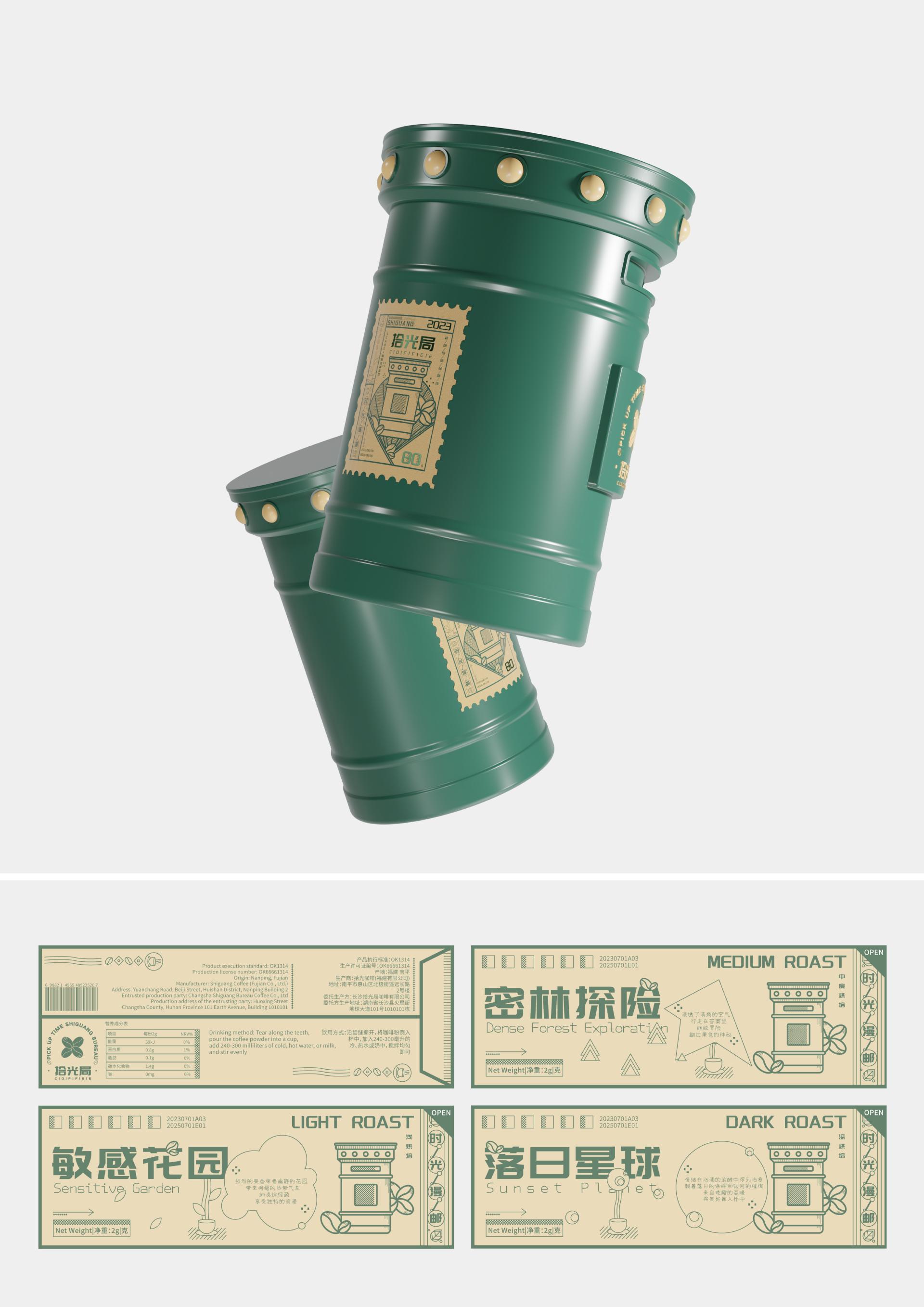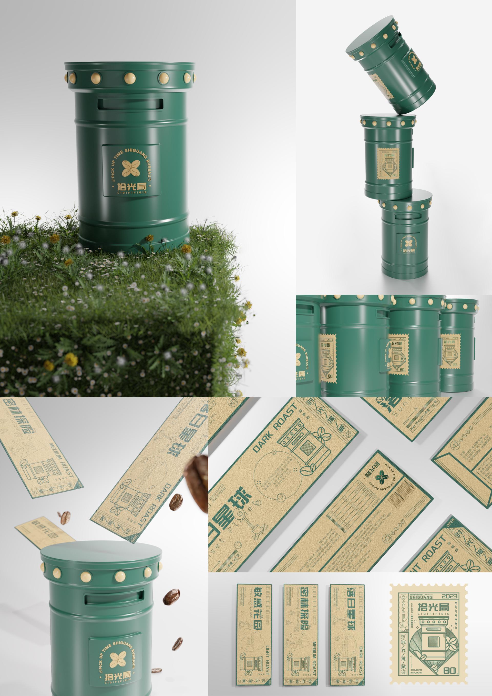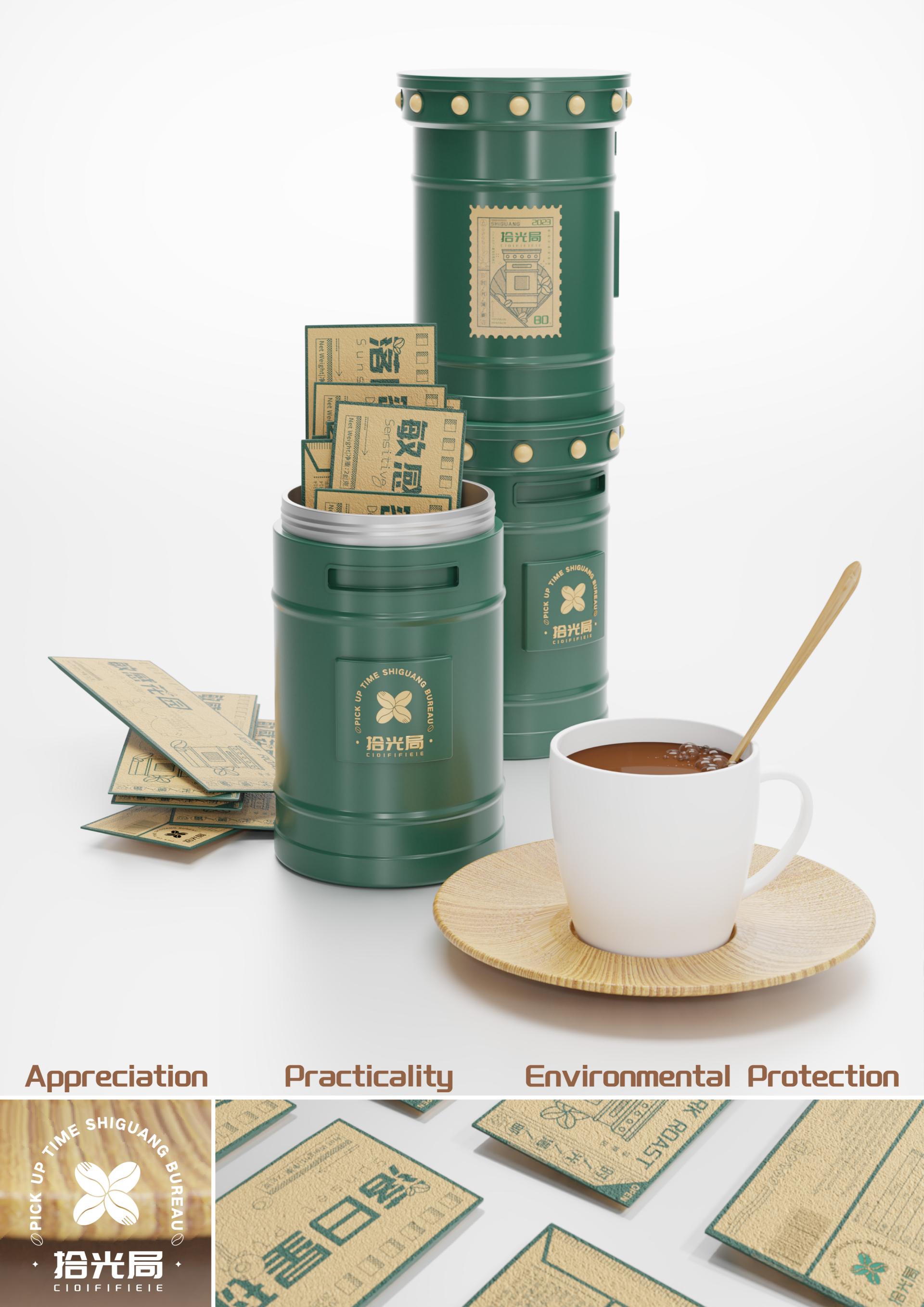 This set of works starts from " Time Travel Mail " and designs the "Shiguang Bureau" coffee brand. The overall packaging adopts a retro tone, combining the mailbox with coffee. The cylindrical structure is convenient for storage, and the packaging design is beautiful and elegant, with both cultural and practical value. The internal bag design features three levels of roasted coffee as envelopes, enhancing the consumer experience while ensuring product sealing.
