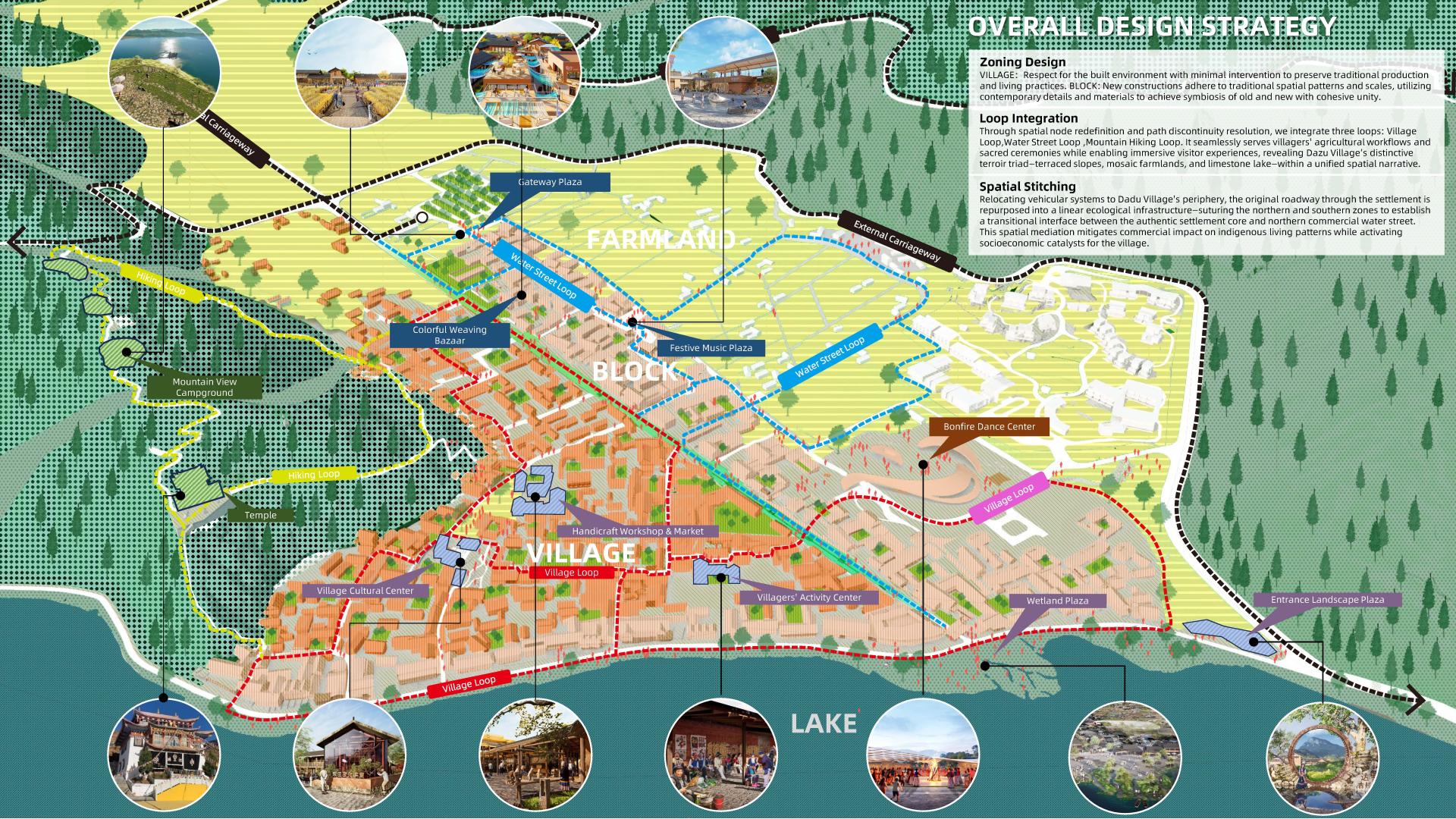 1. Sorting and Protecting the Fabric: To address the degradation of the organic spatial fabric, disordered internal circulation, and the village's bisection by a transit road, we propose three overarching strategies: zoning by classification, creating a connecting loop, and spatial suture.