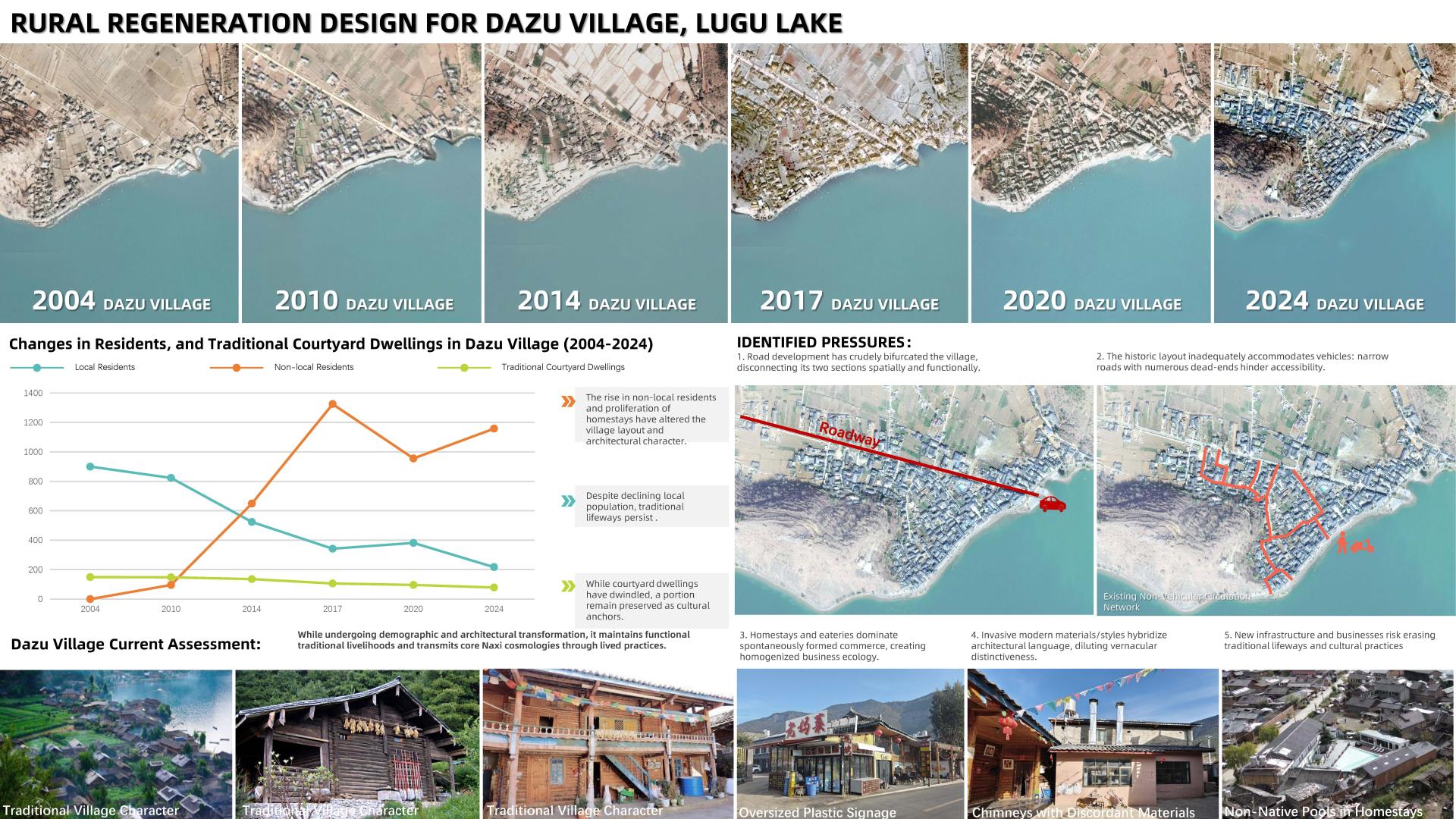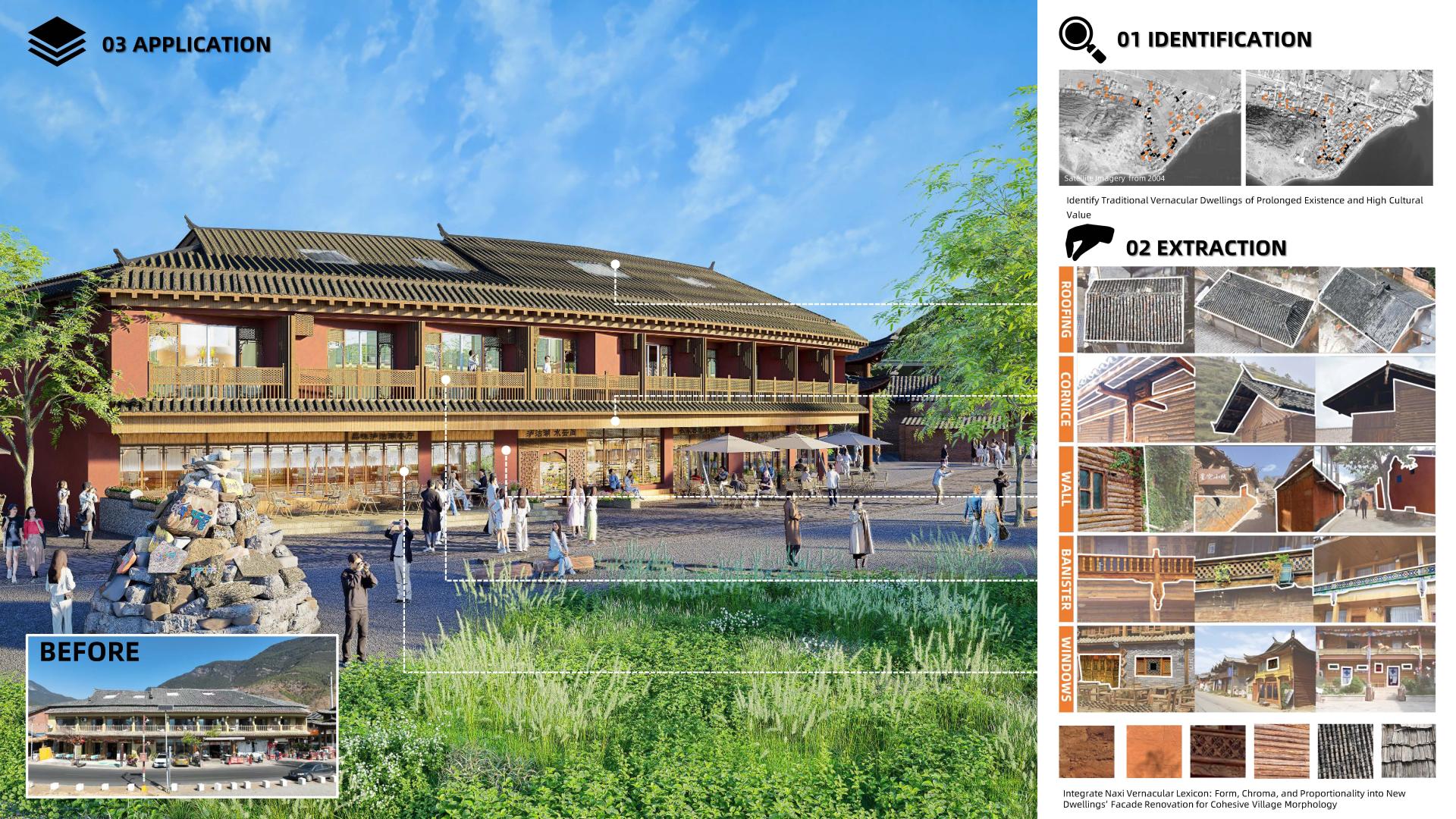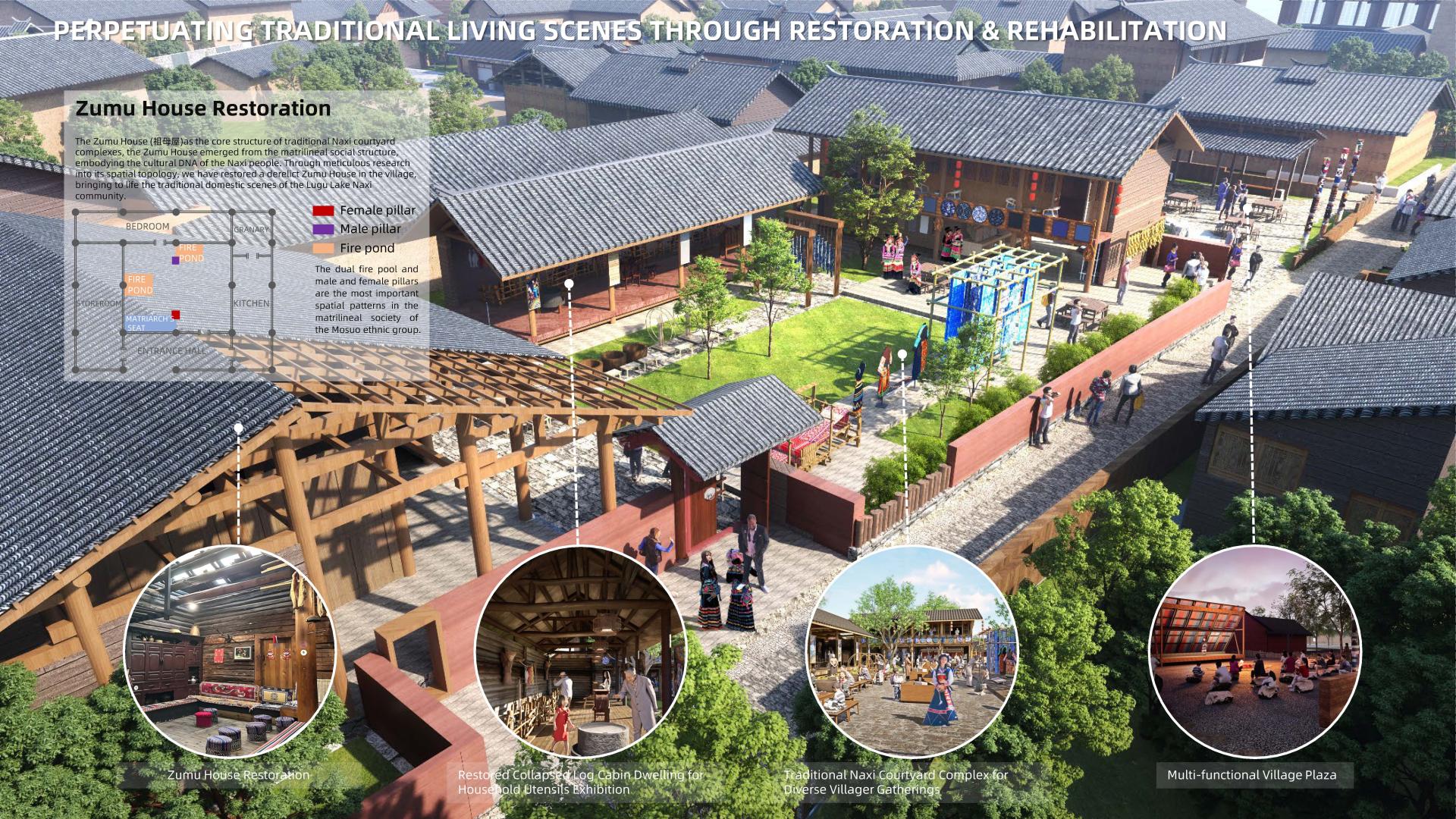 Since 2000, the Naxi ethnic villages around Lugu Lake have undergone rapid, unplanned expansion due to modernization, changing family structures, and tourism development, placing traditional cultural heritage at risk. Our goal is to reshape the village through spatial overlay while respecting the existing built environment, thereby preserving cultural continuity. The specific strategies are: