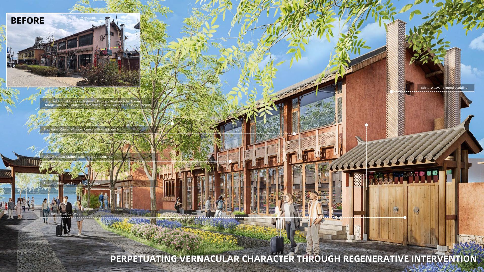 2. Extracting and Integrating Vernacular Elements: By analyzing historical satellite imagery, we identified historic courtyard dwellings with significant cultural value. We studied their form, color, and scale, then applied these elements to the renovation of recent reinforced concrete structures. This harmonizes the village's overall appearance.