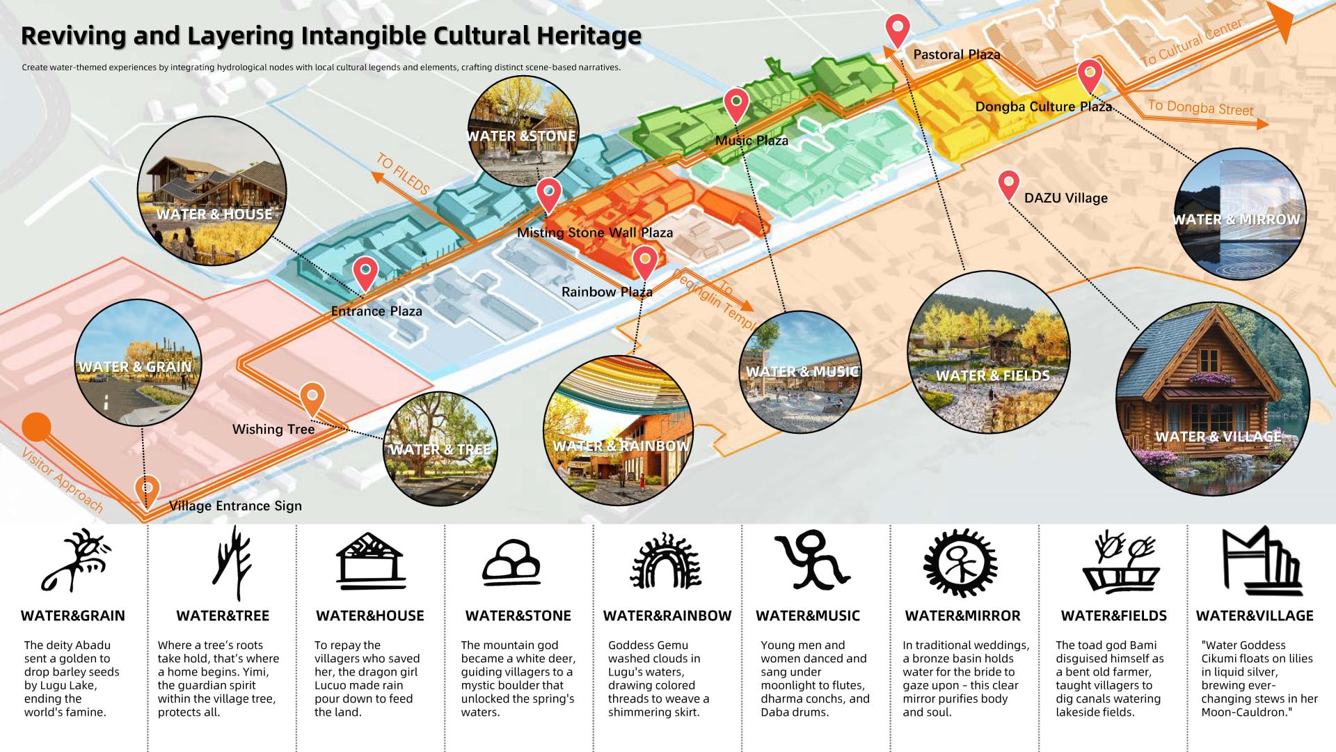4. Establishing and Anchoring Intangible Heritage: Dazu Village possesses rich oral traditions and stories – intangible cultural heritage (ICH) facing decline. We documented and organized this heritage, integrating it with new functional spaces to create thematic nodes based on legends, alongside performance spaces for traditional customs. This anchors the ICH firmly within its cultural landscape.