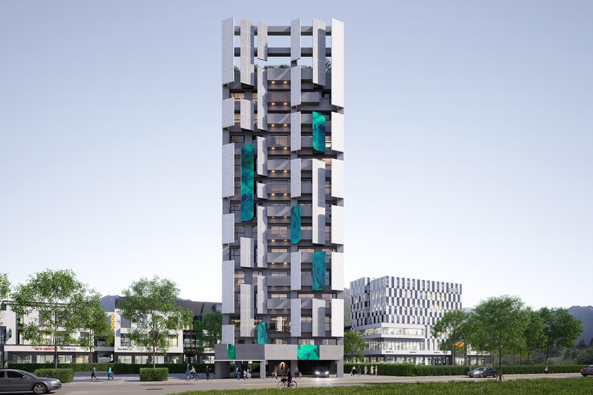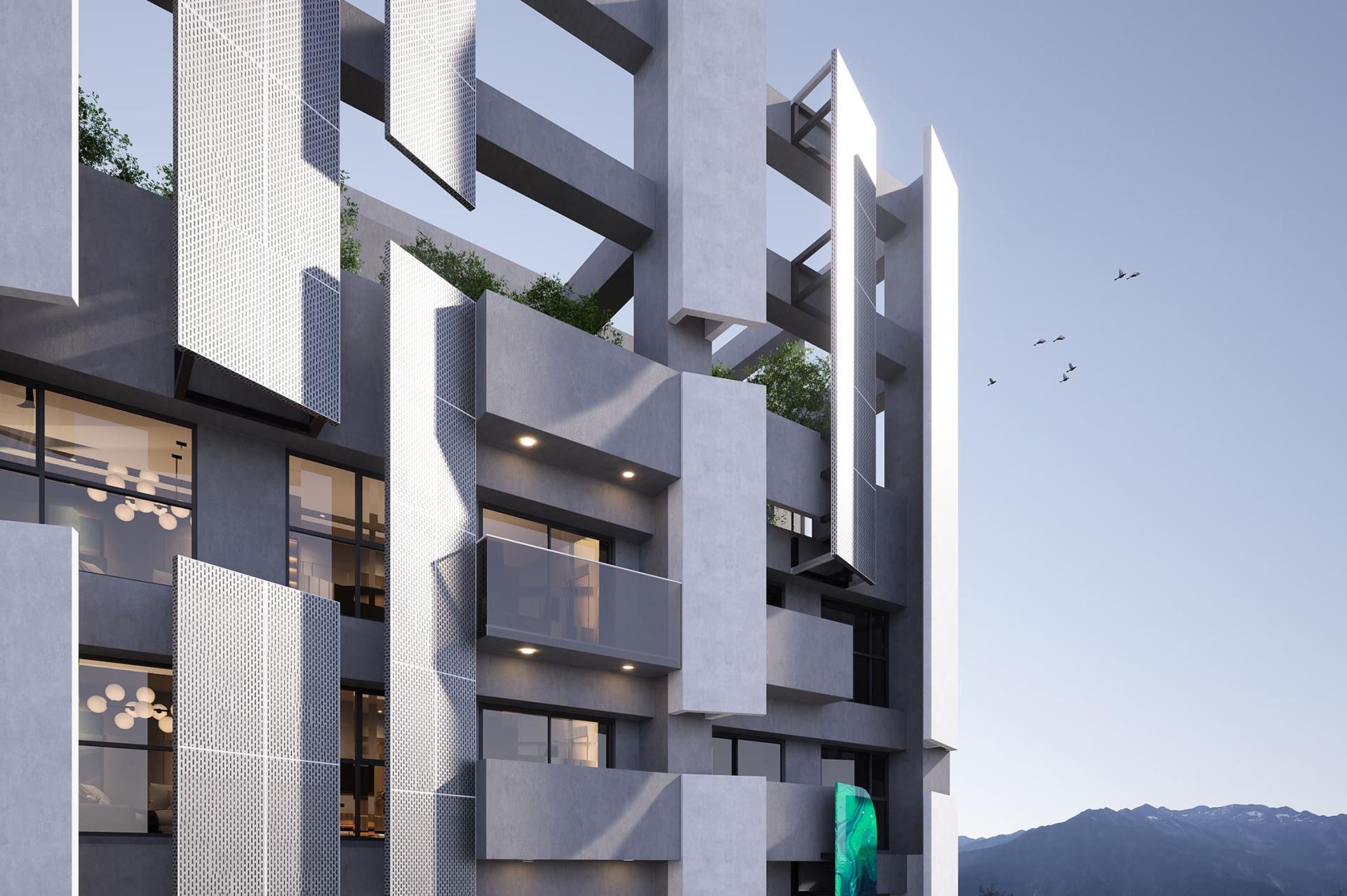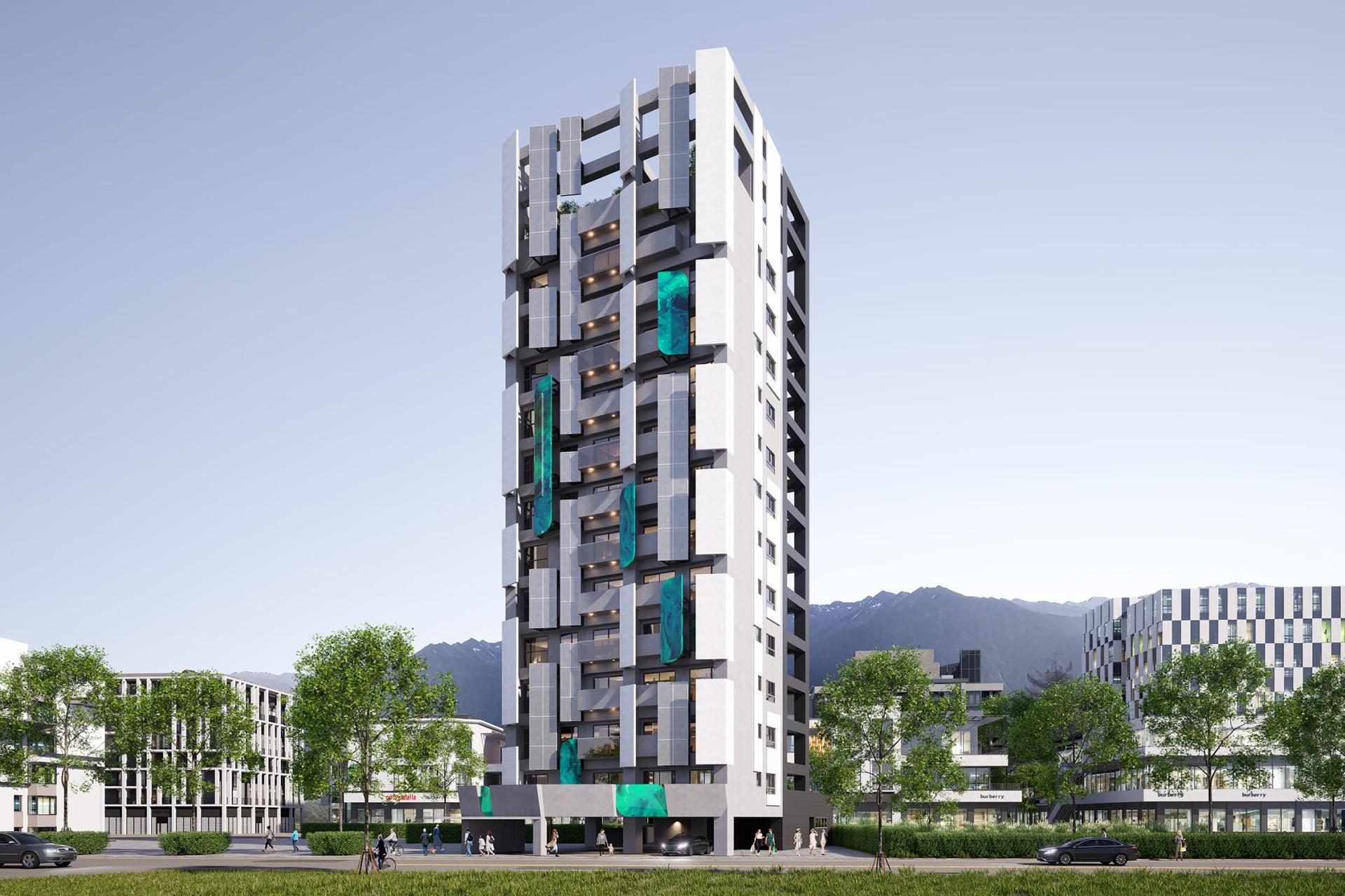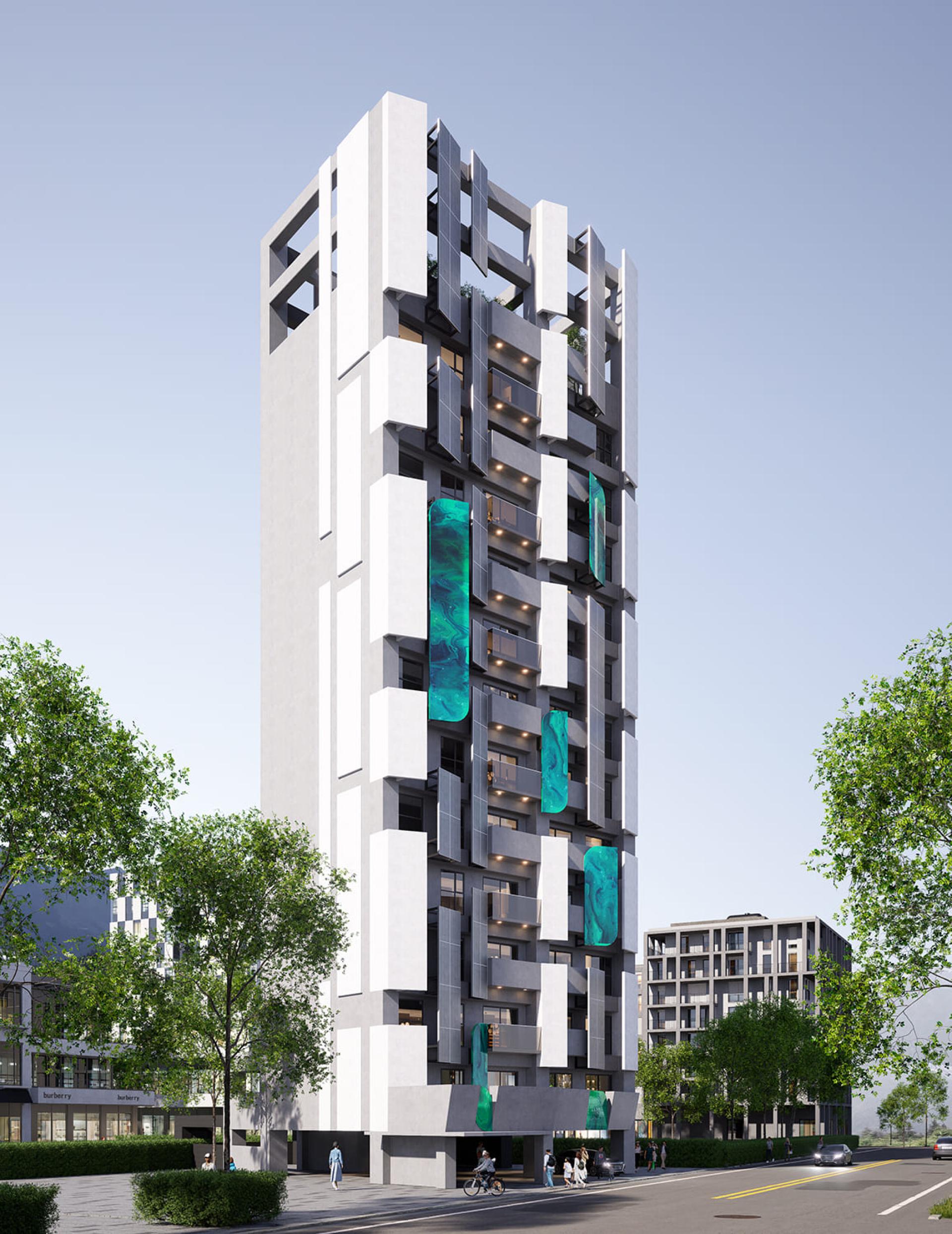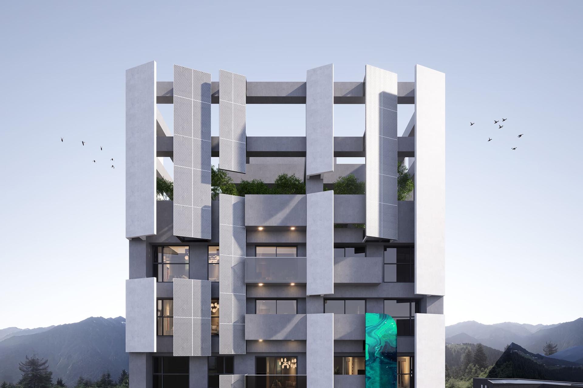 This project presents a contemporary residential building design concept that beautifully revolves around geometric elements. Its ambition is to forge a dynamic and visually captivating architectural form, achieved through the innovative use of angled metal panels and sleek vertical lines. Additionally, the design skillfully plays with layers of light and shadow, creating a multifaceted visual experience. Moreover, the incorporation of cantilevered balconies adds dramatic flair, while the elevated green space platform on the ground floor enhances interaction with the urban landscape. By employing contrasting colors and a variety of materials, this design not only elevates the building's visual identity but also seamlessly integrates it into the public realm, encouraging meaningful engagement between the inhabitants and their environment. In summary, this remarkable structure is poised to become a landmark, skillfully merging artistic expression with functional design, thereby embodying a harmonious relationship between aesthetics and practicality.