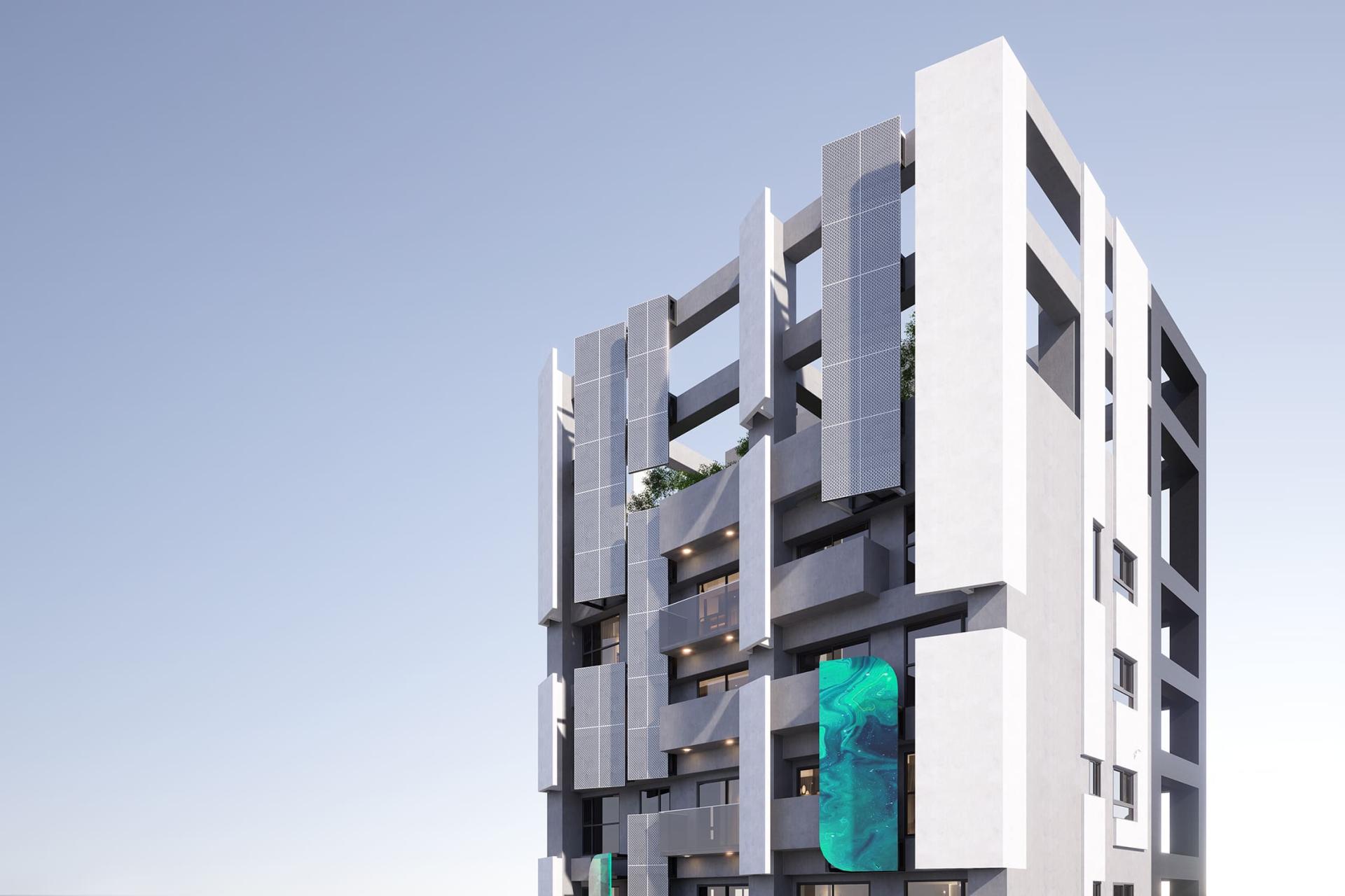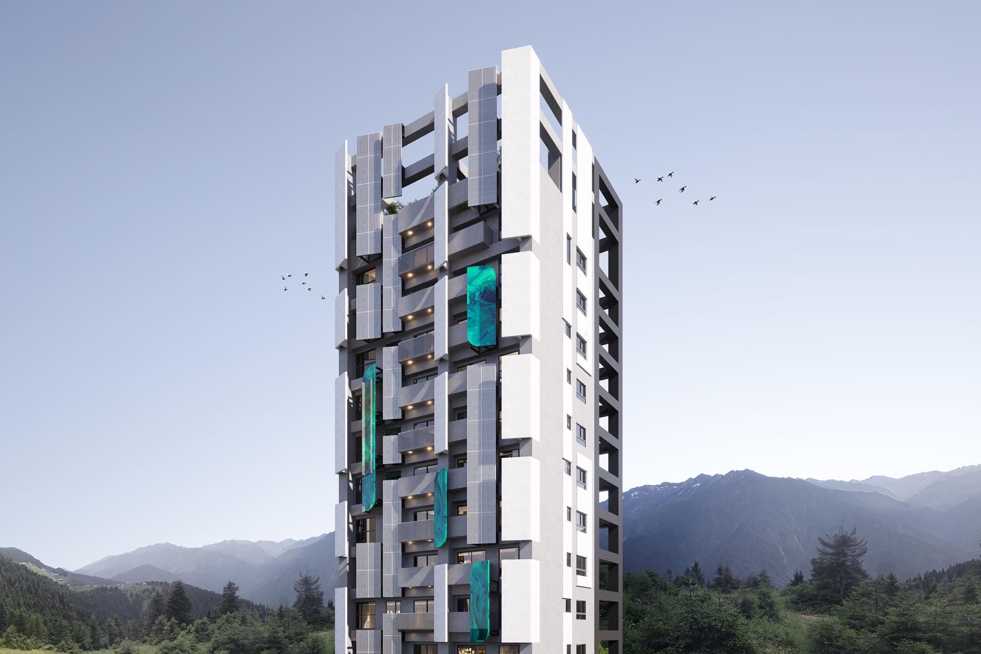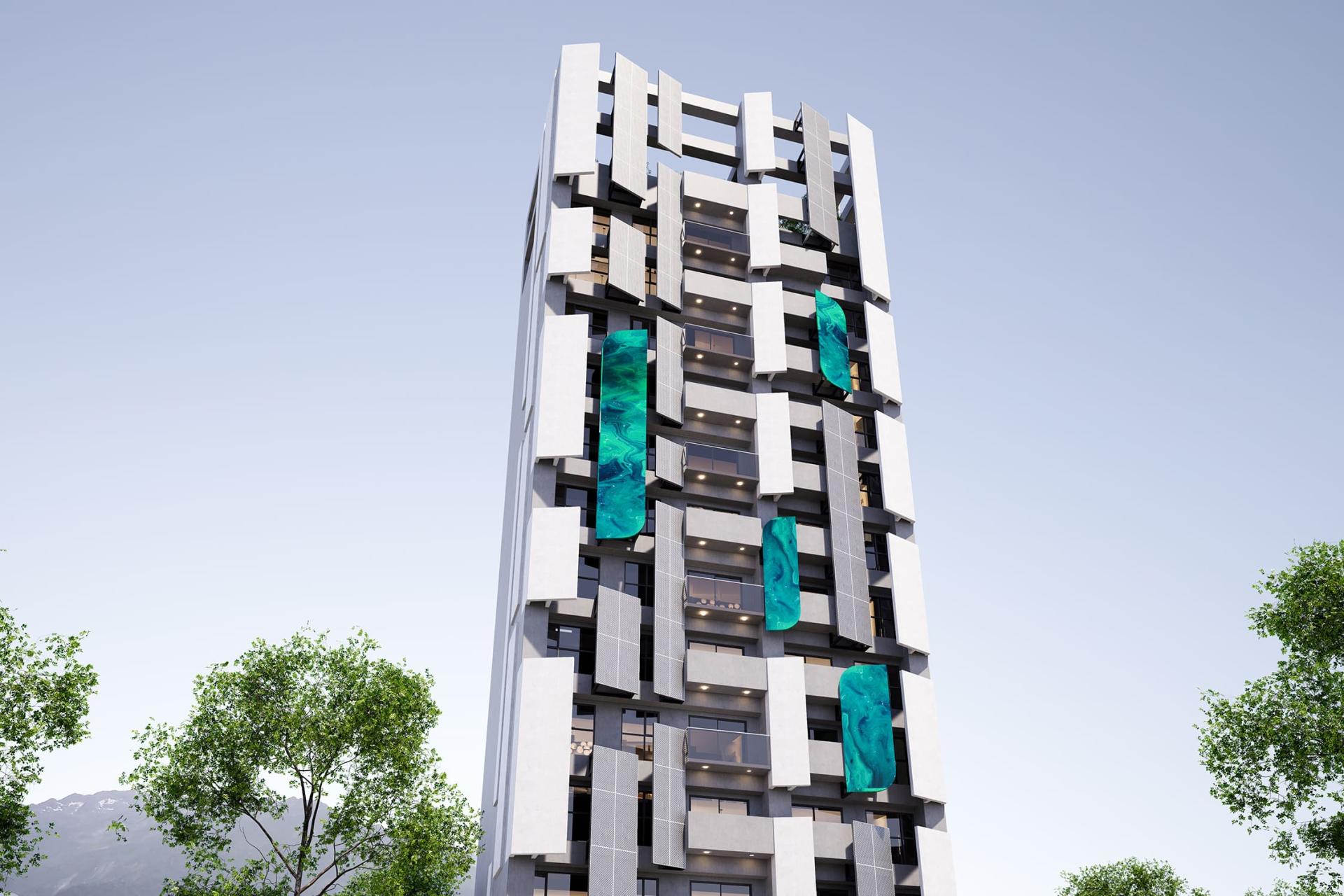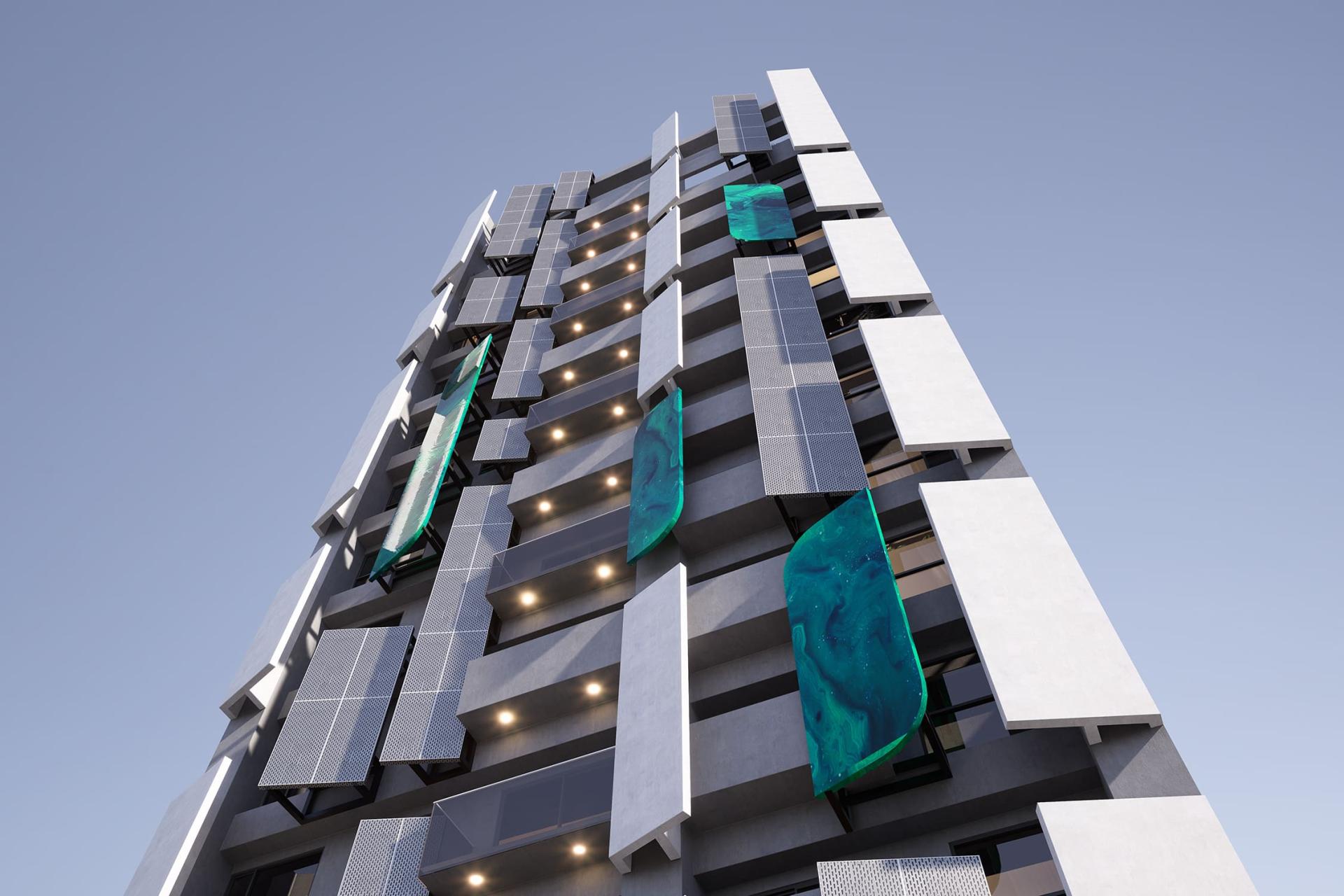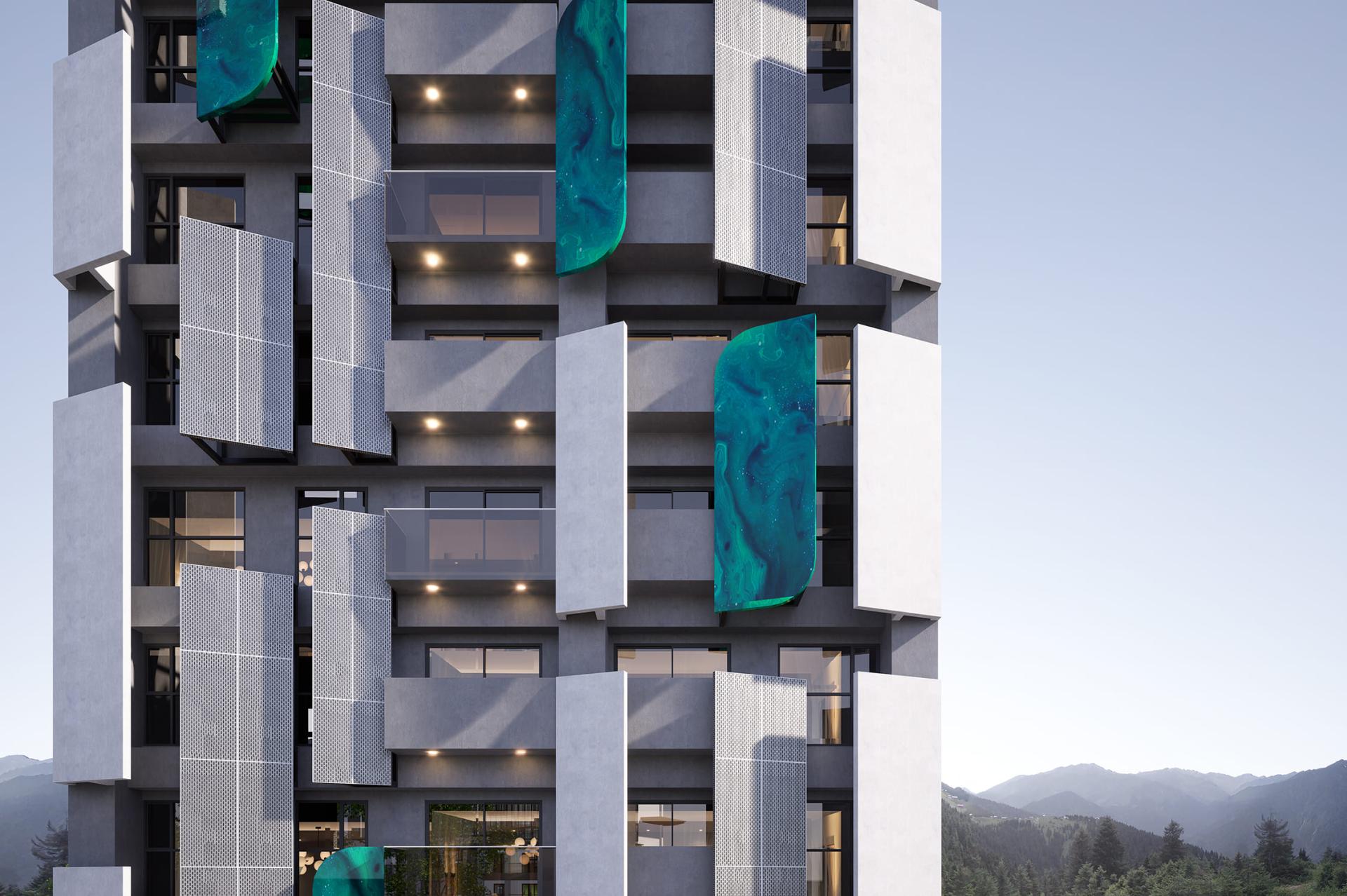 This project presents a contemporary residential building design concept that beautifully revolves around geometric elements. Its ambition is to forge a dynamic and visually captivating architectural form, achieved through the innovative use of angled metal panels and sleek vertical lines. Additionally, the design skillfully plays with layers of light and shadow, creating a multifaceted visual experience. Moreover, the incorporation of cantilevered balconies adds dramatic flair, while the elevated green space platform on the ground floor enhances interaction with the urban landscape. By employing contrasting colors and a variety of materials, this design not only elevates the building's visual identity but also seamlessly integrates it into the public realm, encouraging meaningful engagement between the inhabitants and their environment. In summary, this remarkable structure is poised to become a landmark, skillfully merging artistic expression with functional design, thereby embodying a harmonious relationship between aesthetics and practicality.