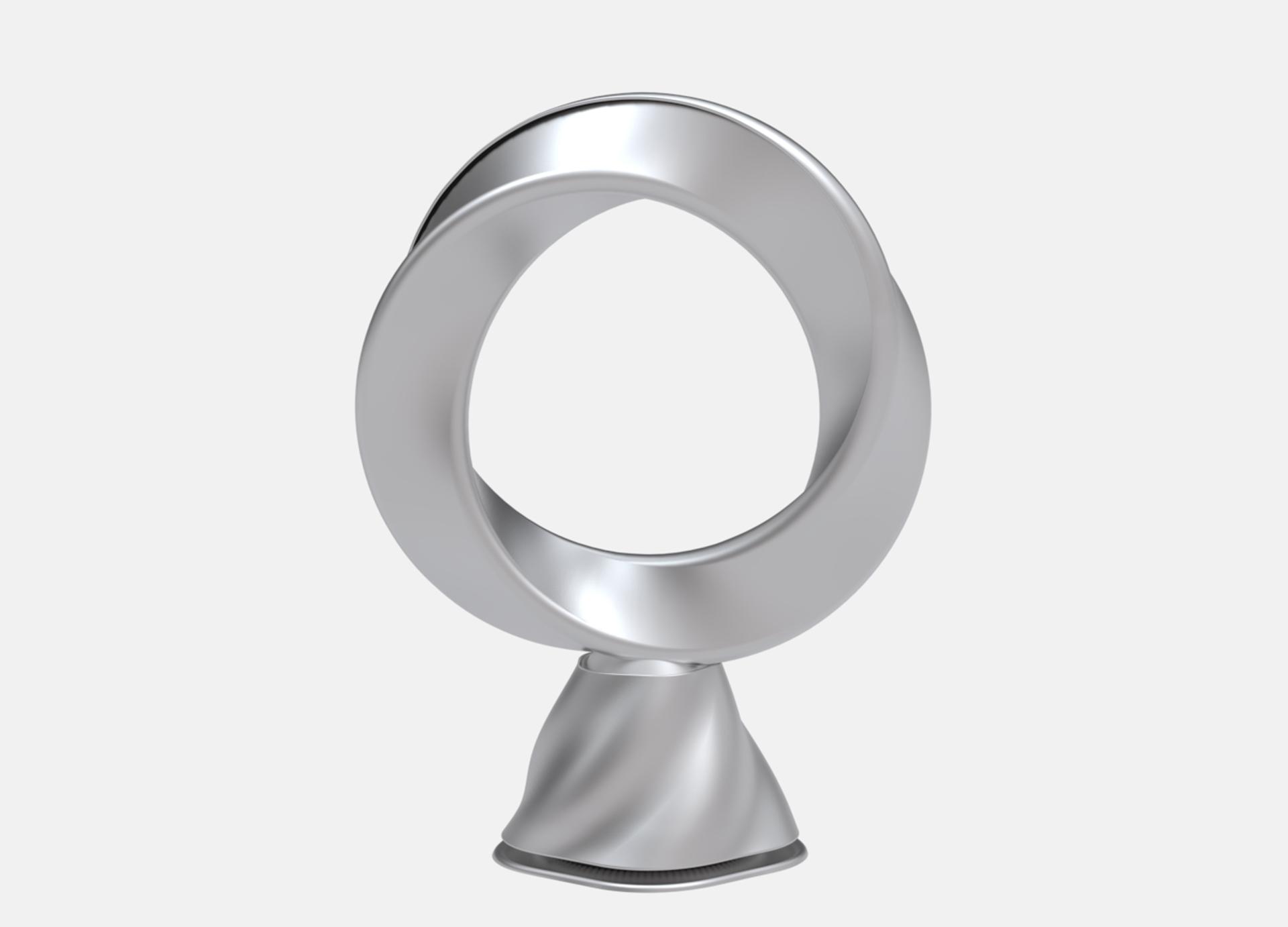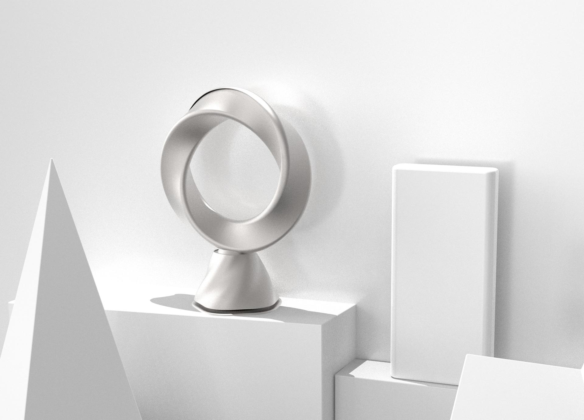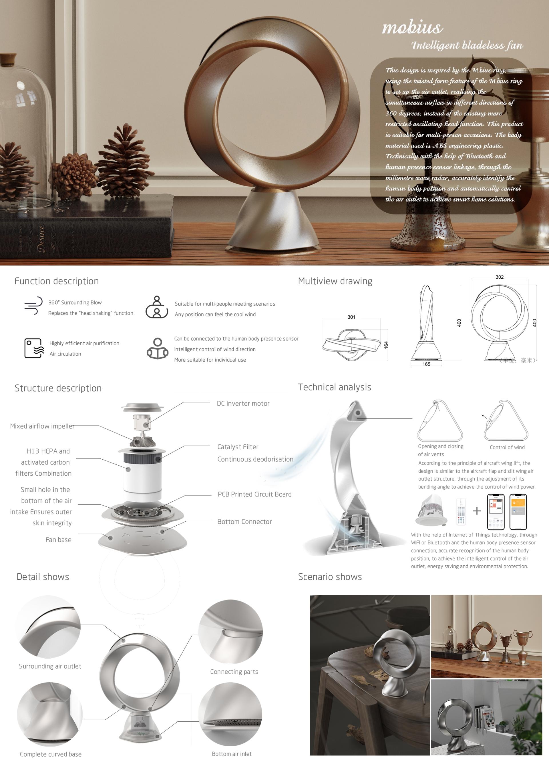 This design is inspired by the Möbius ring, using the twisted form feature of the Möbius ring to set up the air outlet, realising the simultaneous airflow in different directions of 360 degrees, instead of the existing more restricted oscillating head function. This product is suitable for multi-person occasions such as camping. Technically with the help of Bluetooth and human presence sensor linkage, through the millimetre wave radar, accurately identify the human body position and automatically control the air outlet to achieve smart home solutions.