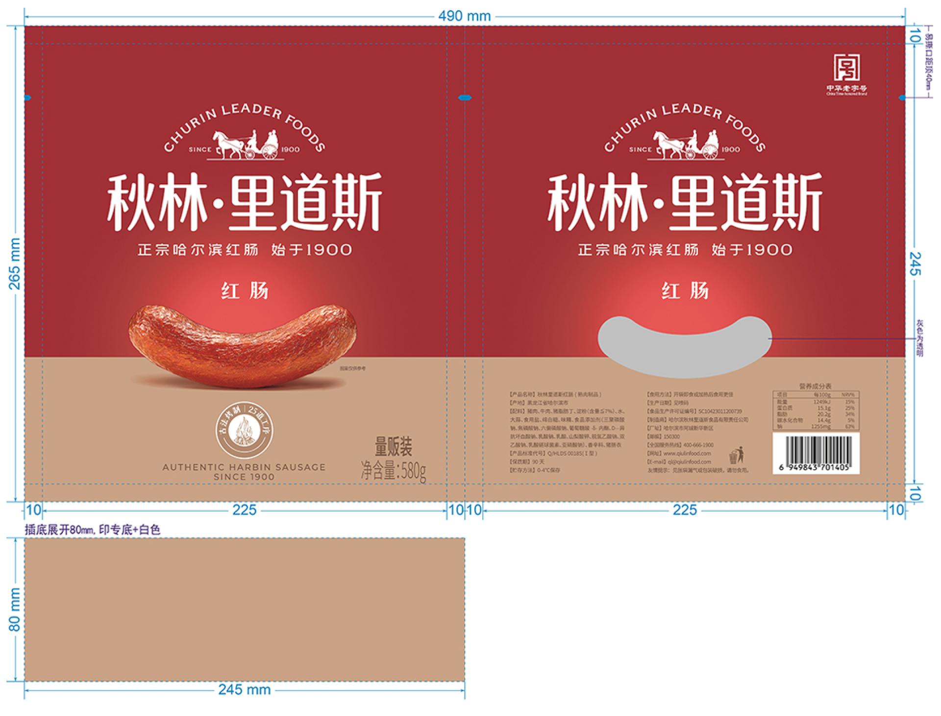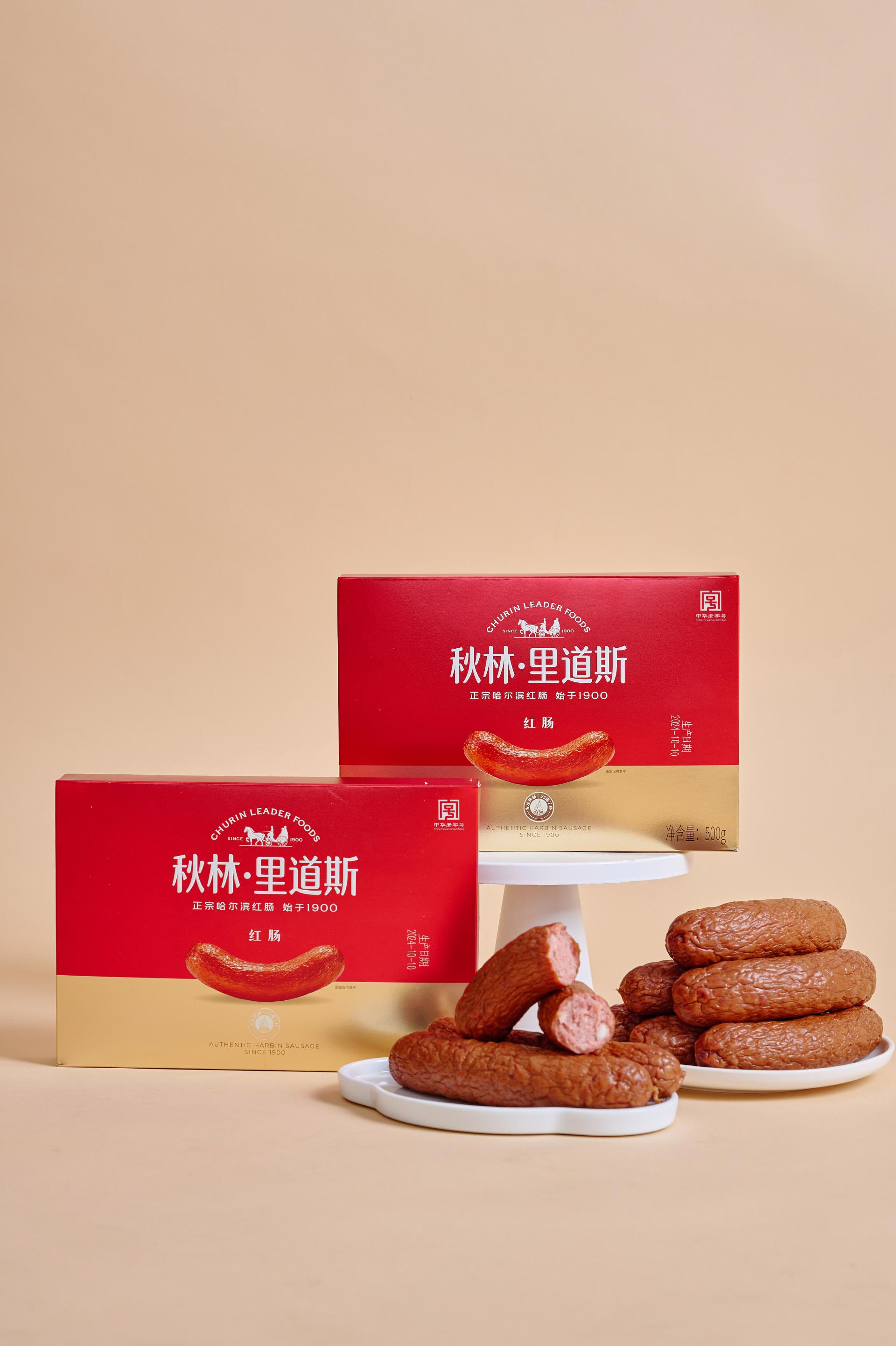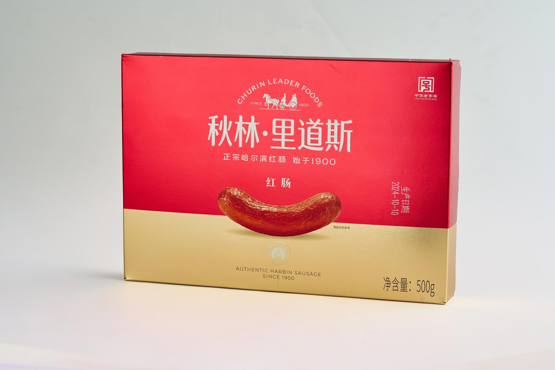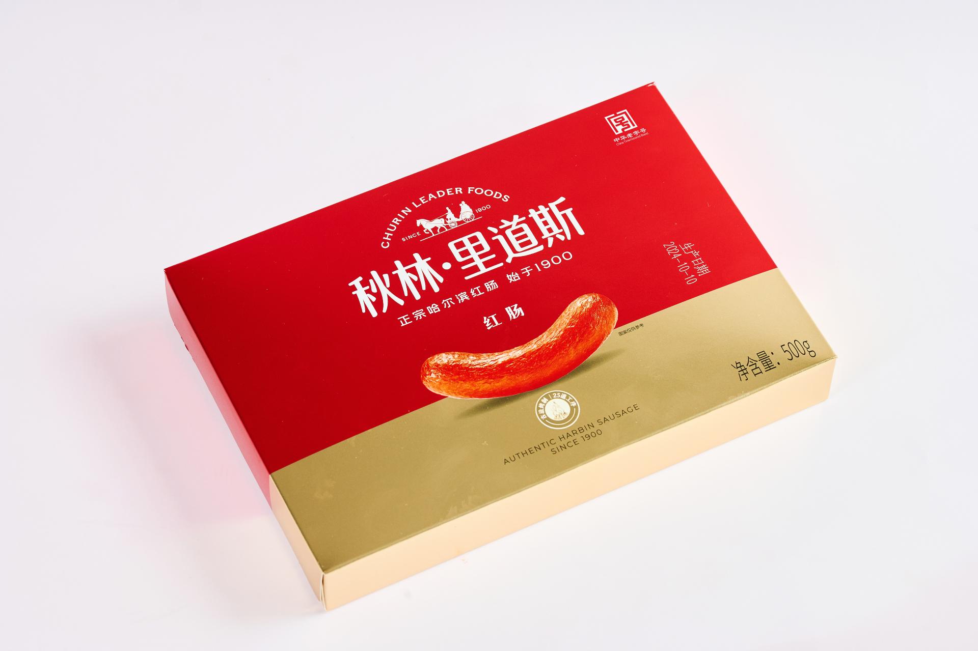 This packaging is newly designed for Churin Leaderfoods Red Sausage, rooted in the brand’s century-long heritage. Centered on “inheriting tradition with a fresh expression,” it establishes a visually compelling system that balances cultural depth with contemporary aesthetics, clearly conveying the brand’s promise of “authentic Harbin sausage, a century of quality.” The color strategy features a bold red and gold palette, creating a powerful and emotionally resonant visual identity. The red draws from the distinctive hue of sausages smoked with fruitwood, authentically representing the product while continuing Churin's visual legacy since 1900—symbolizing enduring craftsmanship and dedication to tradition. Gold signifies quality and the passage of time, reflecting the honored status and refined artisanship of a “China Time-Honored Brand,” adding a sense of prestige and luxury. Applied in the golden ratio, these colors enhance visual balance and shelf impact, creating a memorable brand impression. Graphic and layout design follow the modern “less is more” philosophy, using a minimalist structure to carry rich cultural narrative. Iconic brand elements—“Est. 1900,” “China Time-Honored Brand,” and “Harbin’s City Card”—are distilled into meaningful, time-weighted visual motifs seamlessly integrated into the composition. Rather than mere decoration, they serve as narrative threads, unfolding along the viewer’s visual journey to form a clear timeline from past to present. The focal point emphasizes the product itself, rendered in high-definition realism to highlight the sausage’s texture and luster, reinforcing category recognition and appetizing appeal. This tangible representation contrasts with abstract brand symbols, creating a dual expression of “concrete and abstract,” “material and spirit”—meeting immediate consumer recognition while evoking emotional connection and cultural resonance. Design language blends Russian-inspired symmetry with Chinese aesthetic principles of negative space, using deliberate emptiness to create visual breathing room. This ensures clear information hierarchy, allowing key messages to stand out with elegance and clarity.