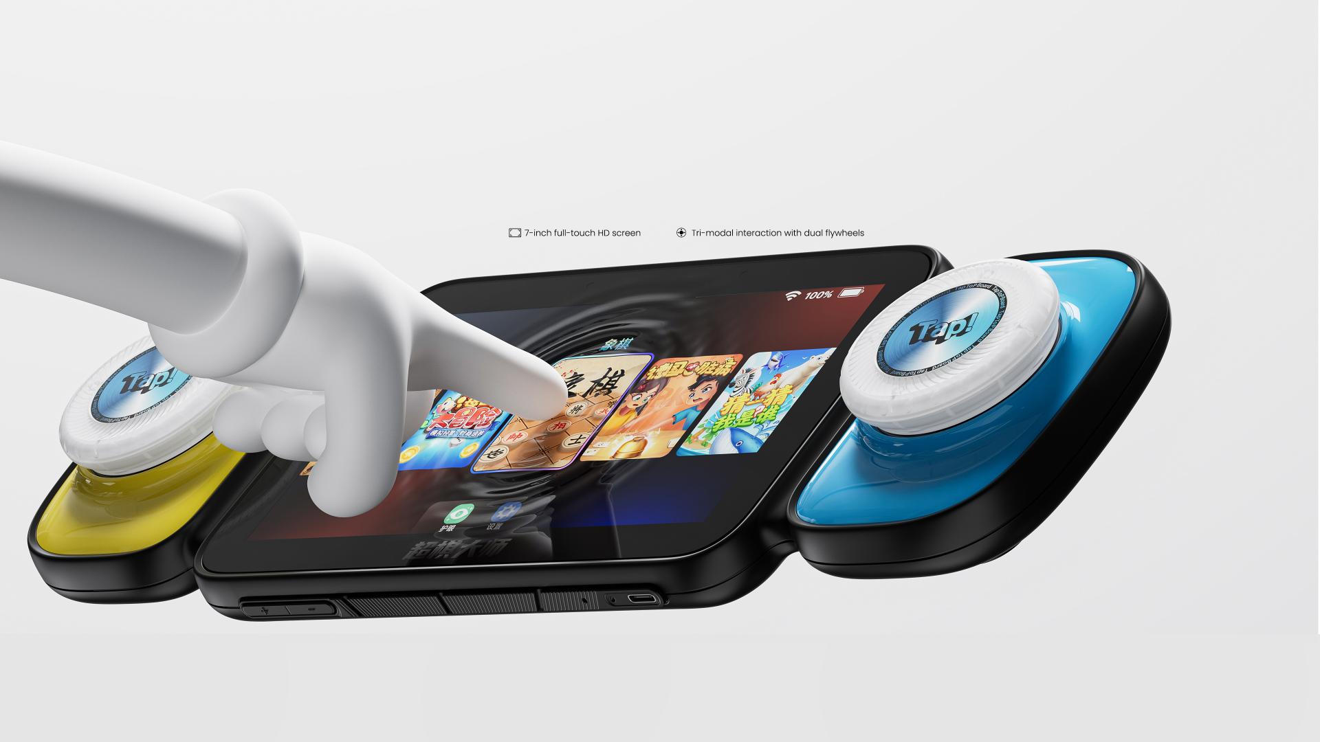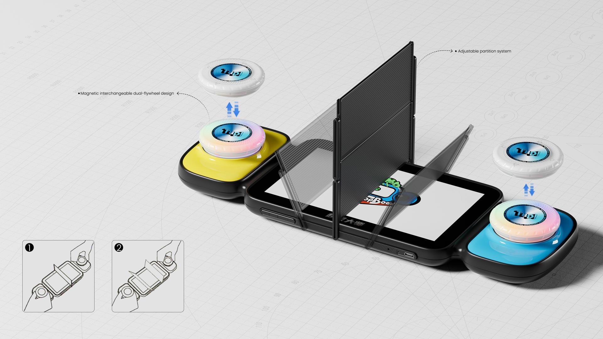 Super Chess Master All-in-One Smart Board Game is purpose-built for children aged 6 to 12, centered around the design philosophy of "Empowering Innocence, Unlimited Fun." It breaks the boundaries of traditional board games by integrating physical interaction with rich digital content, delivering an immersive play experience. Combining modular hardware and dynamic digital ecosystems, it meets cognitive game needs while inspiring collaboration and creativity, setting a new benchmark in children’s smart toys. The core concept, "Empowering Innocence, Unlimited Fun," targets young users by abandoning traditional unified forms in favor of modularity. It emphasizes strategic gameplay and social interaction to foster exploration and collaboration. Inspired by the emotional resonance of traditional face-to-face board games, the intuitive interactivity of children's toys, and the visual phenomena of natural spinning light and color, the design combines modern technology to create an immersive play space. The core magnetic flywheel interaction system functions as a rotational speed controller, tap button, and identity recognition module, seamlessly linking physical motion with RGB visual feedback. Supporting third-party creations, the flywheel expands gameplay and personalization. The dynamic adjustable partition system uses magnetic storage to enable various battle and cooperative scenarios, enhancing gameplay diversity and immersive experience. The design emphasizes minimalist operation, combining rotational flywheel, tap buttons, and touchscreen controls, enabling intuitive use without manuals, aligning with children’s exploratory nature. Safe and skin-friendly with a matte fine-grain anti-slip surface, the modular design allows easy replacement and expansion. It supports “learning through play,” “enhanced interaction,” and “creative co-creation,” fostering cognitive development and emotional bonds. Featuring a streamlined elongated layout with smooth rounded contours for comfortable child handling, the overall aesthetic is clean and approachable. The flywheel base boasts bright colors, the screen edges are gently curved to blend with the body, and the magnetic recessed cover for partition storage combines beauty with ease of use. The color strategy balances a calm base tone with lively interactive zones, while the matte finish minimizes fingerprints and smudges, combining eco-friendliness with user comfort. The product empowers children’s cognitive and social growth while pioneering a new paradigm for smart children’s board games.