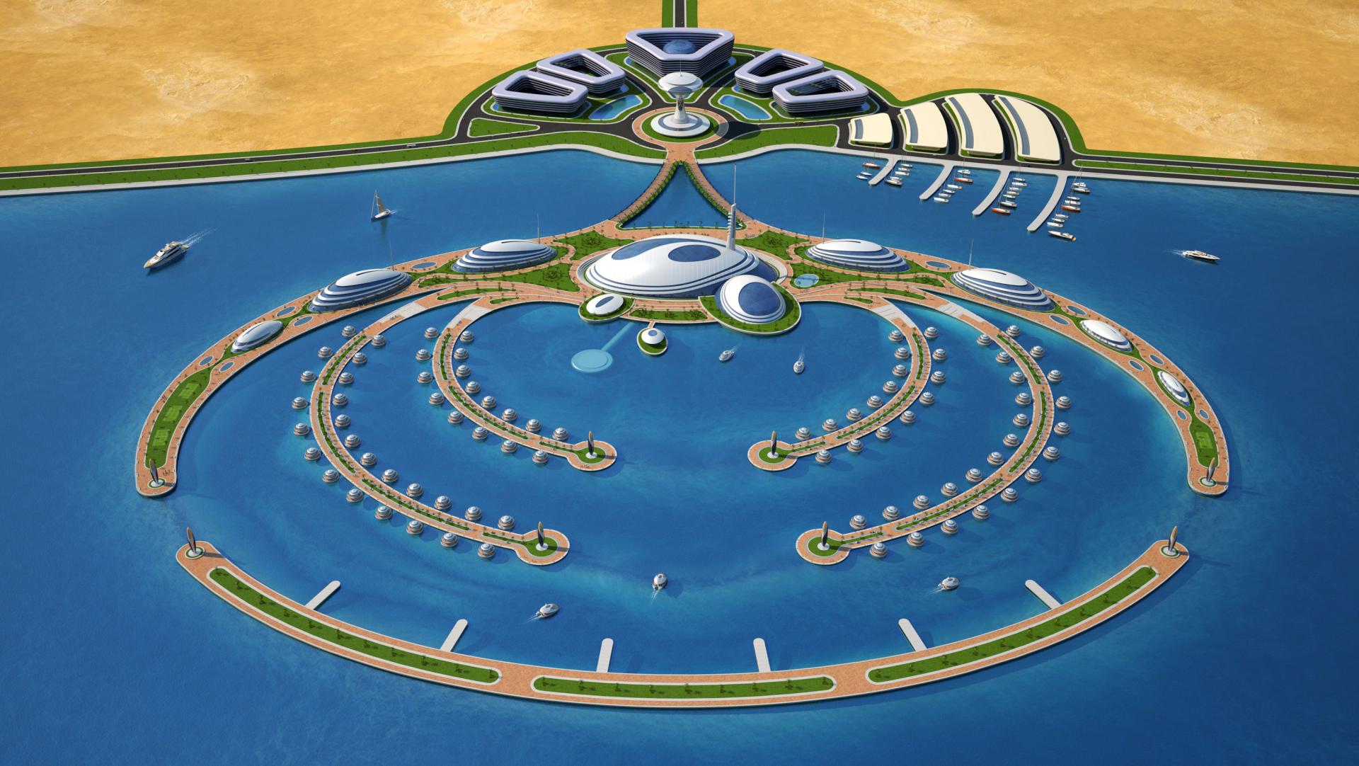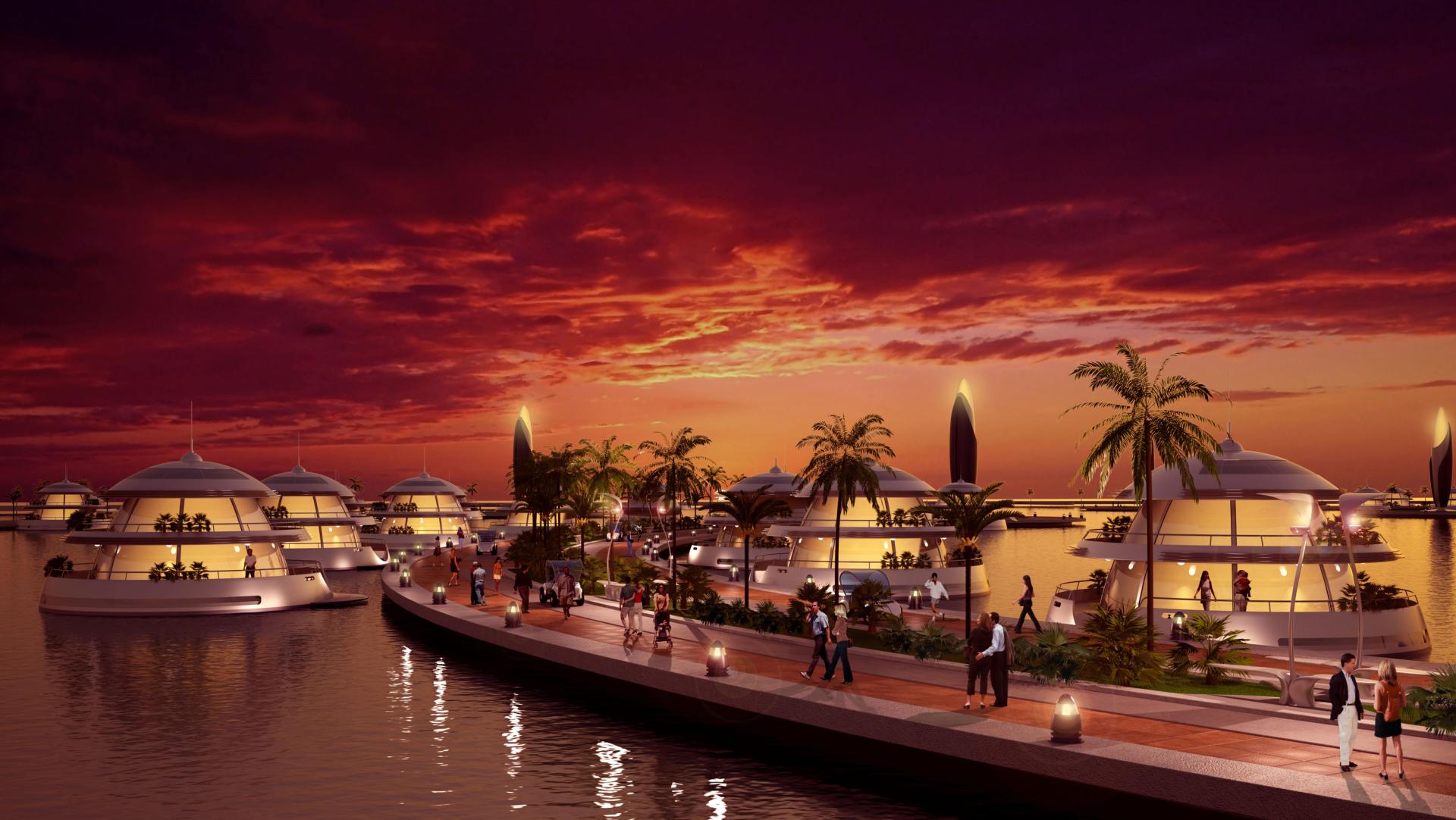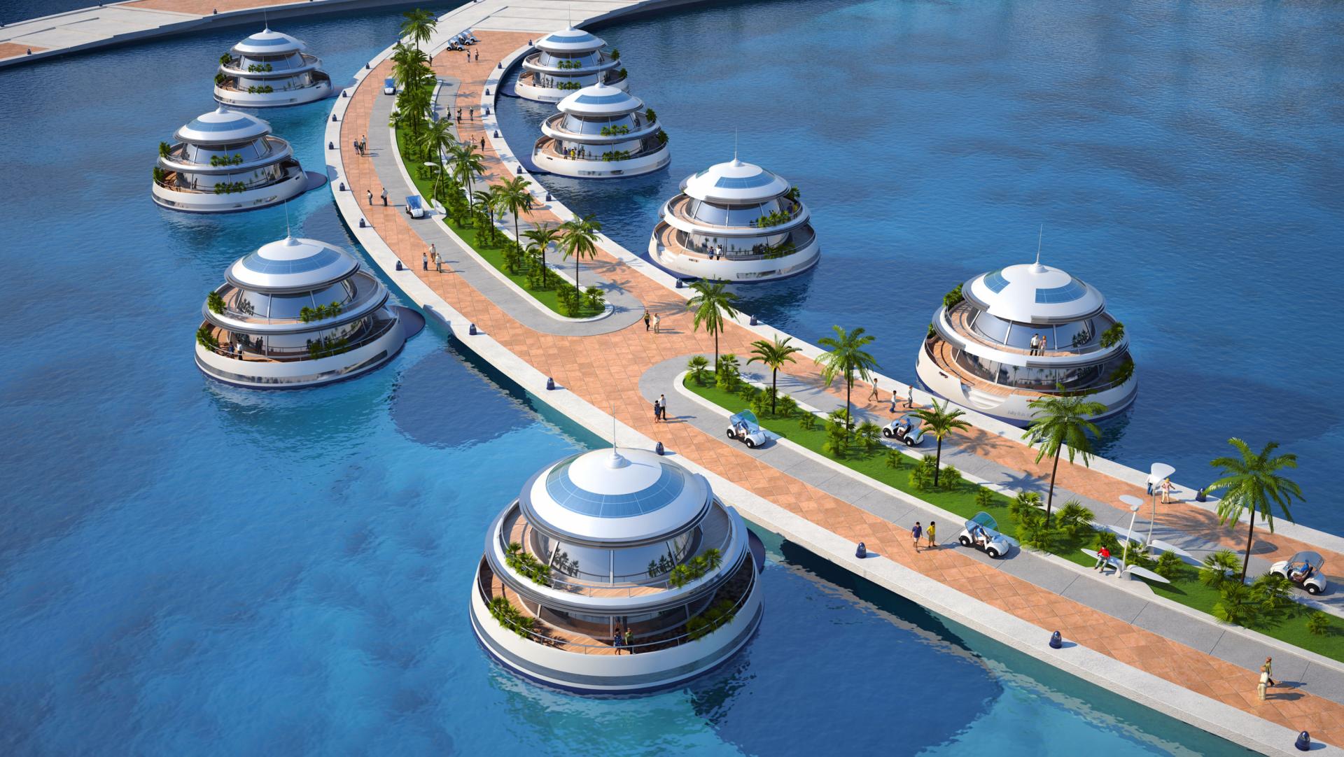This innovative project is the first eco-sustainable luxury semisubmerged hotel resort with floating suites. Its is called Amphibious like a big aquatic animal stretching out from the land into the sea and extends horizontally for 1km thanks to two long wide arms. The whole architecture is floating, to adapt to increase of the sea levels, and also energy self-sufficient, using hydrogen and renewable energy systems and reducing the energy consumption for air conditioning through the use of natural microventilation systems.
