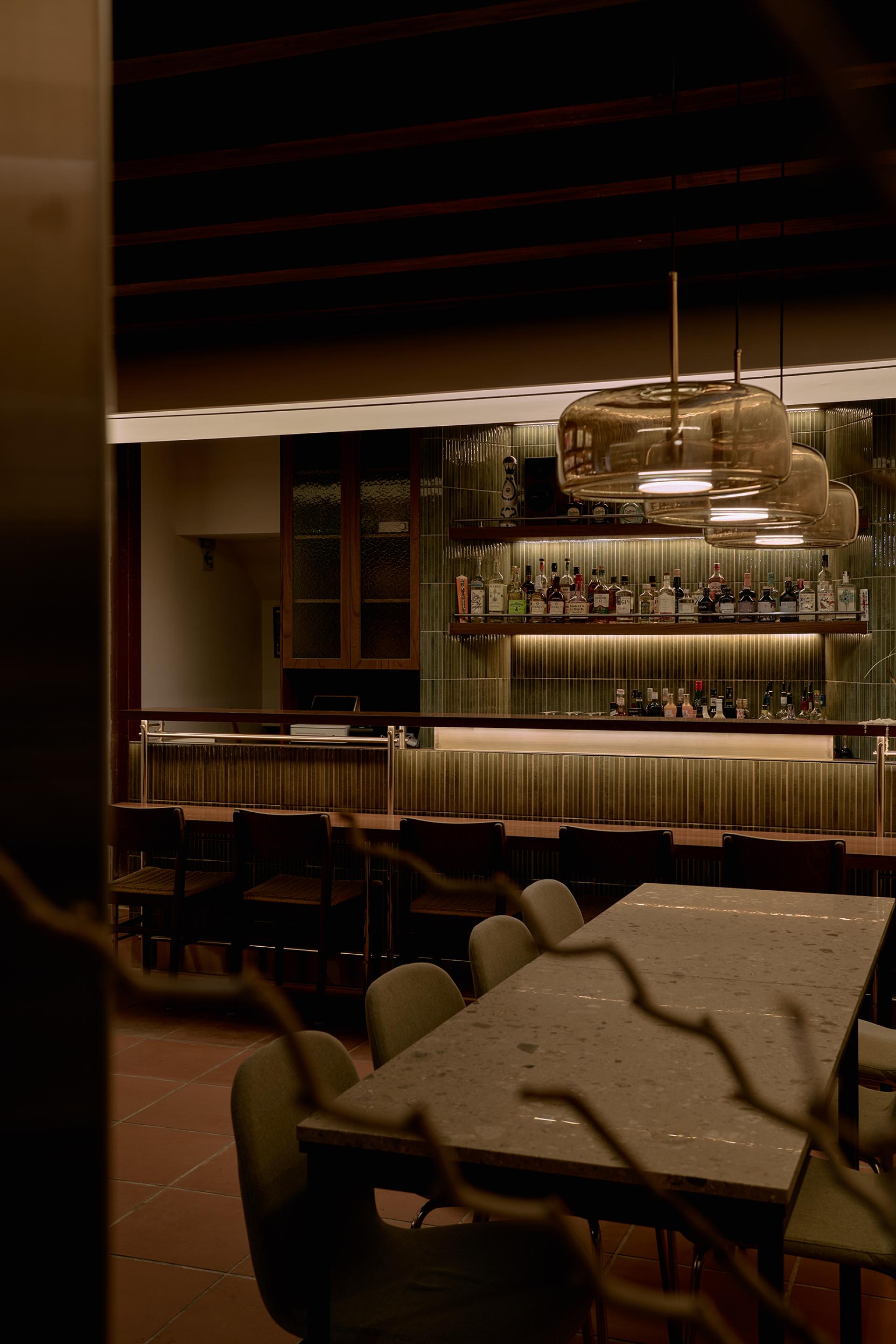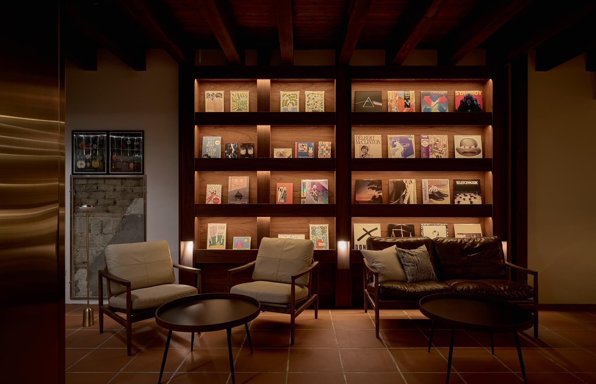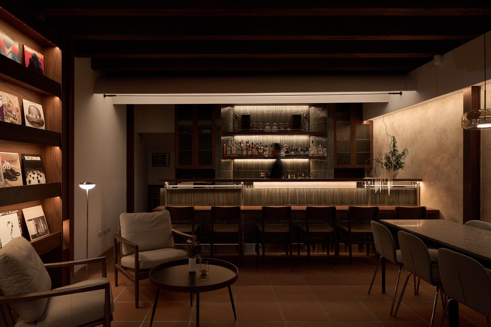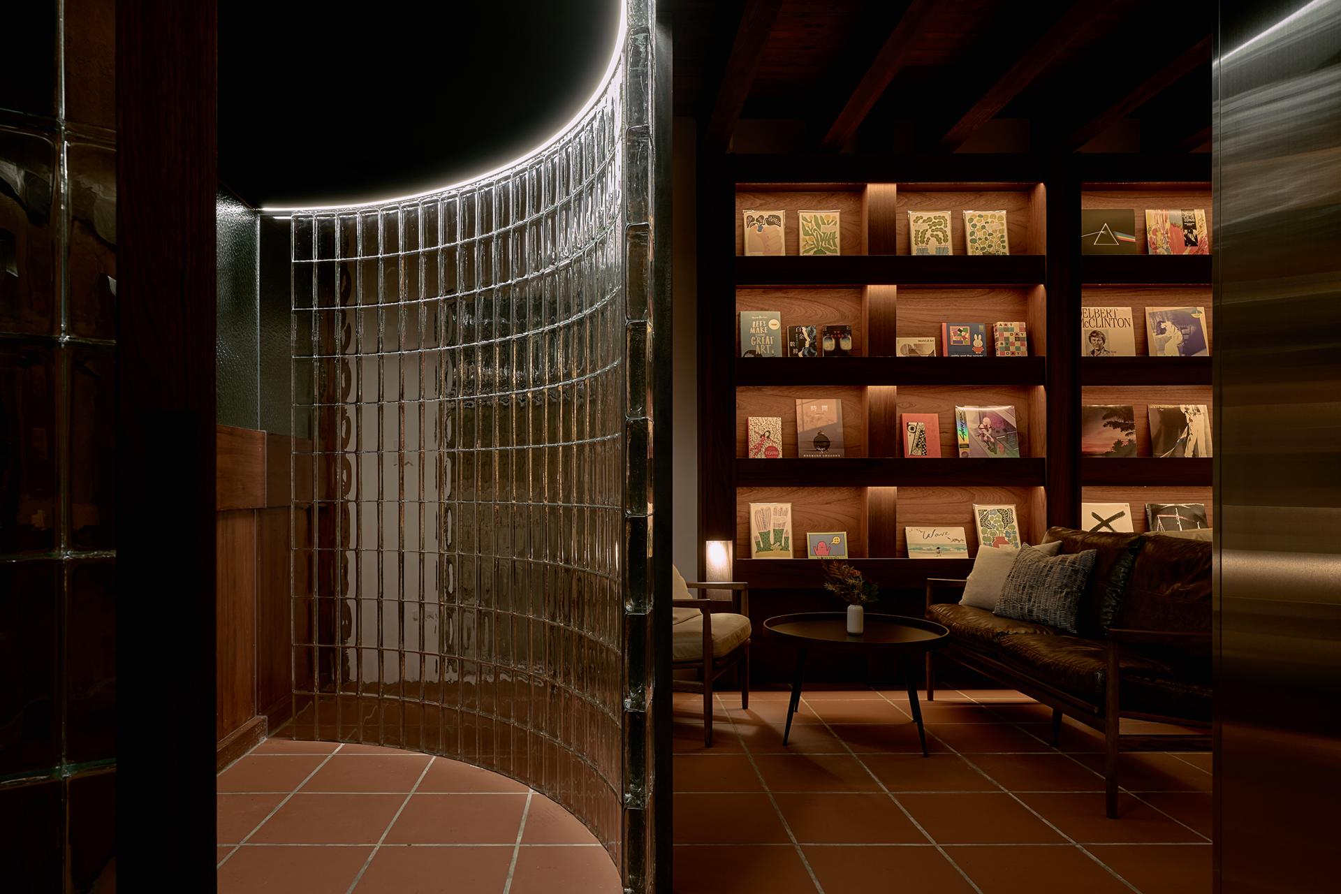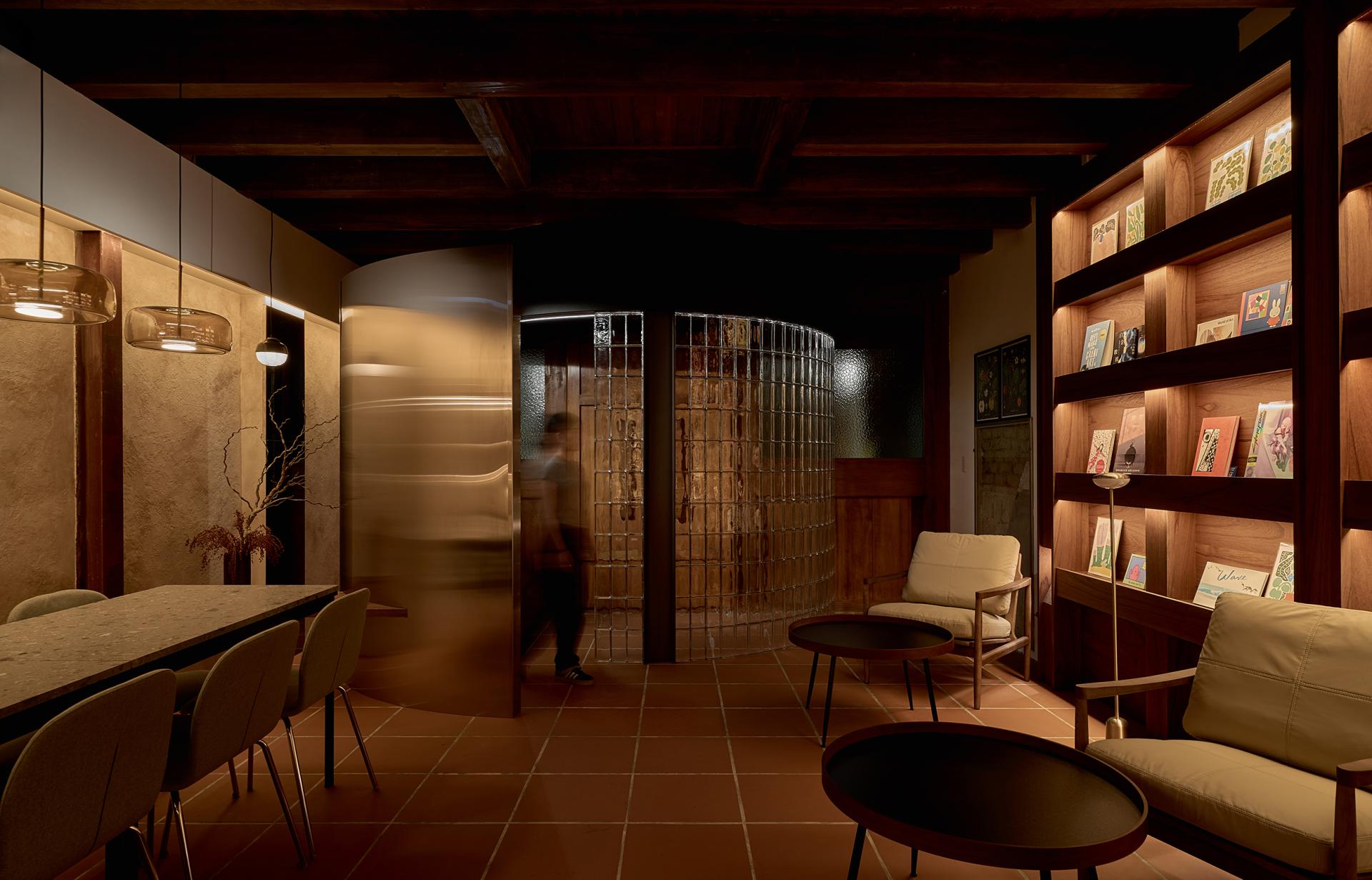 Though only 62.8 square meters, curved ceilings and concealed lighting extend visual depth, while flooring materials and stained wood veneer echo the building’s historic fabric, crafting intimacy without oppression. By night, the façade glows with light, inviting people to pause, converse, and continue the unfolding stories of the old city.