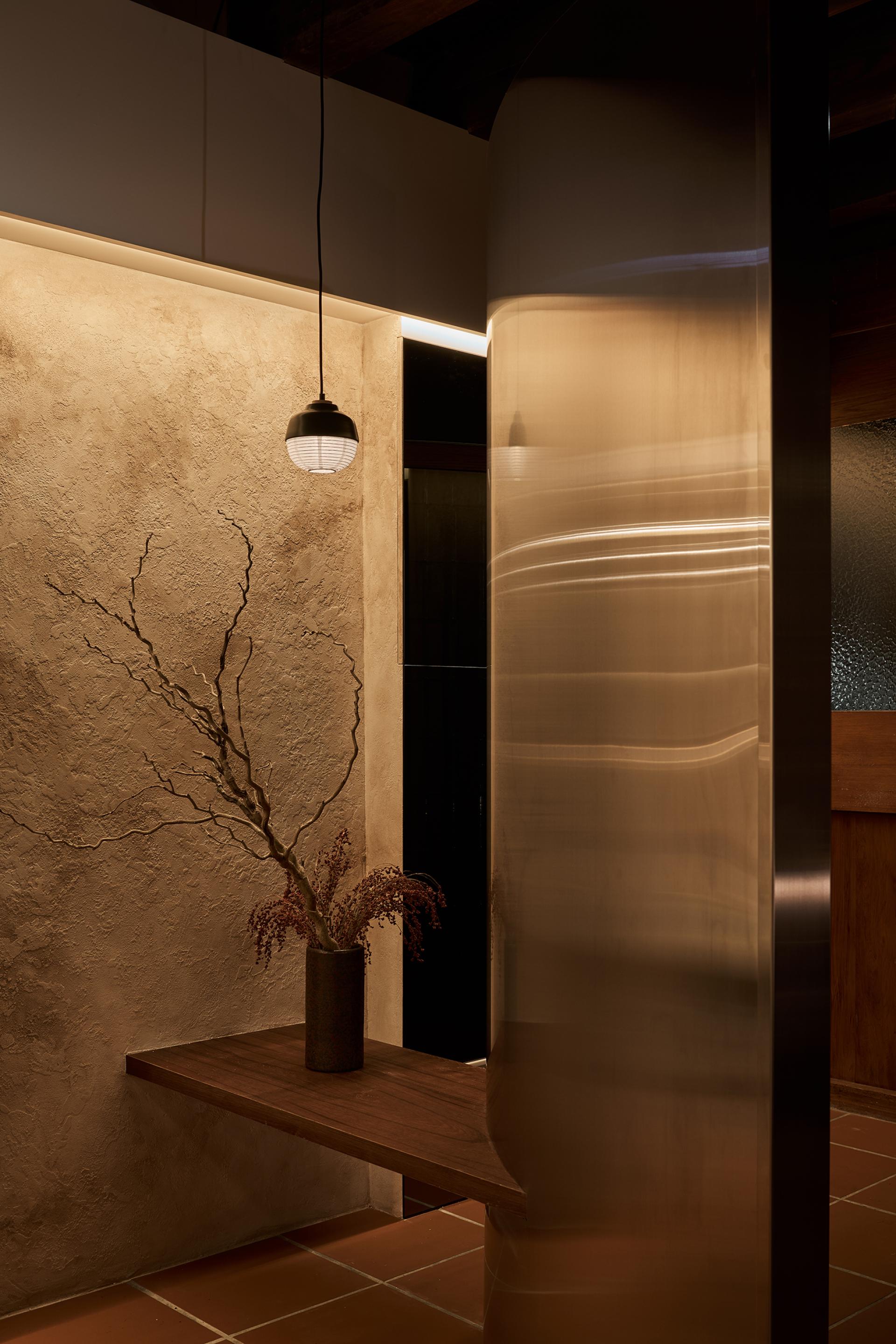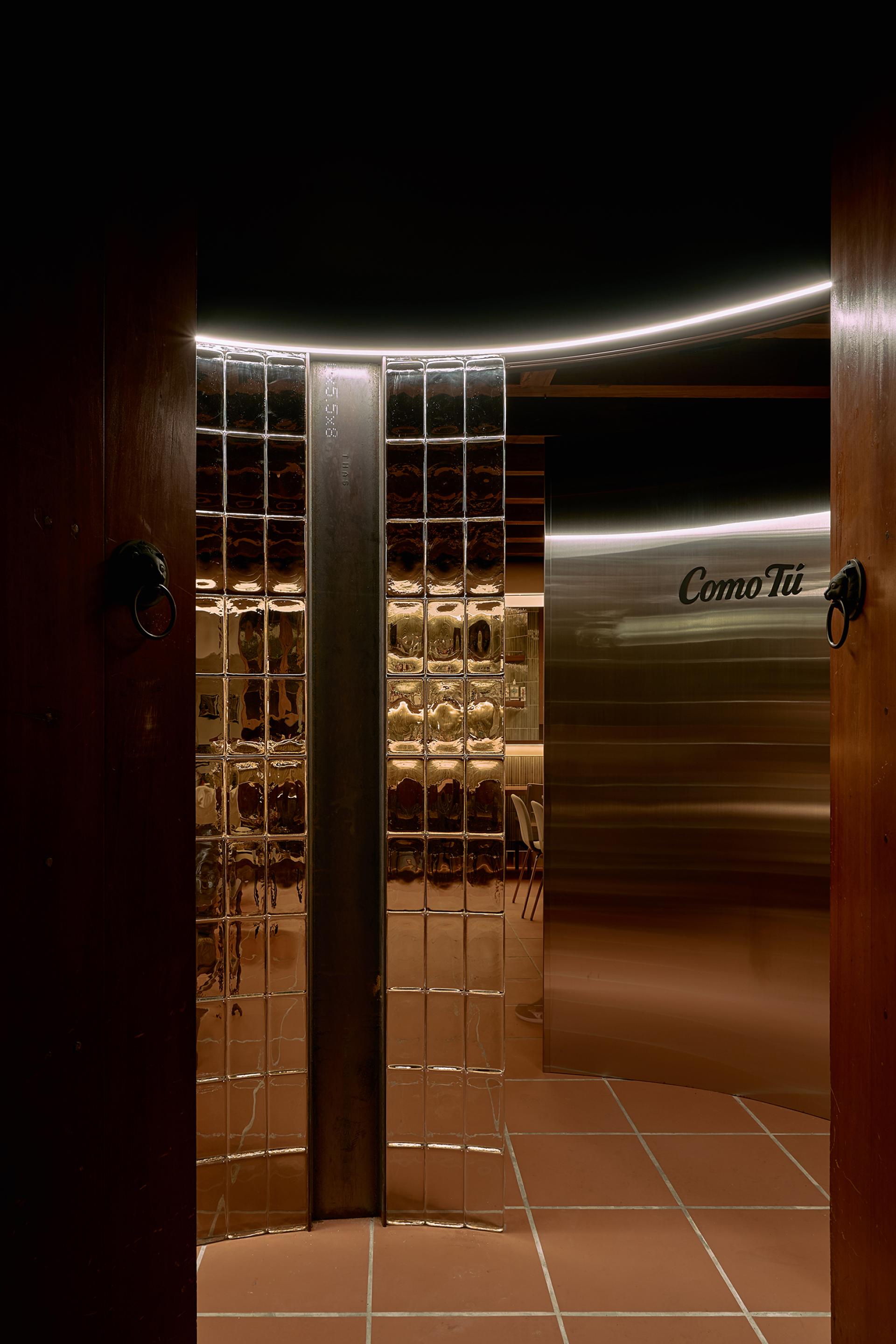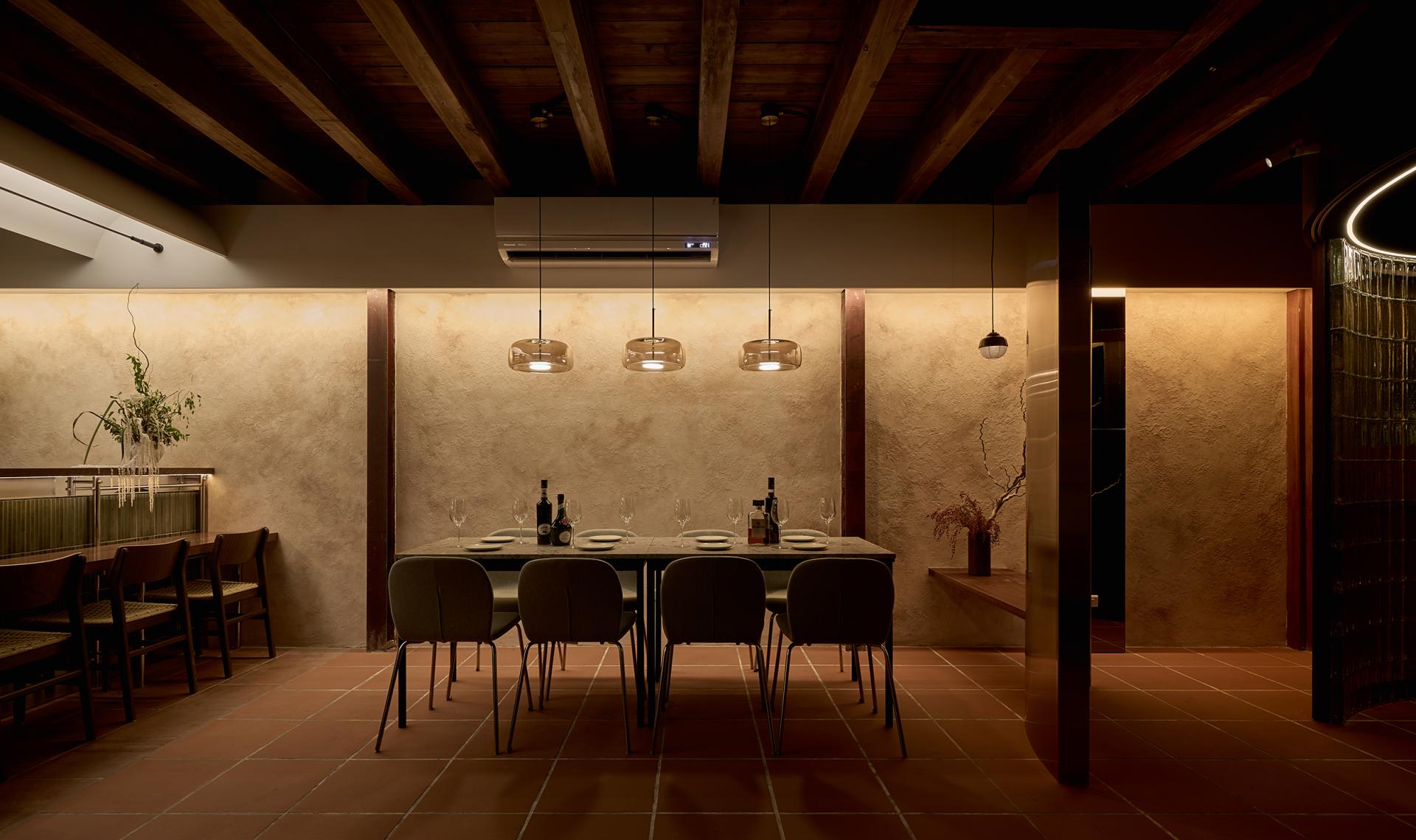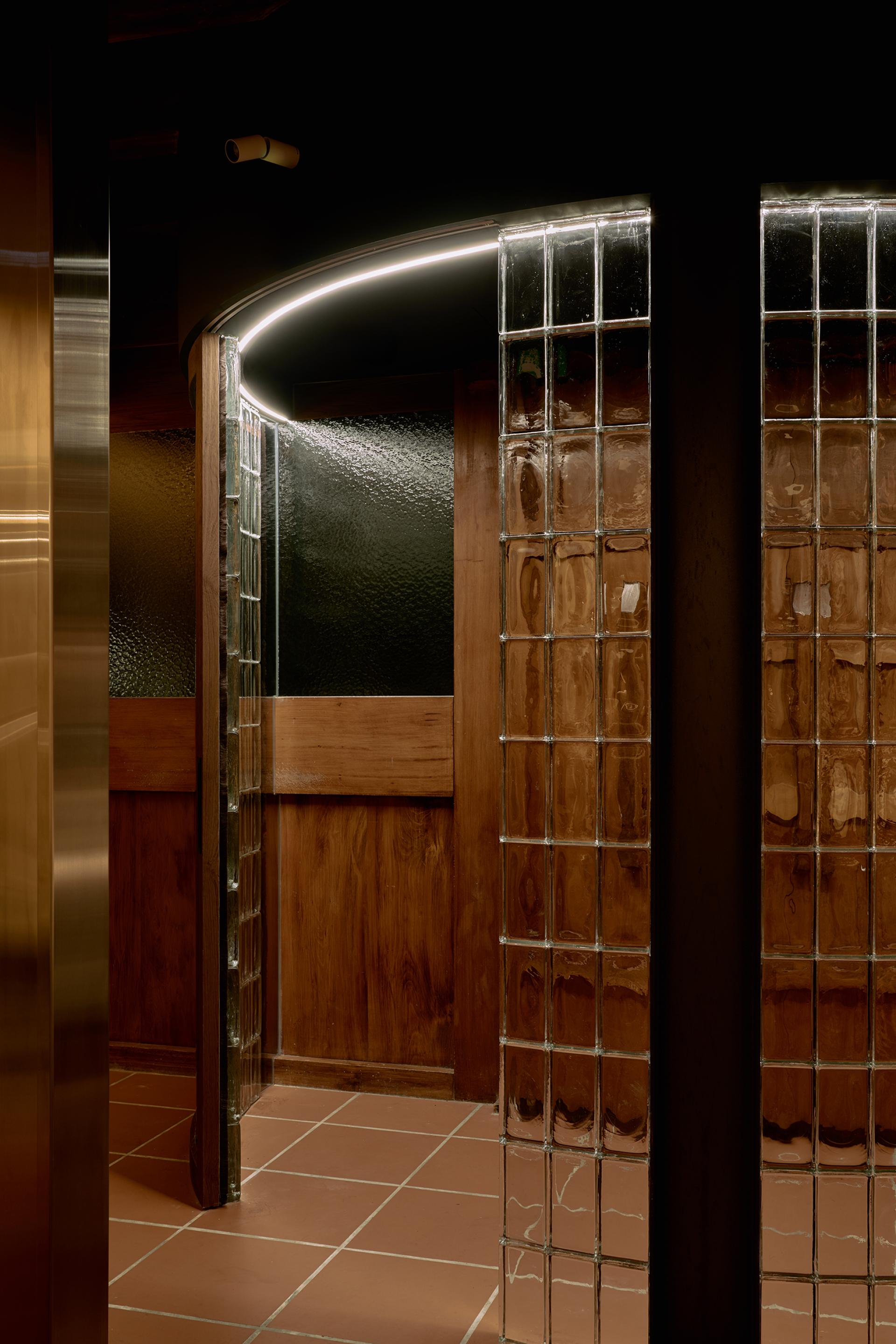 The design’s highlight is the curved glass-brick façade, refracting layered light by day and becoming a beacon by night, balancing privacy and openness. The bar counter combines dark green tiles with stainless steel tubing, structuring zones for work, service, and seating with lightness and beauty. The preserved I-beam and special-coated walls together staged a dialogue between history and modernity.