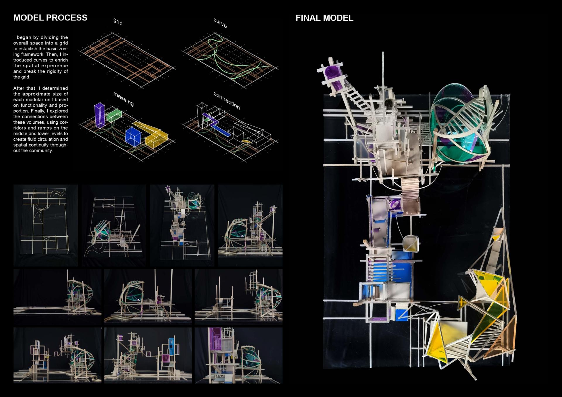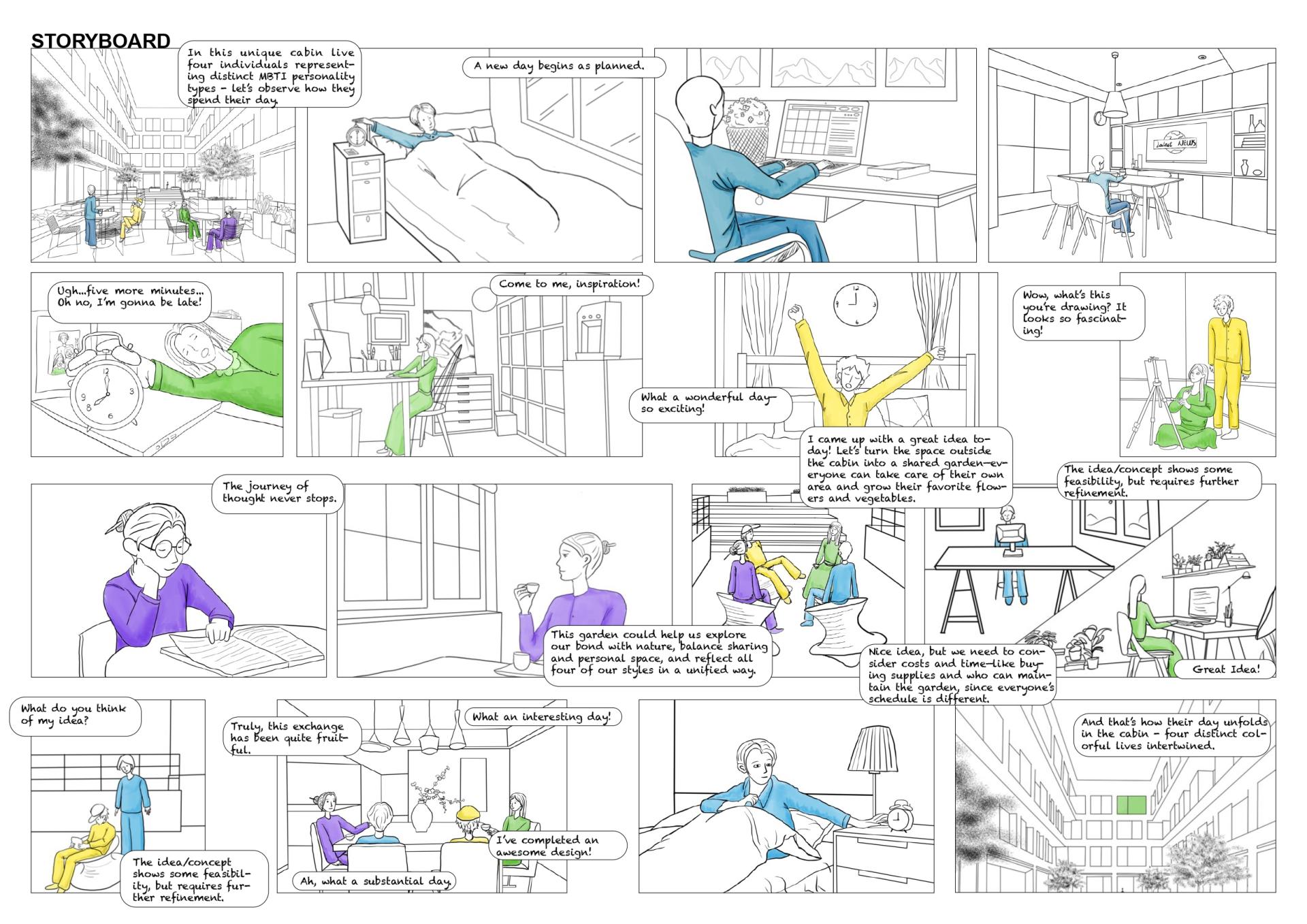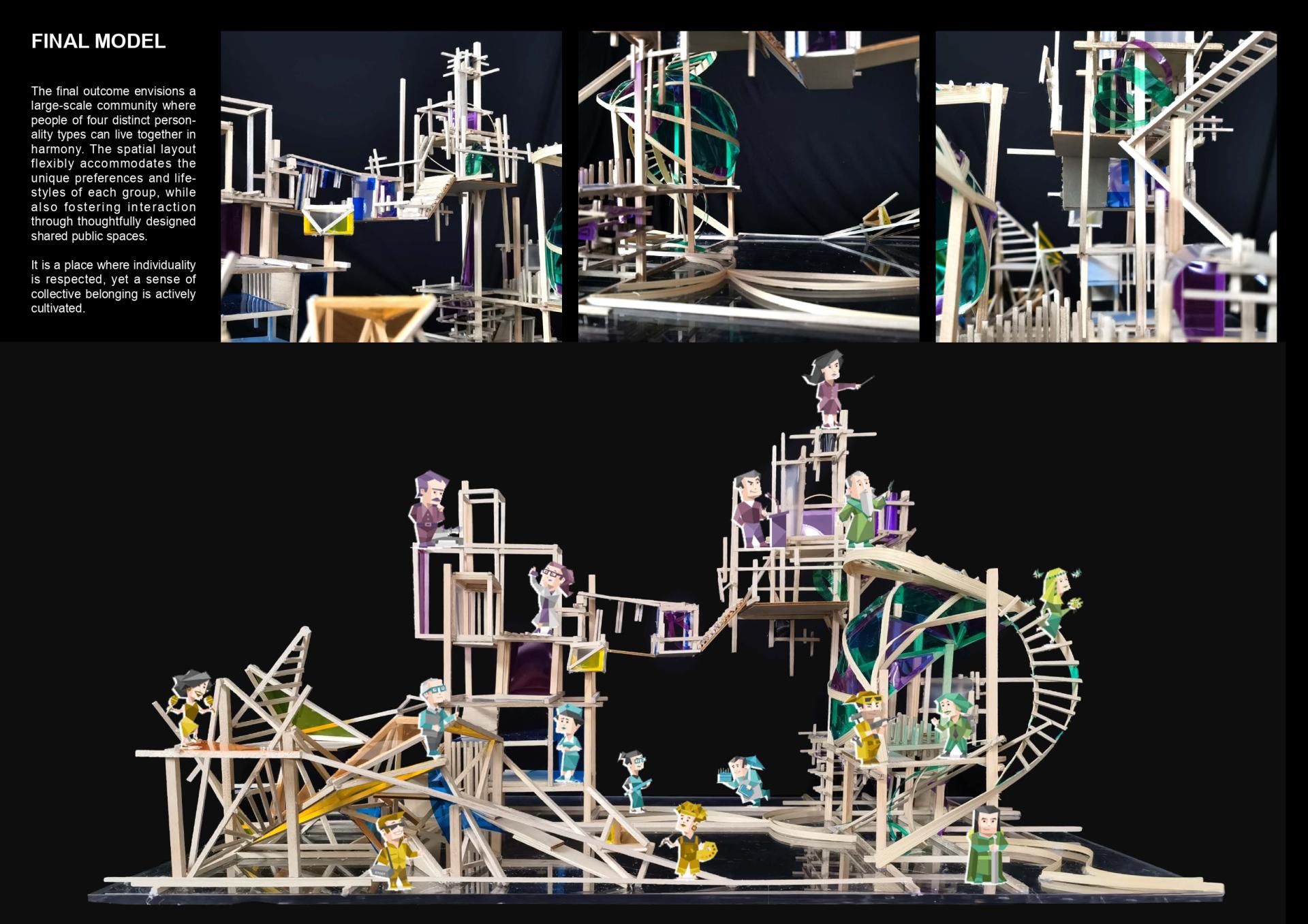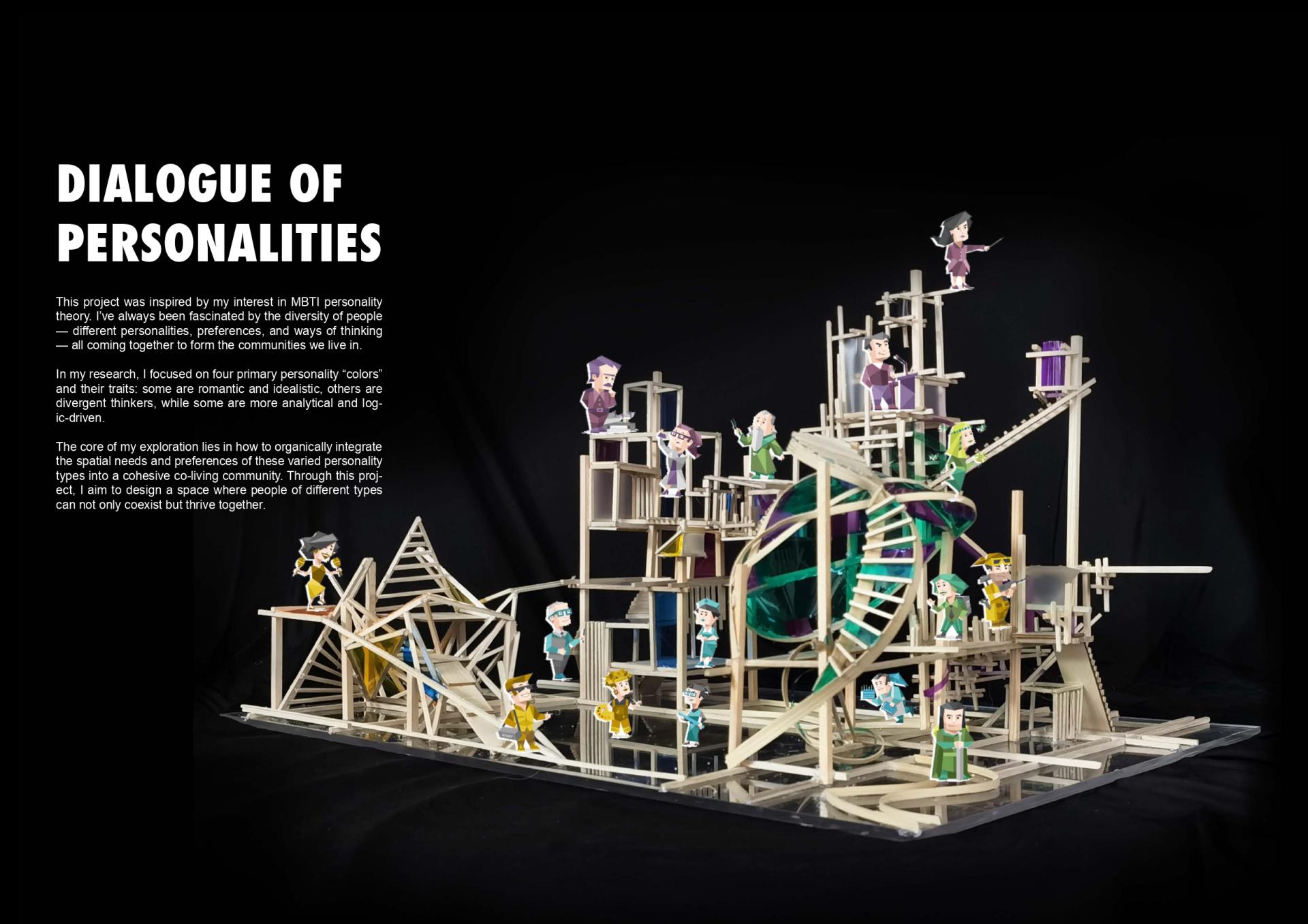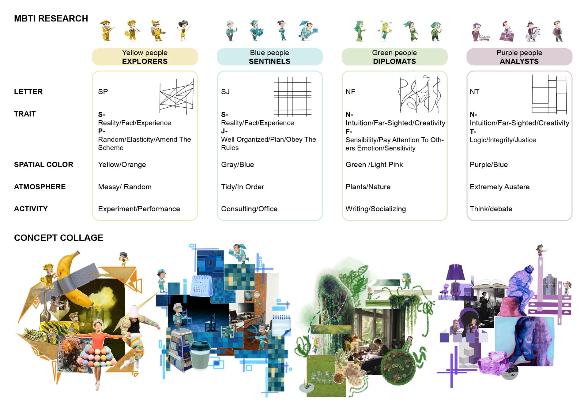 The core of my exploration lies in how to organically integrate the spatial needs and preferences of these varied personality types into a cohesive co-living community. Through this proj- ect, I aim to design a space where people of different types can not only coexist but thrive together.