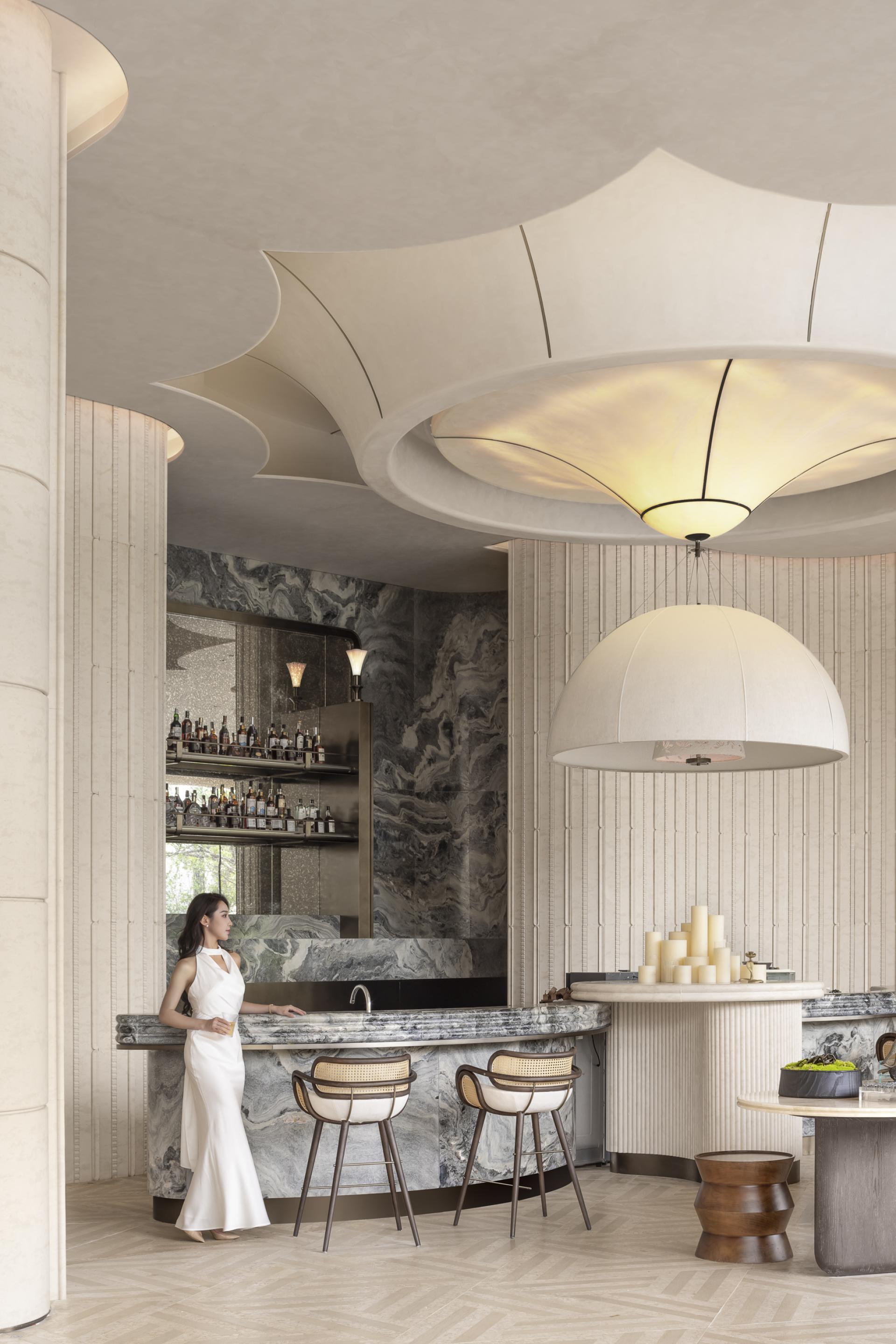 Upon entering the space, the magnolia chandeliers suspended from the dome ceiling are crafted from metal and translucent hard membranes, blooming in elegance, while the ground is adorned with flickering flower shadows like dewdrops at dawn. Abstract magnolia wall lamps and bamboo flower stands engage in dialogue, blending strength and grace to interpret the Lingnan elegance of ‘abundance and prosperity.’ Along the viewing route, elements such as lion dance culture and tea ceremonies unfold gradually, while scenes like the book bar and courtyard transform traditional imagery into contemporary experiences.