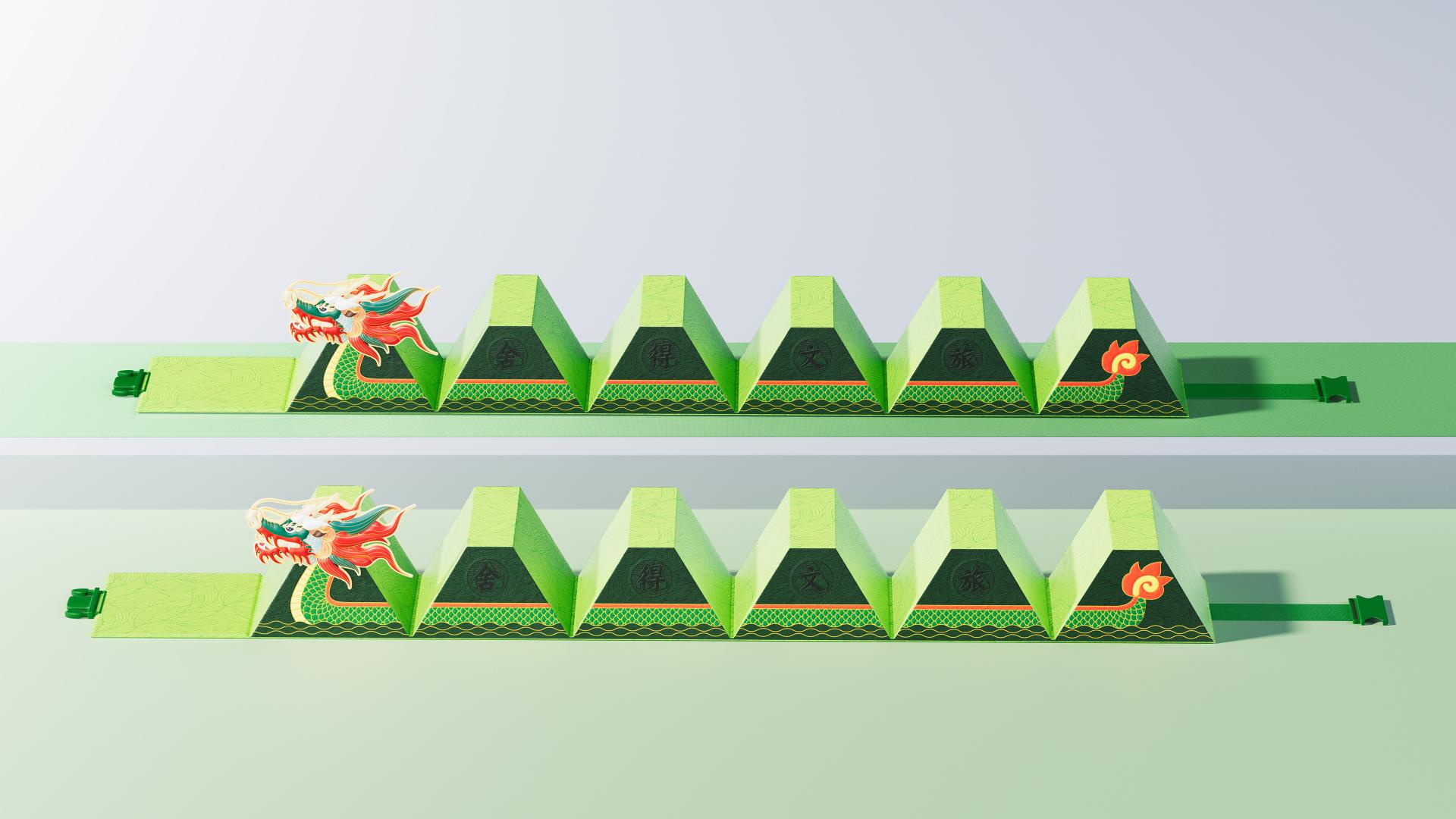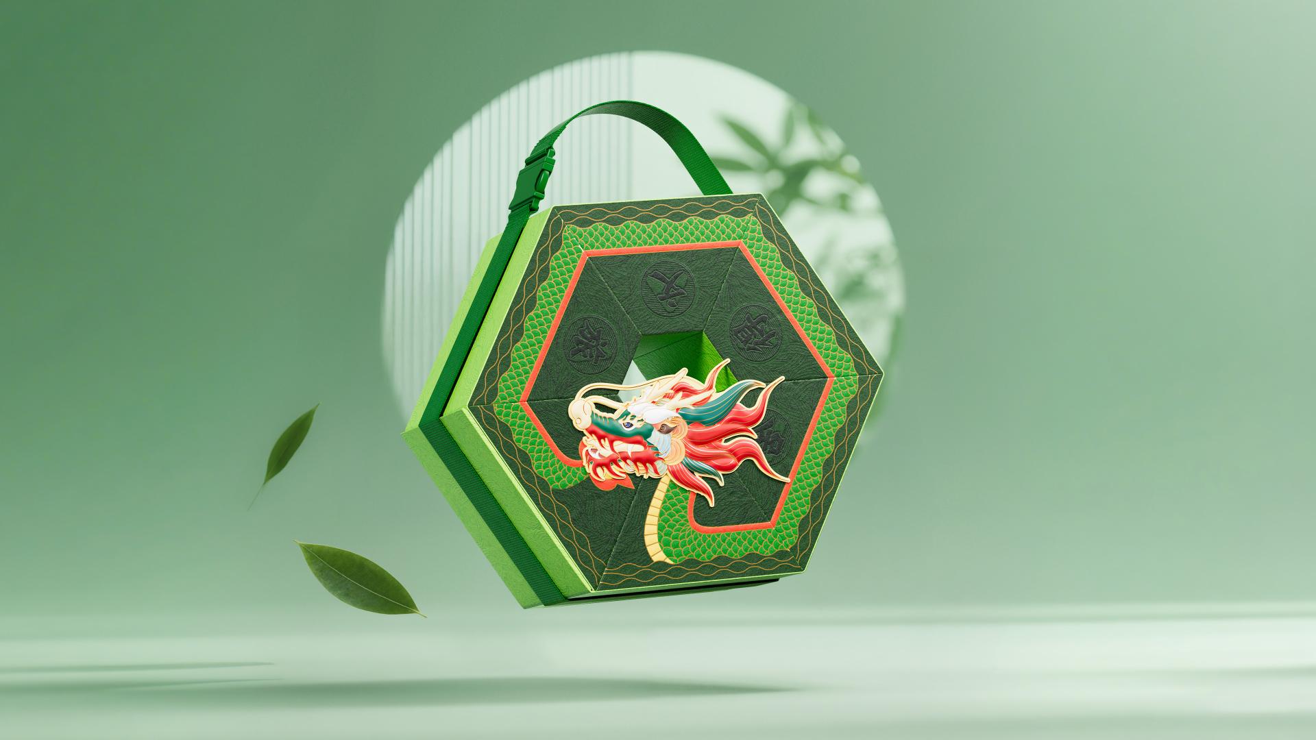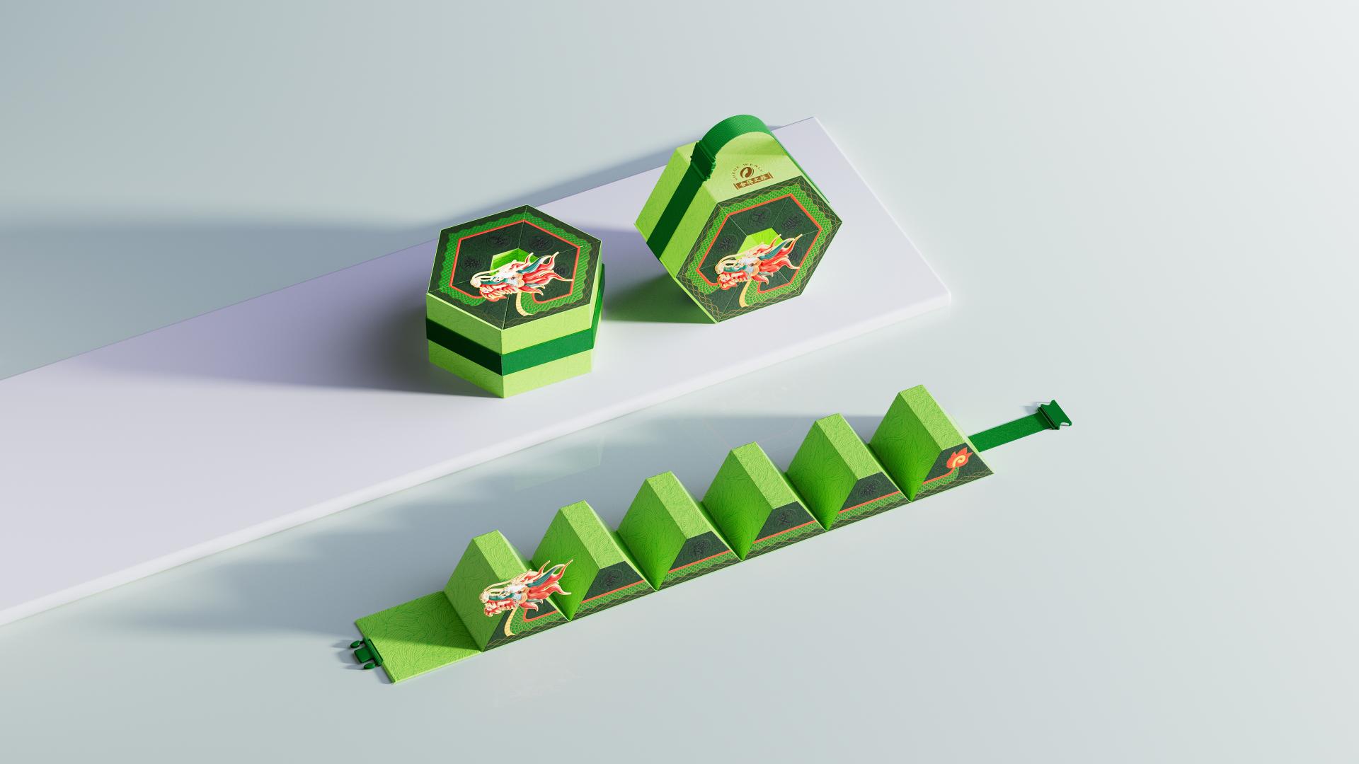 In the lush vibrancy of midsummer, this gift box transforms a boat into a loong, carrying with it the bounty of nature and the brilliance of culture. Its design takes the form of a dragon boat, feels the pulse of the seasons, and is imbued with the spirit of ritual. It condenses a thousand years of the Dragon Boat Festival's sentiment into a dual feast for the eyes and the soul. Each zongzi is not merely a legacy of flavor, but a rebirth of the Eastern spirit. The overall form is inspired by the phrase from the I Ching's Qian hexagram, "to ride six loongs at the proper times and drive through the heavens." The structure, assembled from six beveled hexagonal modules, creates the dynamic shape of a dragon boat cleaving through waves. Upon opening, the gift box becomes a coiling loong, its boat-like form spreading its wings. The beauty of the seasons leaps forth, like a timeless ceremony flowing from a thousand years past. The gift box features a transformable, three-dimensional structure. The loong's head, crafted through 3D embossing and outlined with cold-stamped gold foil, is rendered with vivid clarity and spirit. The opening process is like a "dragon boat unloading its grain," a layered unfolding that immerses you, awakening the deep sense of ceremony and childhood memories of the festival. The main body is made of a deep green, matte-finished paperboard, textured with an embossed wave pattern, conveying a reserved and steady elegance. Partially hidden cold-stamped gold lines suggest the form of loong scales, which shimmer and shift in the light like glistening ripples or the subtle breath of a loong, revealing an extraordinary artistic quality and seasonal spirit in its understated design. The hexagonal modules can be cleverly disassembled and reassembled, significantly reducing their volume for transportation and adapting to various display and reuse scenarios. This innovative structure not only reduces its carbon footprint but also adds practical value. Once opened, the gift box transforms into a decorative piece for a desk or shelf, extending the festive atmosphere and giving the packaging an aesthetic and functional life.