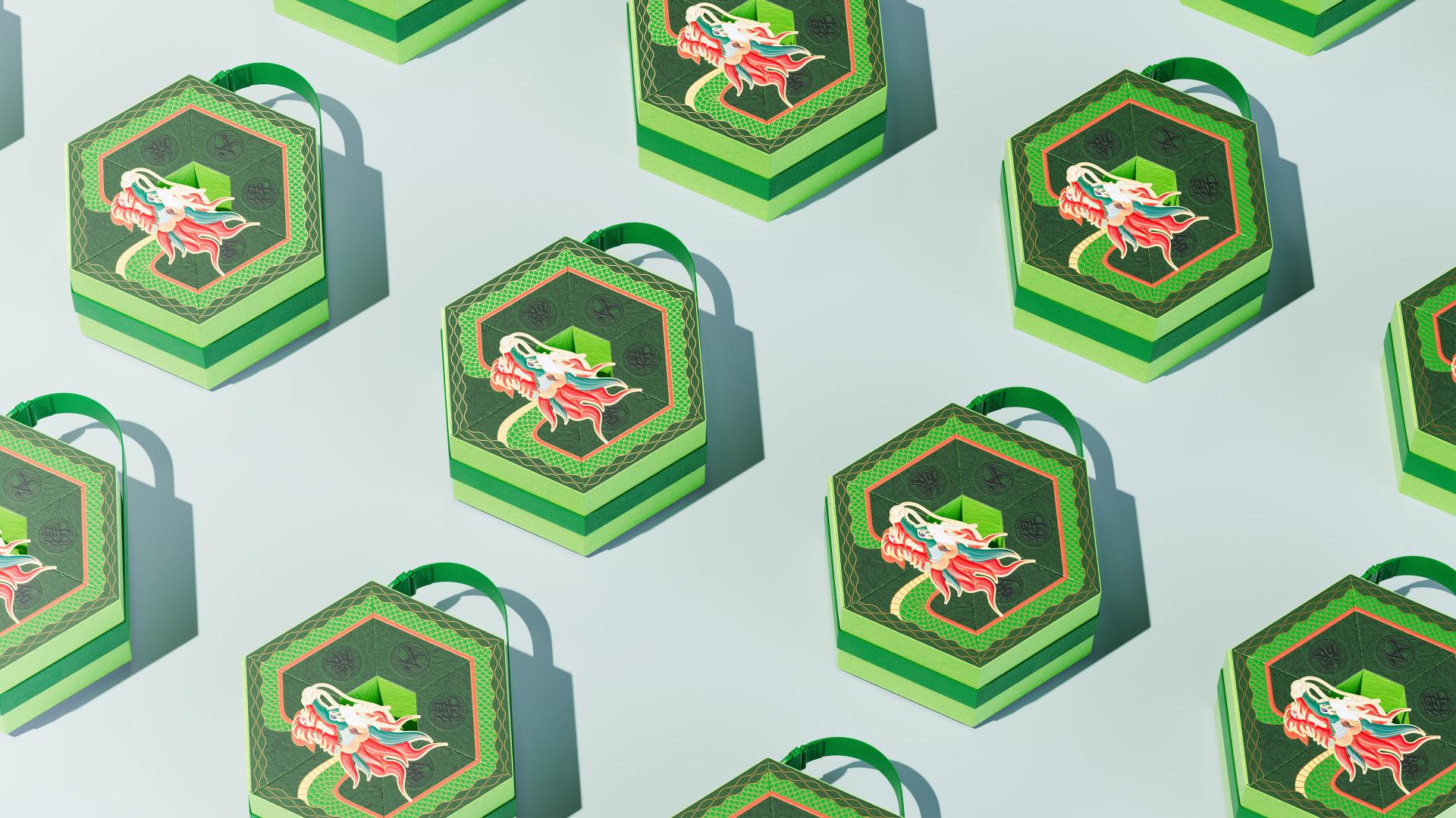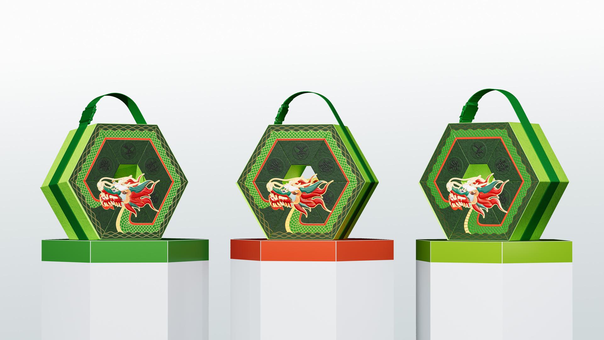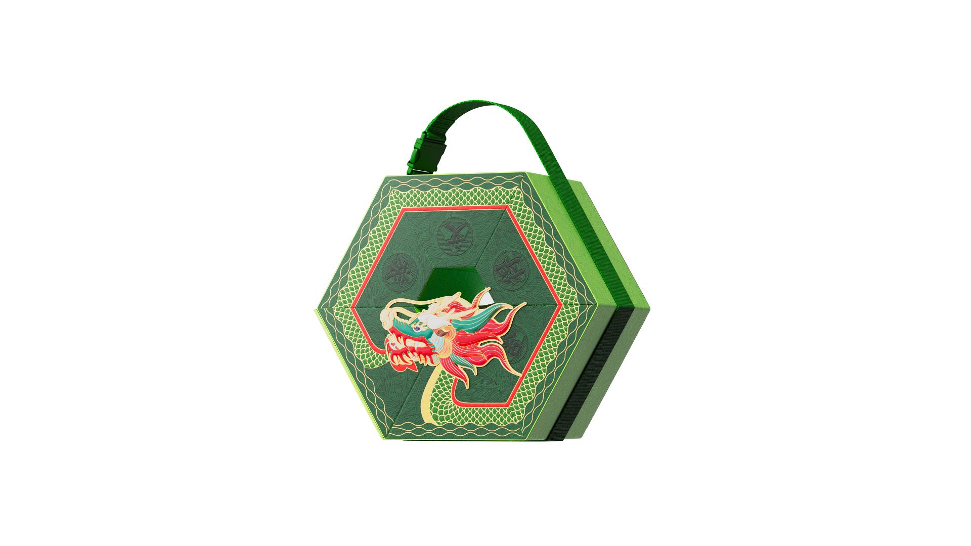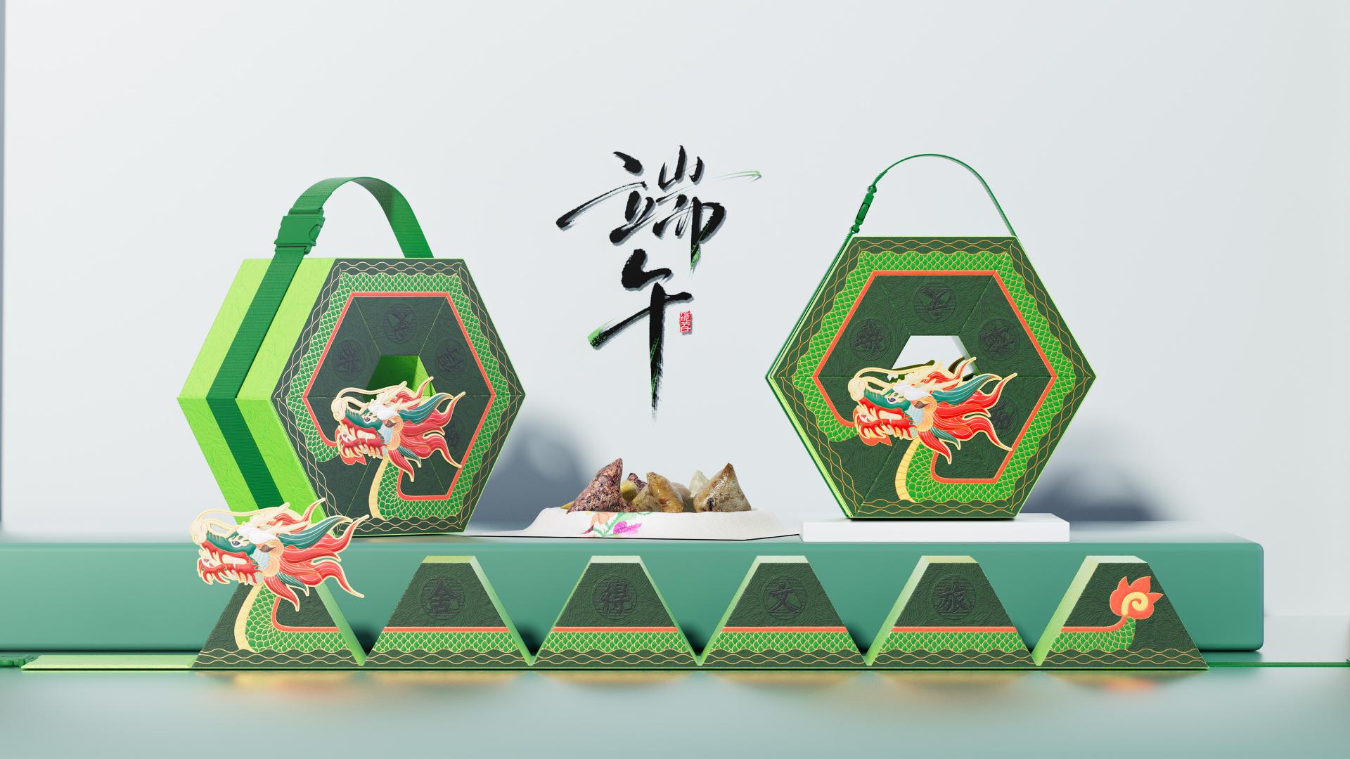In the lush vibrancy of midsummer, this gift box transforms a boat into a loong, carrying with it the bounty of nature and the brilliance of culture. Its design takes the form of a dragon boat, feels the pulse of the seasons, and is imbued with the spirit of ritual. It condenses a thousand years of the Dragon Boat Festival's sentiment into a dual feast for the eyes and the soul. Each zongzi is not merely a legacy of flavor, but a rebirth of the Eastern spirit. The overall form is inspired by the phrase from the I Ching's Qian hexagram, "to ride six loongs at the proper times and drive through the heavens." The structure, assembled from six beveled hexagonal modules, creates the dynamic shape of a dragon boat cleaving through waves. Upon opening, the gift box becomes a coiling loong, its boat-like form spreading its wings. The beauty of the seasons leaps forth, like a timeless ceremony flowing from a thousand years past. The gift box features a transformable, three-dimensional structure. The loong's head, crafted through 3D embossing and outlined with cold-stamped gold foil, is rendered with vivid clarity and spirit. The opening process is like a "dragon boat unloading its grain," a layered unfolding that immerses you, awakening the deep sense of ceremony and childhood memories of the festival. The main body is made of a deep green, matte-finished paperboard, textured with an embossed wave pattern, conveying a reserved and steady elegance. Partially hidden cold-stamped gold lines suggest the form of loong scales, which shimmer and shift in the light like glistening ripples or the subtle breath of a loong, revealing an extraordinary artistic quality and seasonal spirit in its understated design. The hexagonal modules can be cleverly disassembled and reassembled, significantly reducing their volume for transportation and adapting to various display and reuse scenarios. This innovative structure not only reduces its carbon footprint but also adds practical value. Once opened, the gift box transforms into a decorative piece for a desk or shelf, extending the festive atmosphere and giving the packaging an aesthetic and functional life.