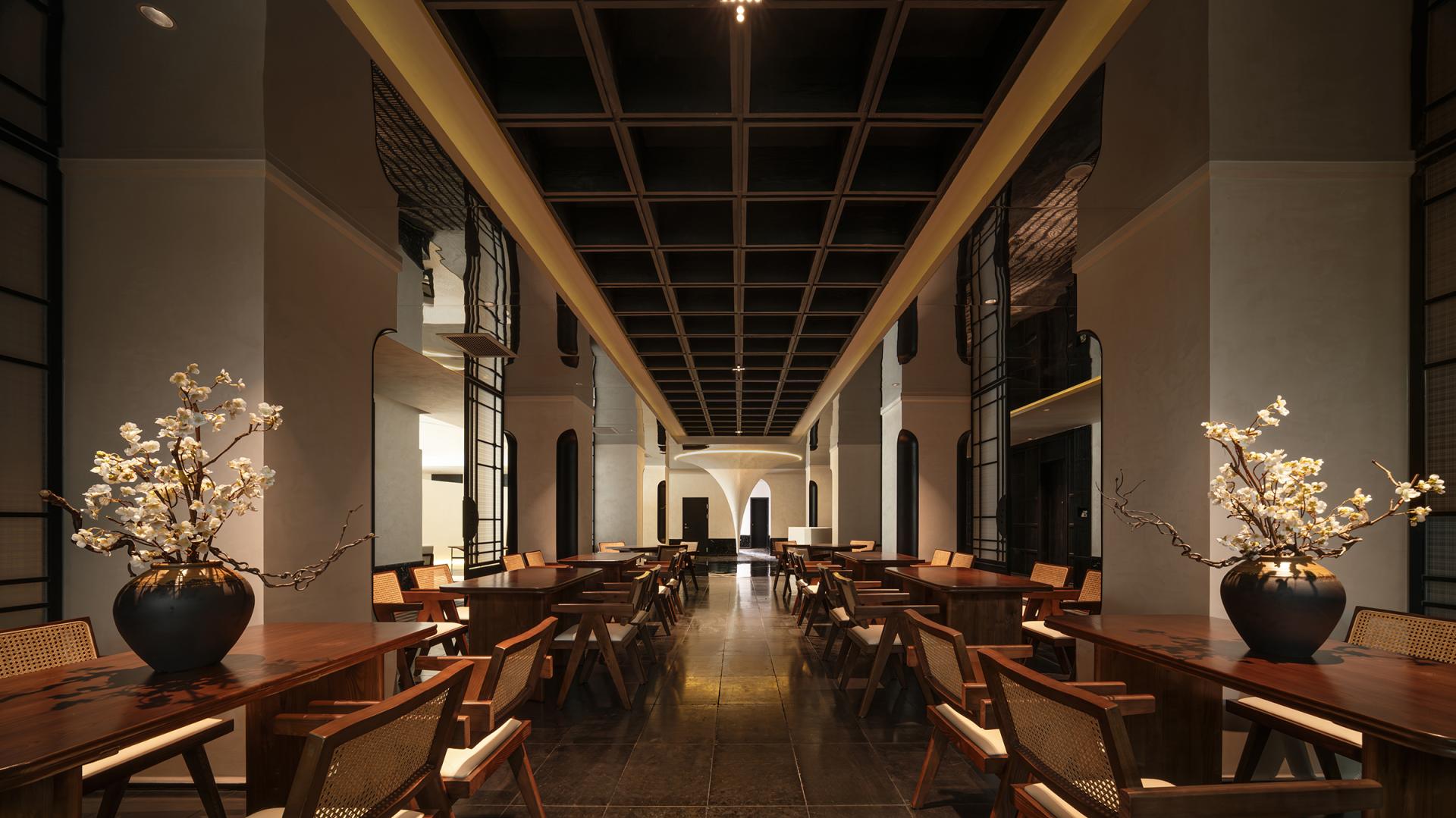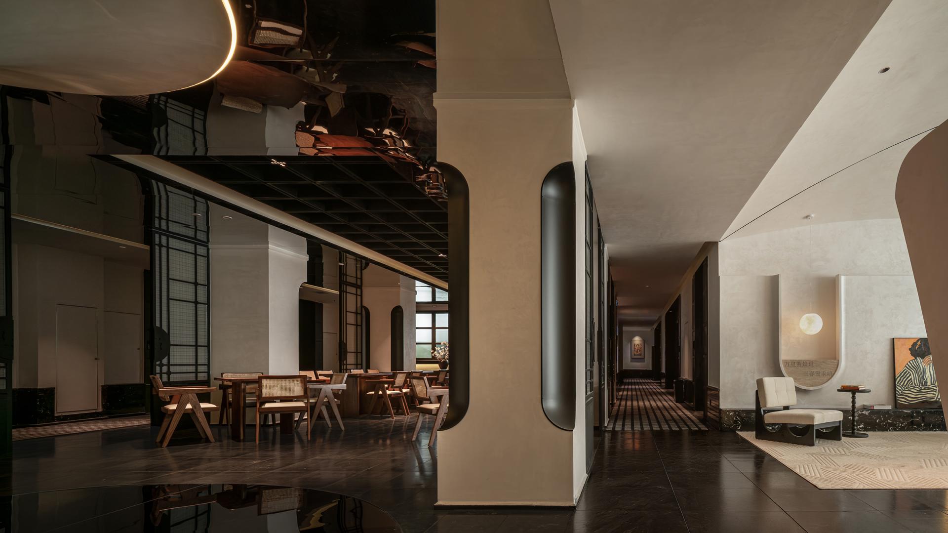 This project is rooted in the culture of the Dunhuang Silk Road. Situated in a bustling commercial district and adjacent to Shazhou Night Market, it boasts a prime geographical location. The design draws inspiration from the authentic texture of stone-carved cliff faces, extracts morphological elements from Dunhuang murals, cave grottoes, and the outlines of Buddha statues, and is accentuated by classical Chinese poems. Its concept is to create a cultural space in the midst of the busy city—one that combines a sense of design and youthful vibes while isolating itself from hustle and bustle.