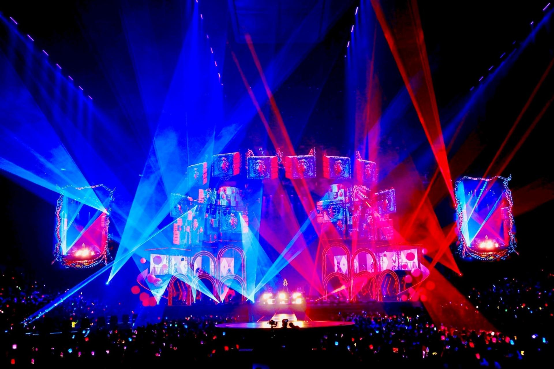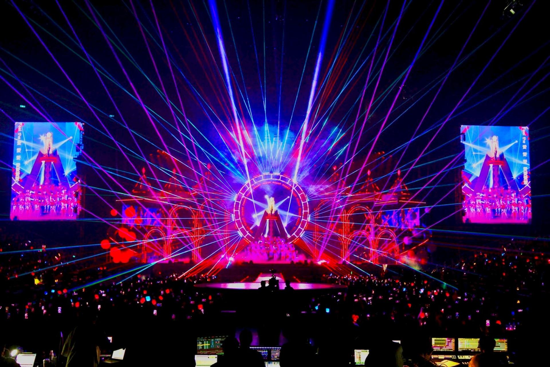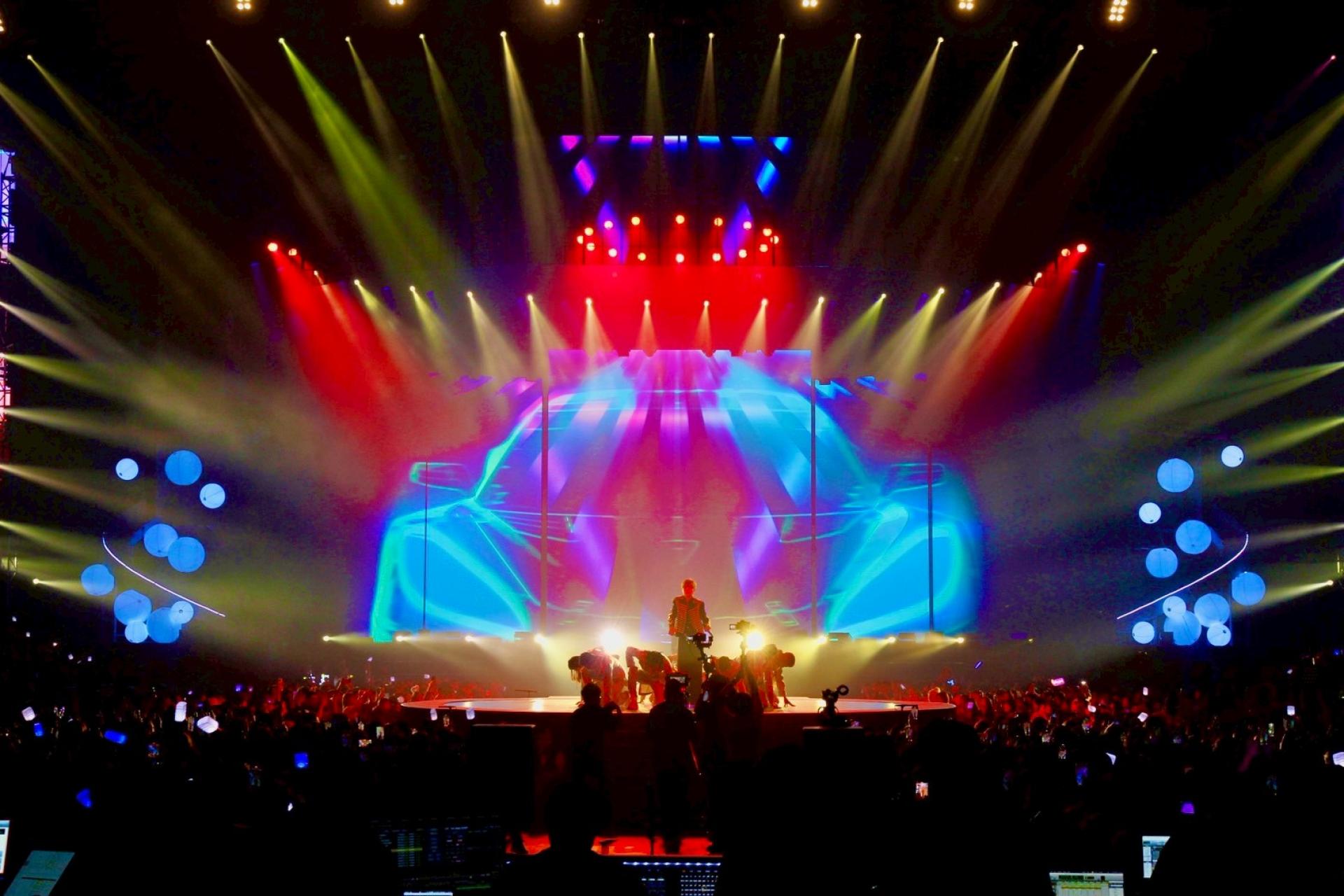 Extended runways and circular walkways brought the artist into direct proximity with the audience. Moving low-altitude lights and synchronized LED wristbands turned the crowd into active participants, transforming the concert into a joyful parade.