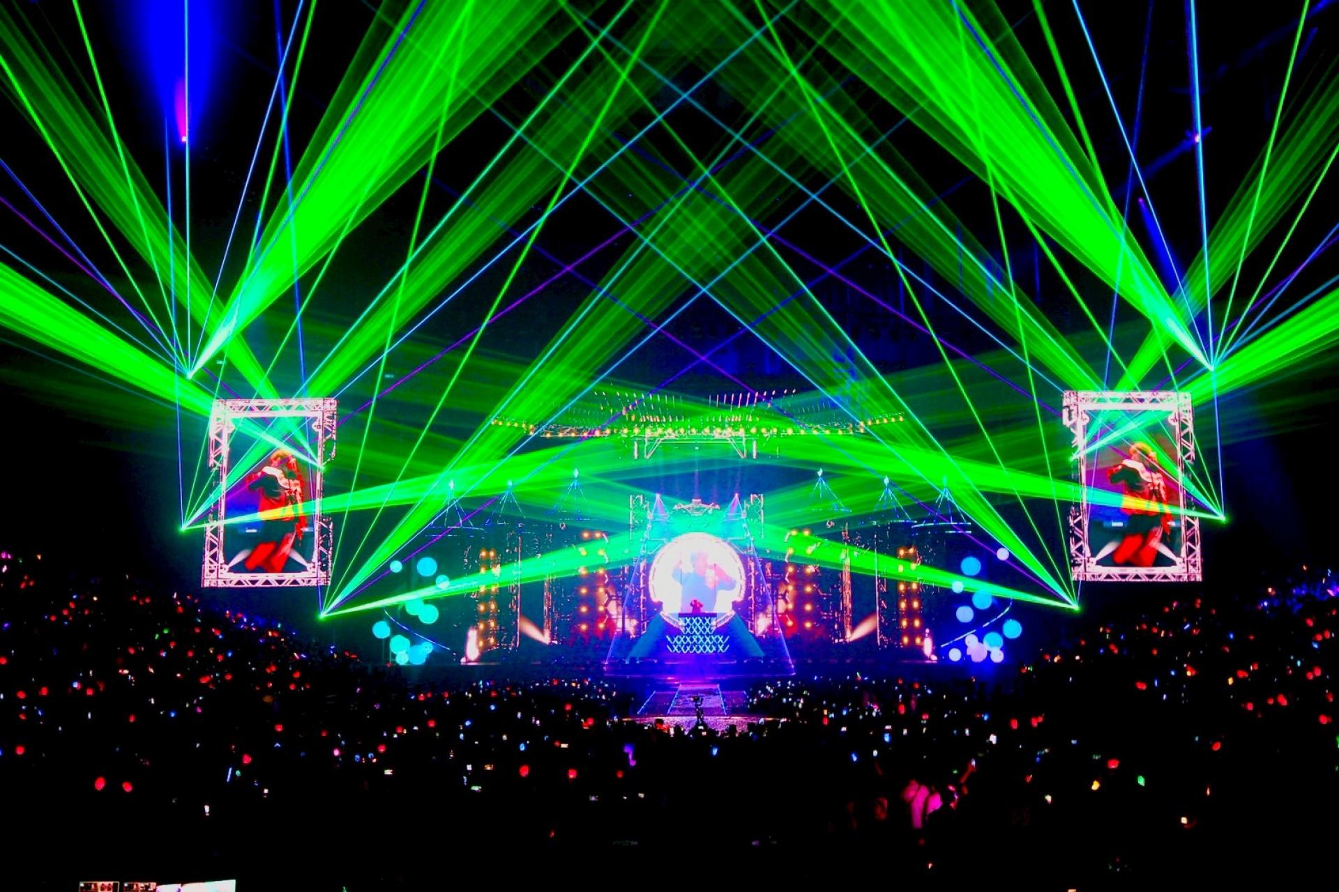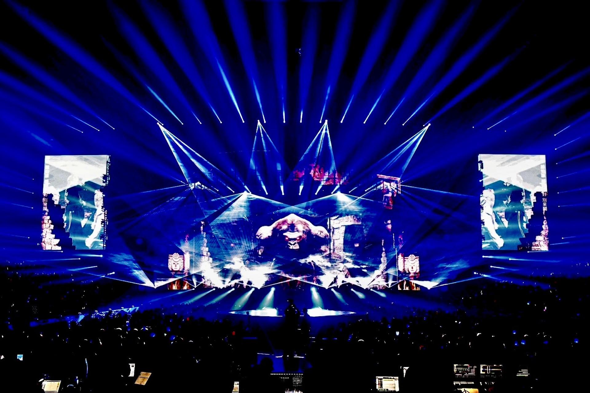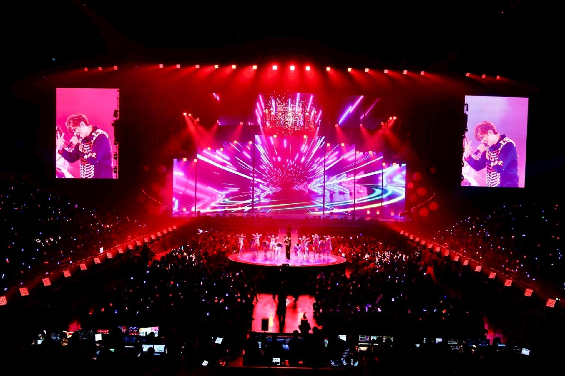 Extended runways and circular walkways brought the artist into direct proximity with the audience. Moving low-altitude lights and synchronized LED wristbands turned the crowd into active participants, transforming the concert into a joyful parade.