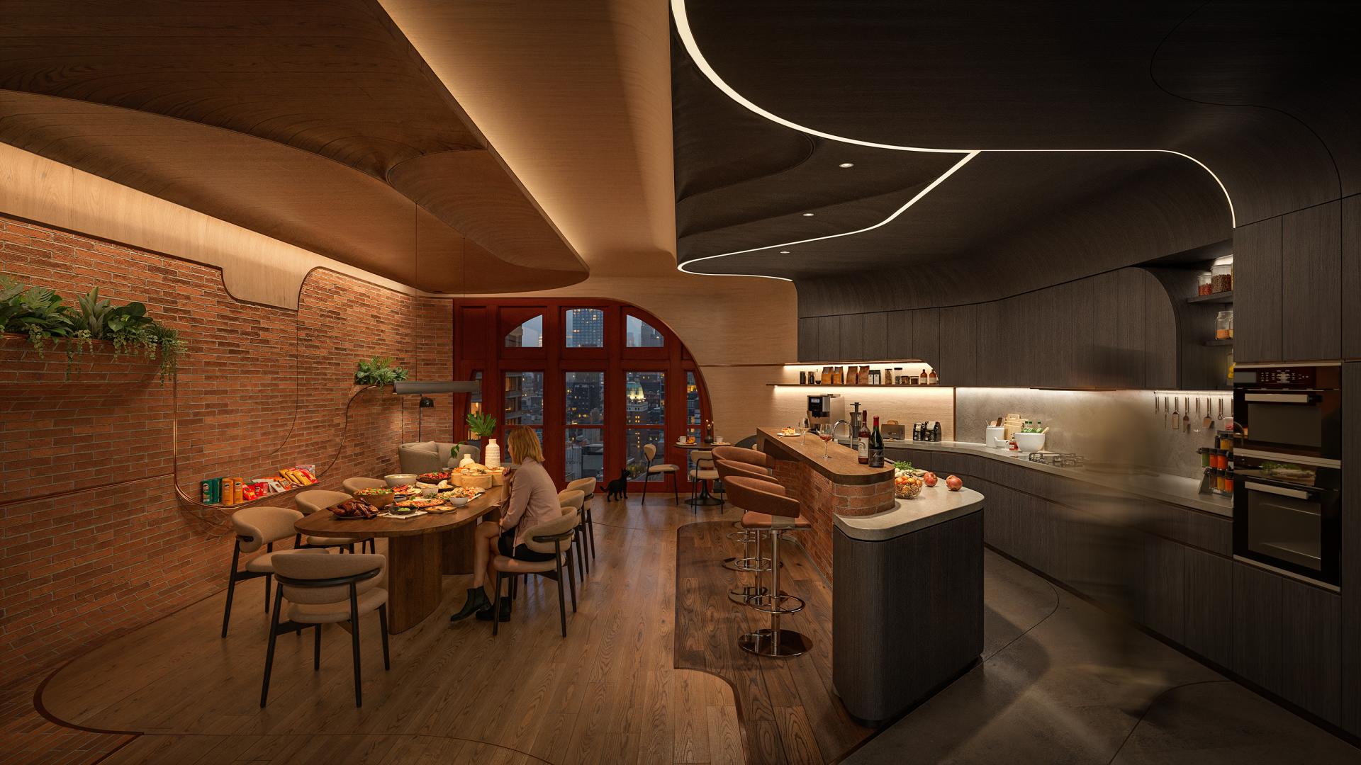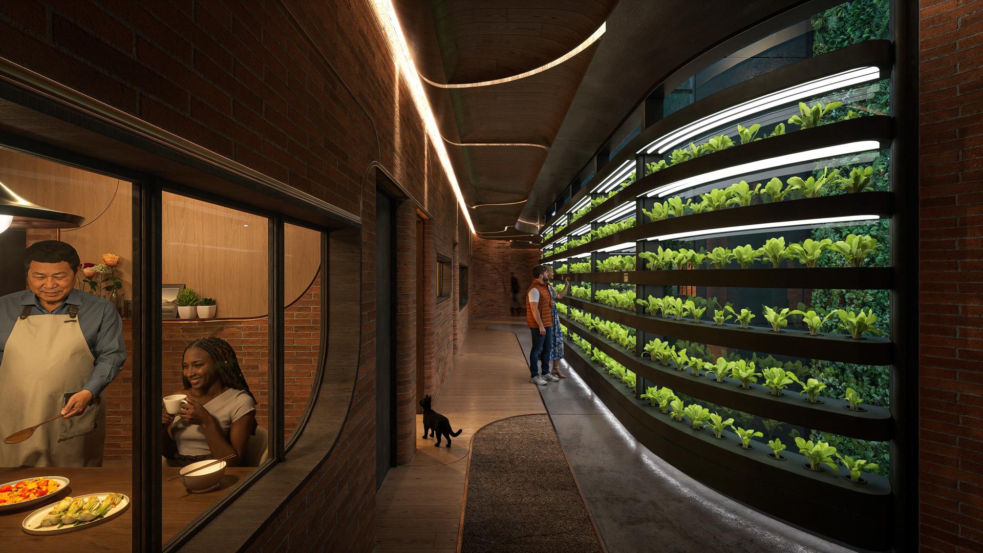 At street level, a vibrant food court extends the energy of Fulton Center into a porous atrium where residents, commuters, and visitors converge. Above, clusters of housing organize around shared kitchens and dining rooms, turning cooking into a collective ritual. Balconies unfold into Y-shaped gardens that stitch vertical neighbors together while extending food production into the city fabric. A rooftop bar crowns the project, framing views of downtown as a communal stage for cultural exchange.