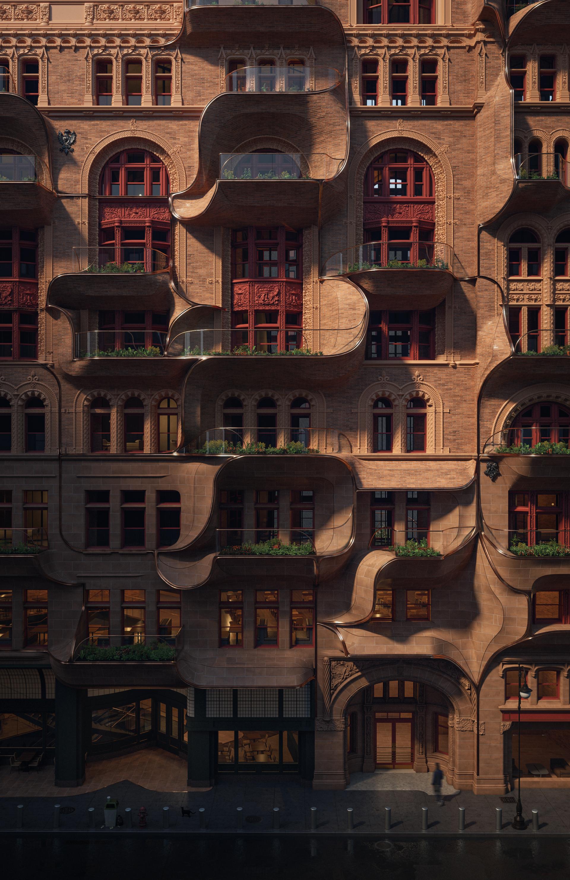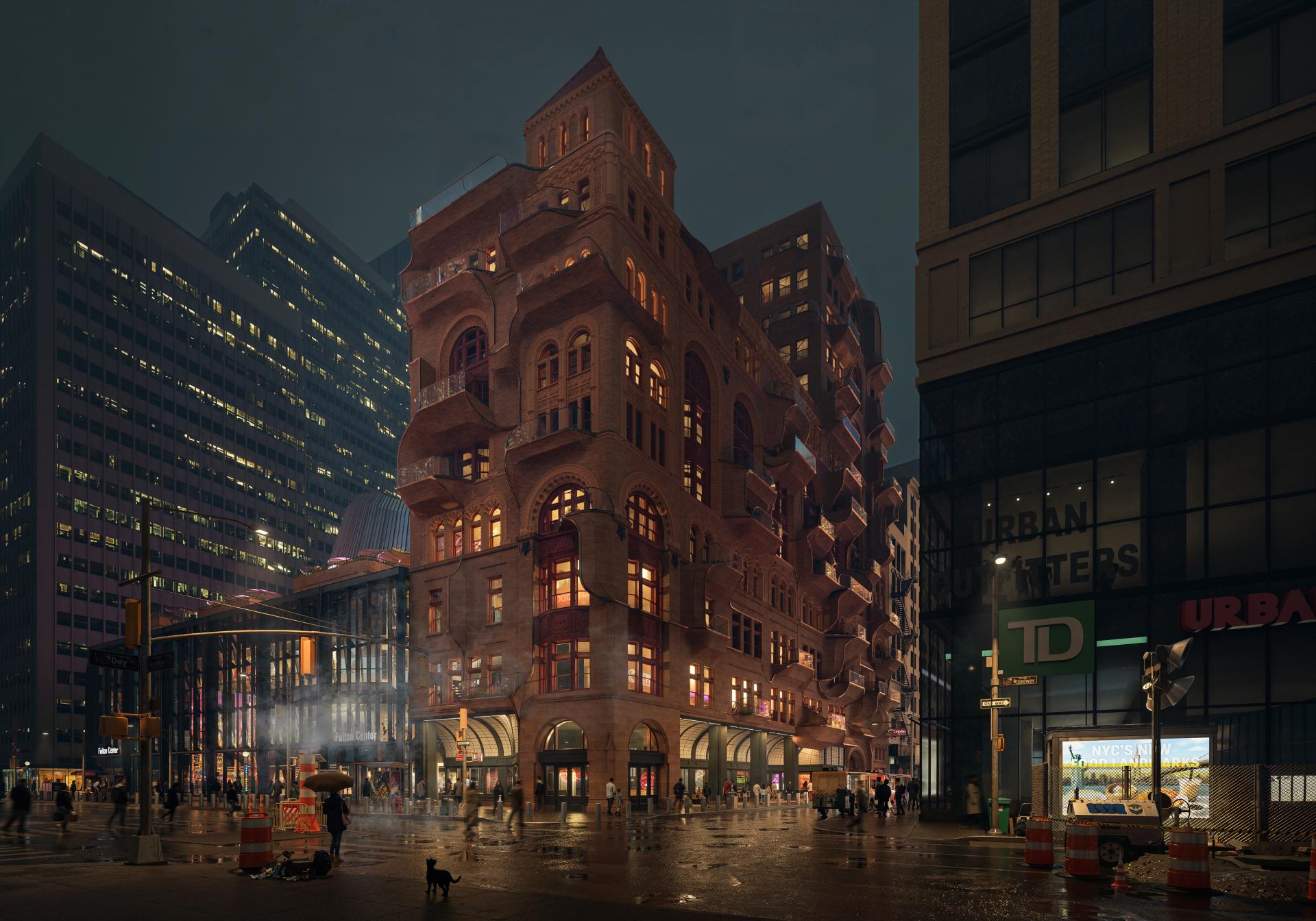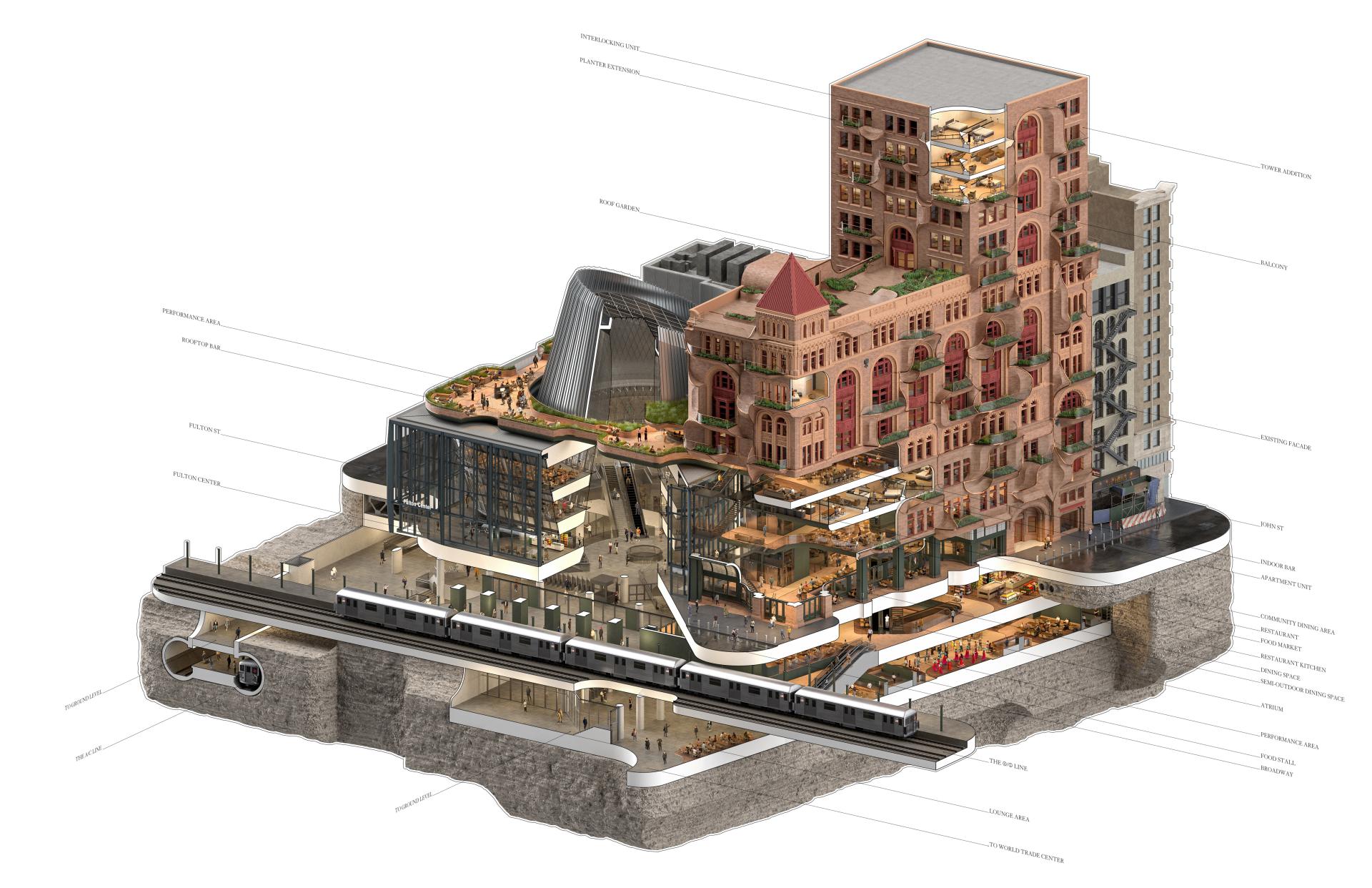 The Dissolving Corbin Building reimagines a historic landmark in Lower Manhattan as a vertical ecosystem where living, eating, and gathering dissolve into one another. Once celebrated primarily for its ornate façade, the Corbin Building is renewed as an architecture of continuity—retaining its historic skin while transforming its interior into layers of shared space. Solid walls dissolve inward to generate communal kitchens, atriums, and gardens, blurring the line between private units and the public city.