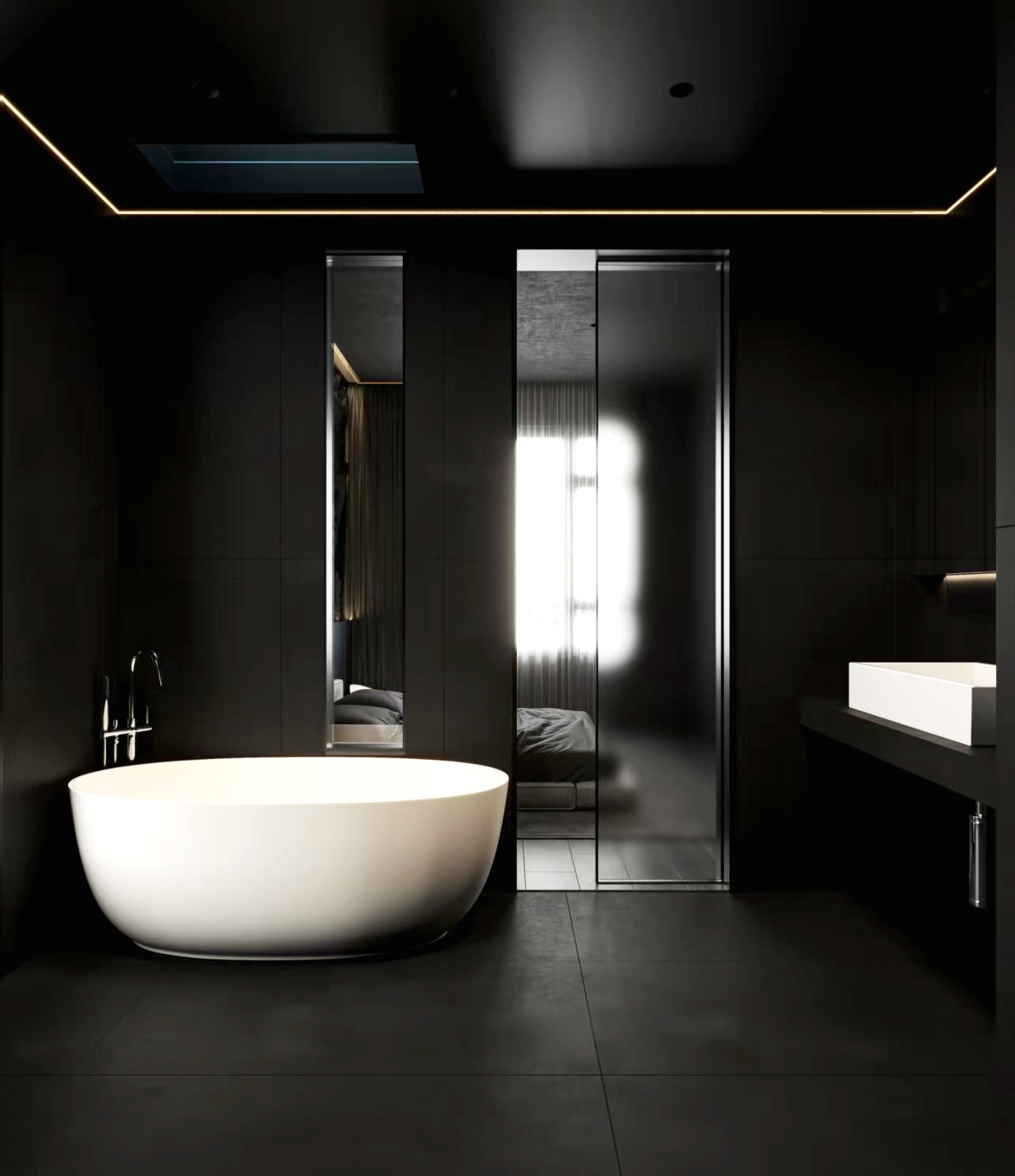 Every functional area reflects this philosophy. The entrance blends matte micro-cement with mirrors to expand space. The kitchen features seamless black cabinetry enhanced by illuminated glass walls. The daughters’ rooms adopt a “box within a box” concept, where bright pink and white interiors emerge like hidden sanctuaries. The master suite combines sculptural relief panels with ambient backlighting, while the bathroom contrasts black marble with a freestanding white tub beneath a skylight effect.