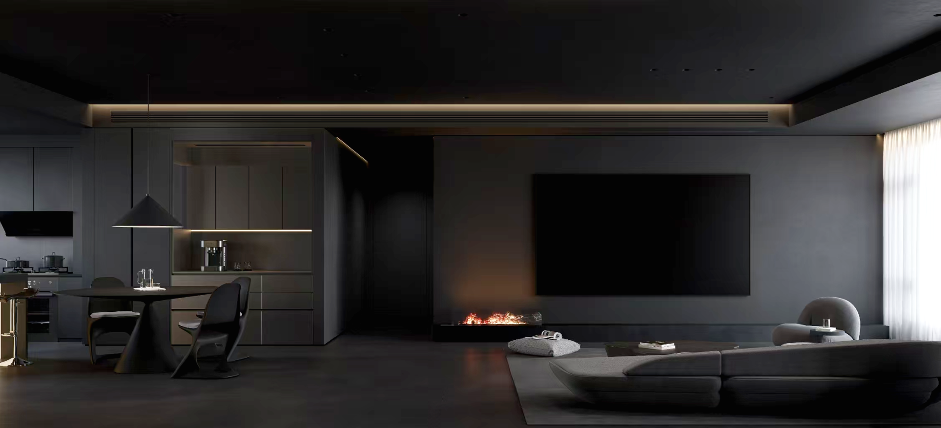 Inspiration emerged from three dimensions: the vastness of the cosmos, with lighting details reminiscent of stars and trails; the Japanese wabi-sabi philosophy, where textured finishes like micro-cement and handcrafted coatings embrace imperfection and time; and modern art, particularly the ultra-black paintings of Pierre Soulages and the contrast-driven clarity of monochrome photography.