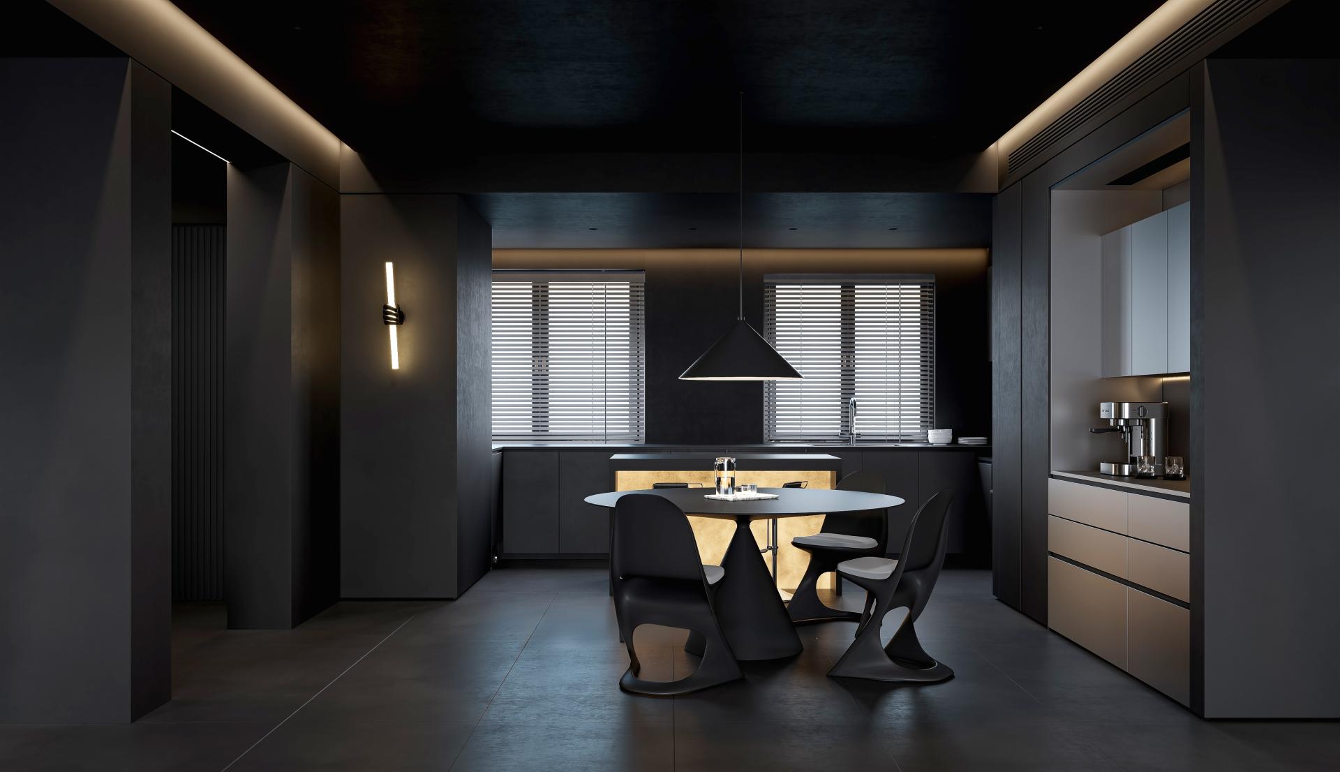 The central design concept redefines black not as absence but as a backdrop—a canvas to carry, highlight, and shape light. Natural daylight and layered artificial illumination flow across diverse black surfaces, creating dynamic shadows and depth. Subtle accents of white and pink punctuate the darkness, introducing focal points and emotional warmth that symbolize the family’s varied personalities within a unified atmosphere.