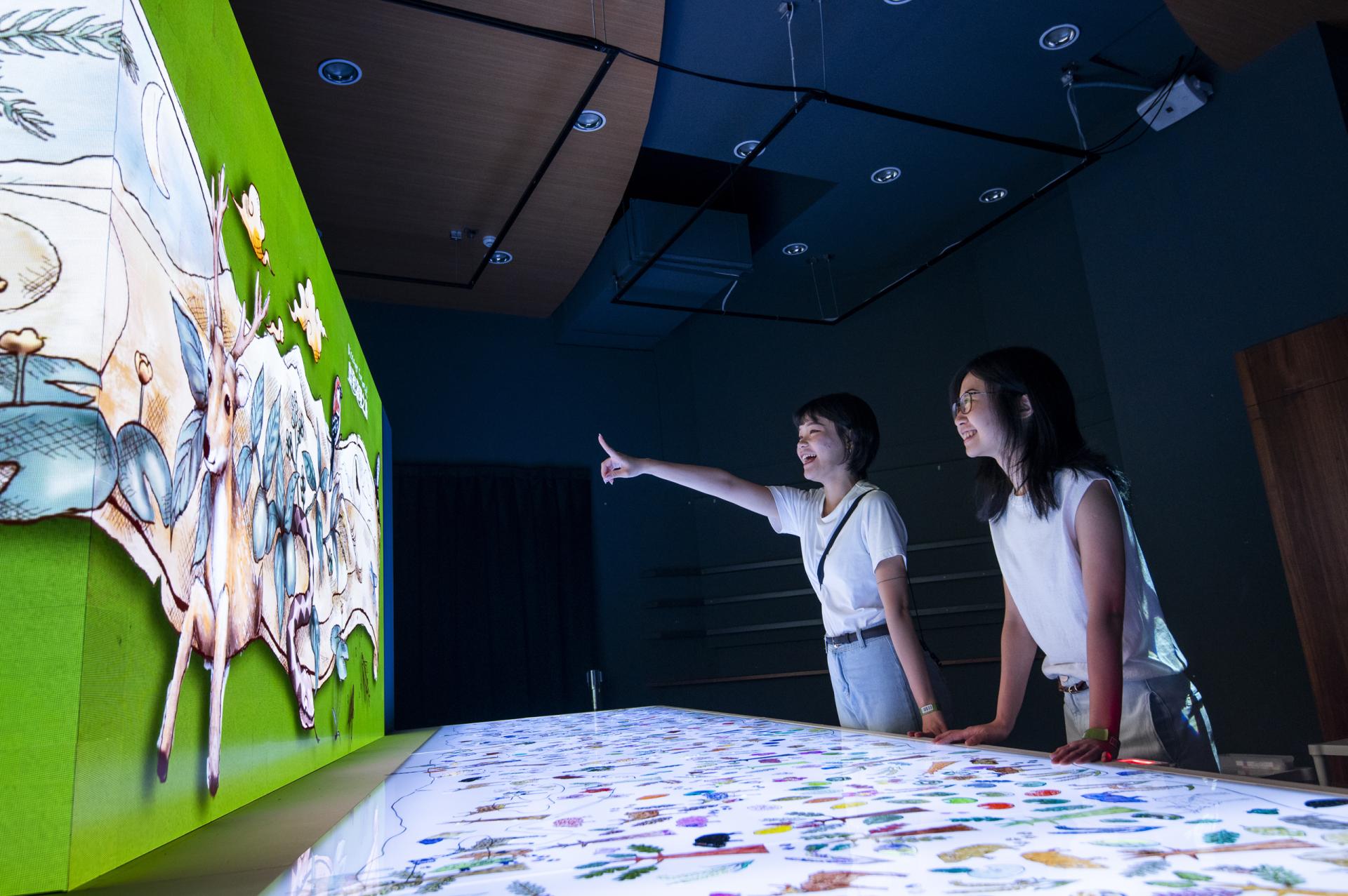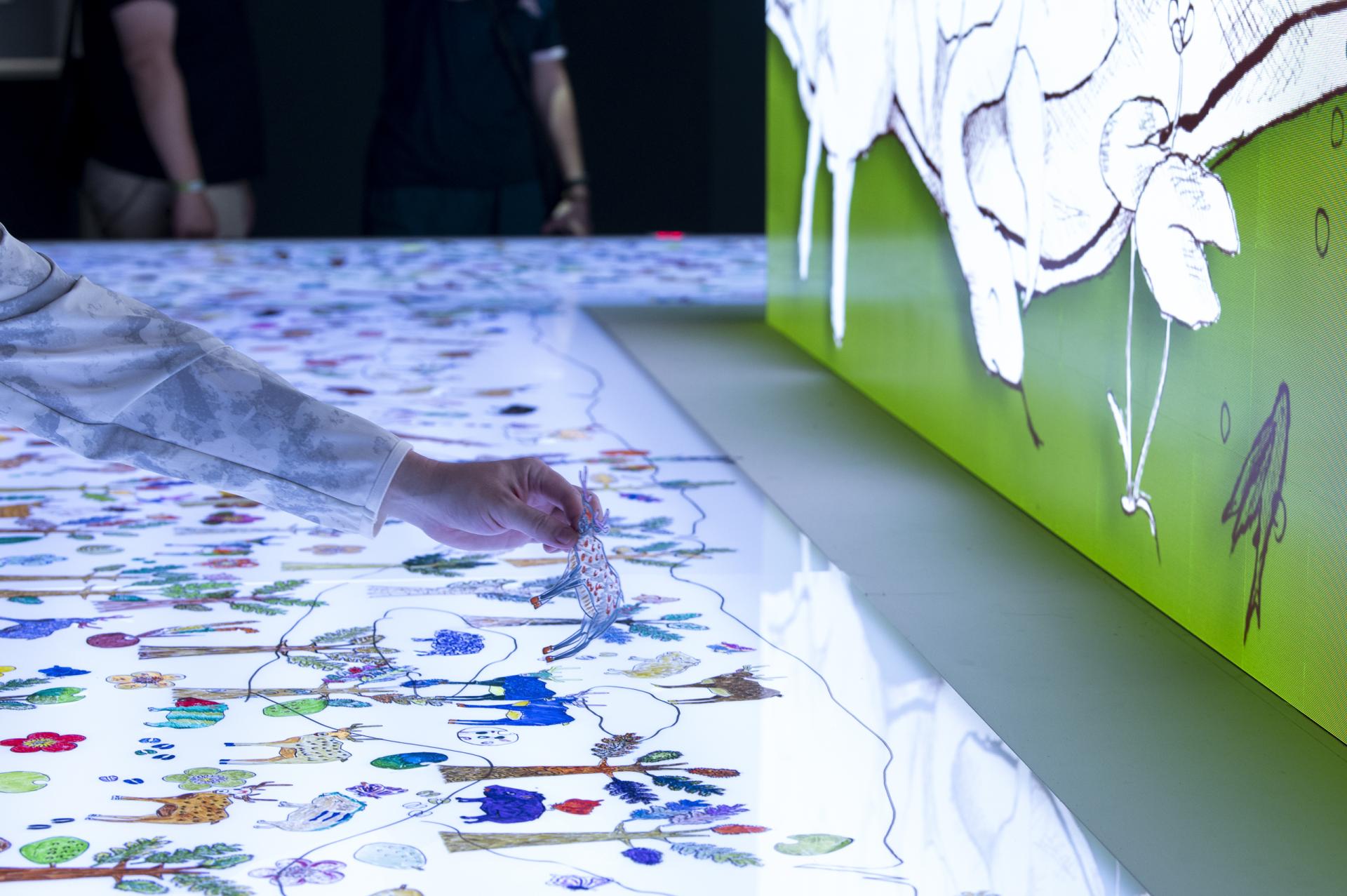 The second zone, “Island of Discovery,” shifts into an interactive, co-creative experience. Families and children become modern explorers by coloring illustrated “specimen” stickers, derived from mural motifs, and placing them onto an illuminated table. These designs are then projected onto a large LED screen, gradually forming a colorful new island. The more participants engage, the richer and more vibrant the collective creation becomes, symbolizing imagination and shared creativity.
