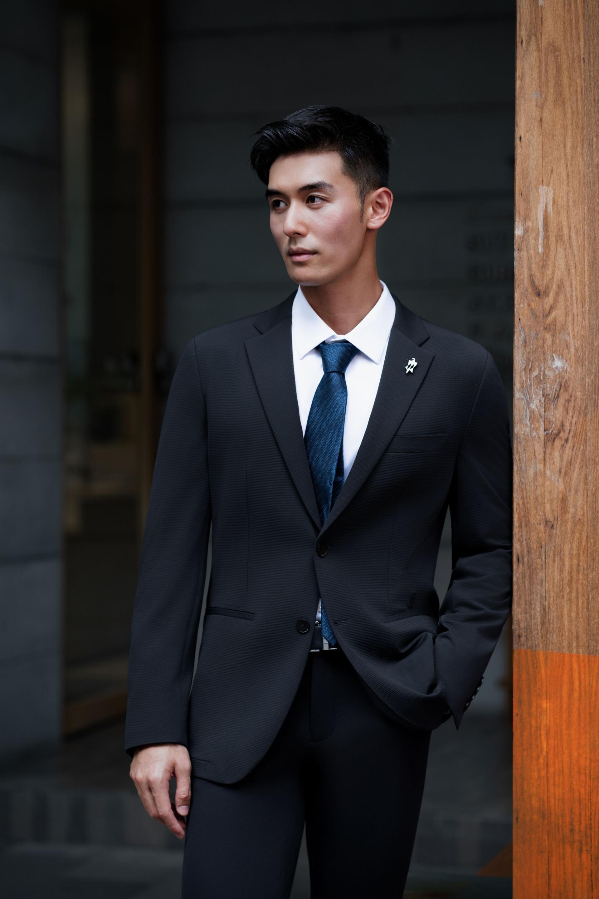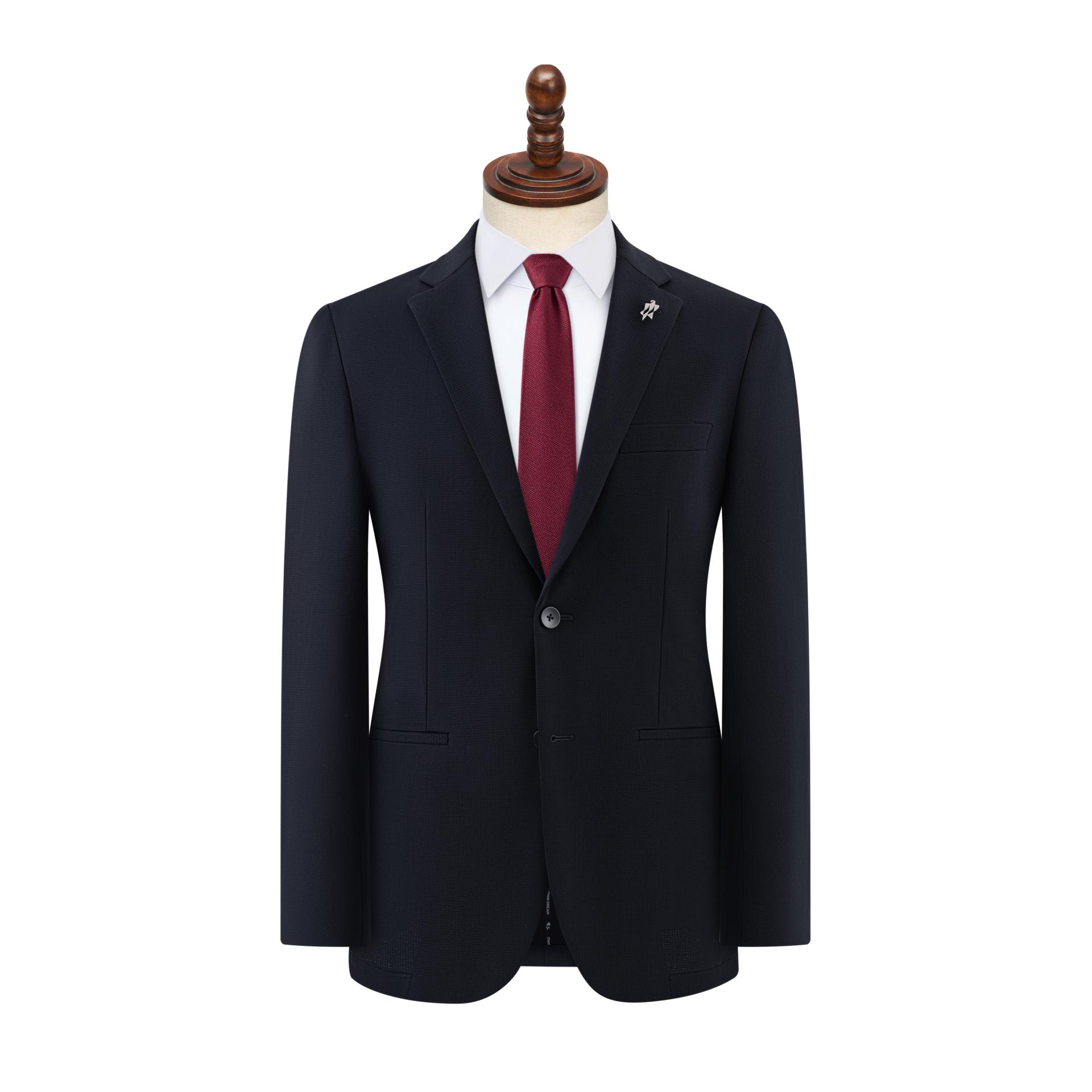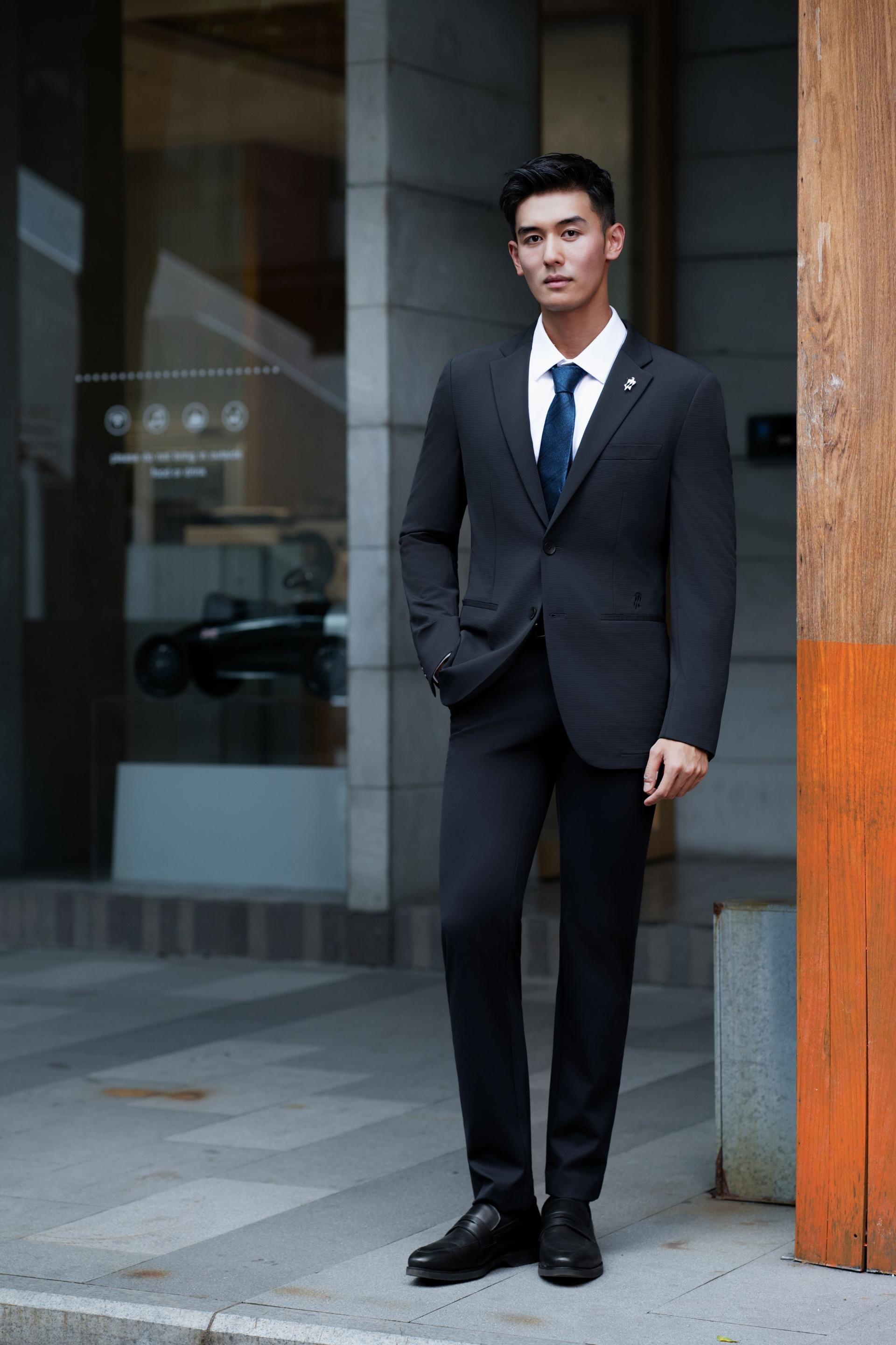 As for detail design, the sleeve head is strategically positioned forward and designed with a tapered front and a rounded back to accommodate the slightly forward-leaning posture of modern business professionals; at the same time, its lowered height allows greater freedom of arm movement. The waistline is subtly elevated by 2 cm to visually elongate the legs. Classic navy/gray as the main color, accented with a logo print in a contrasting hue, reflects refined taste. This blazer redefines the aesthetic standards of modern gentlemanly attire.