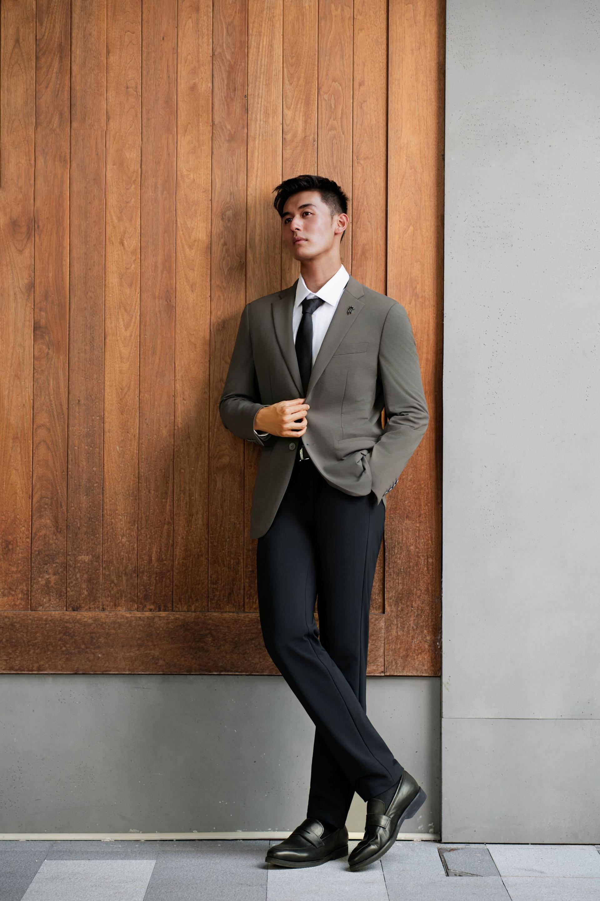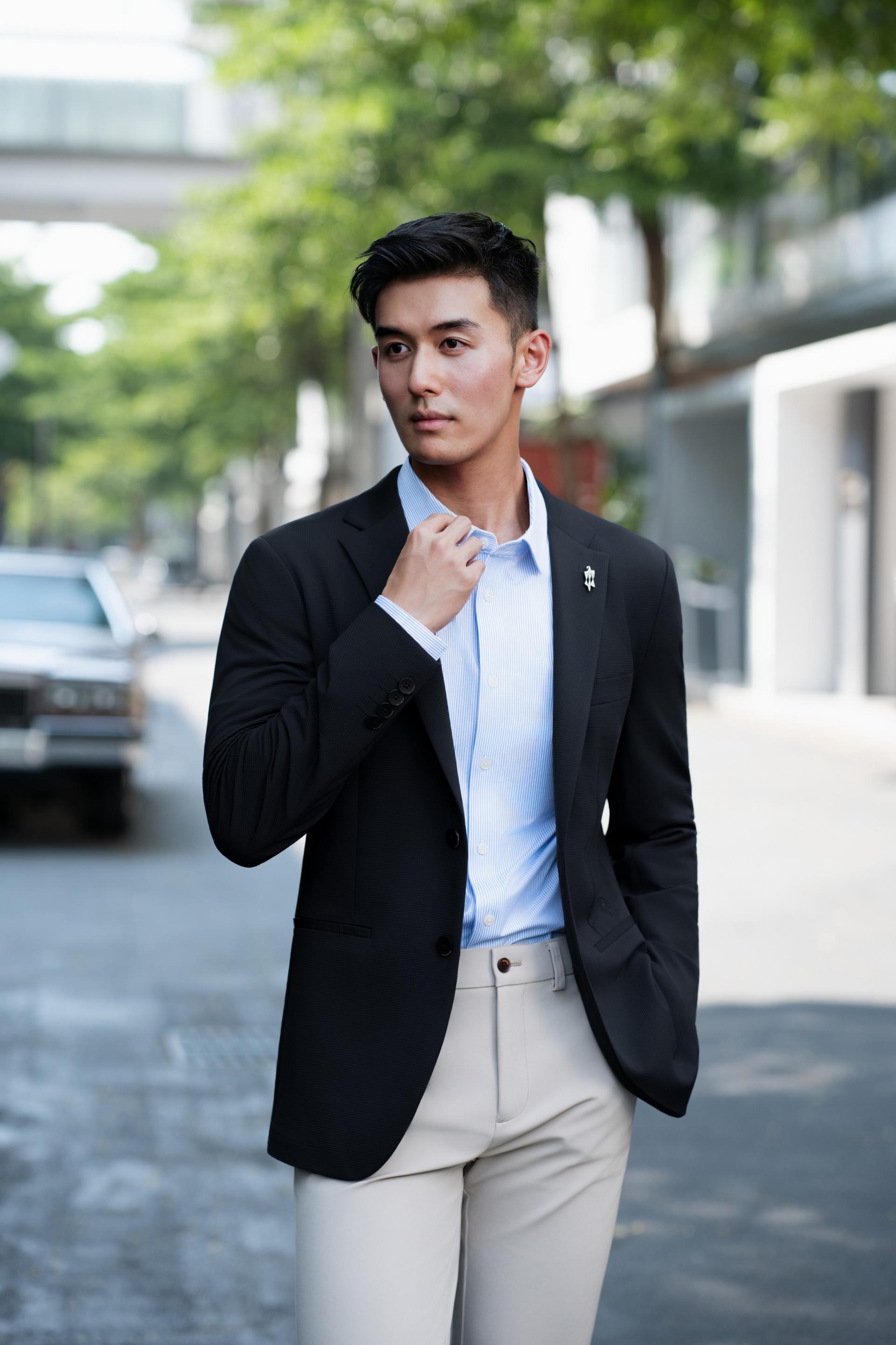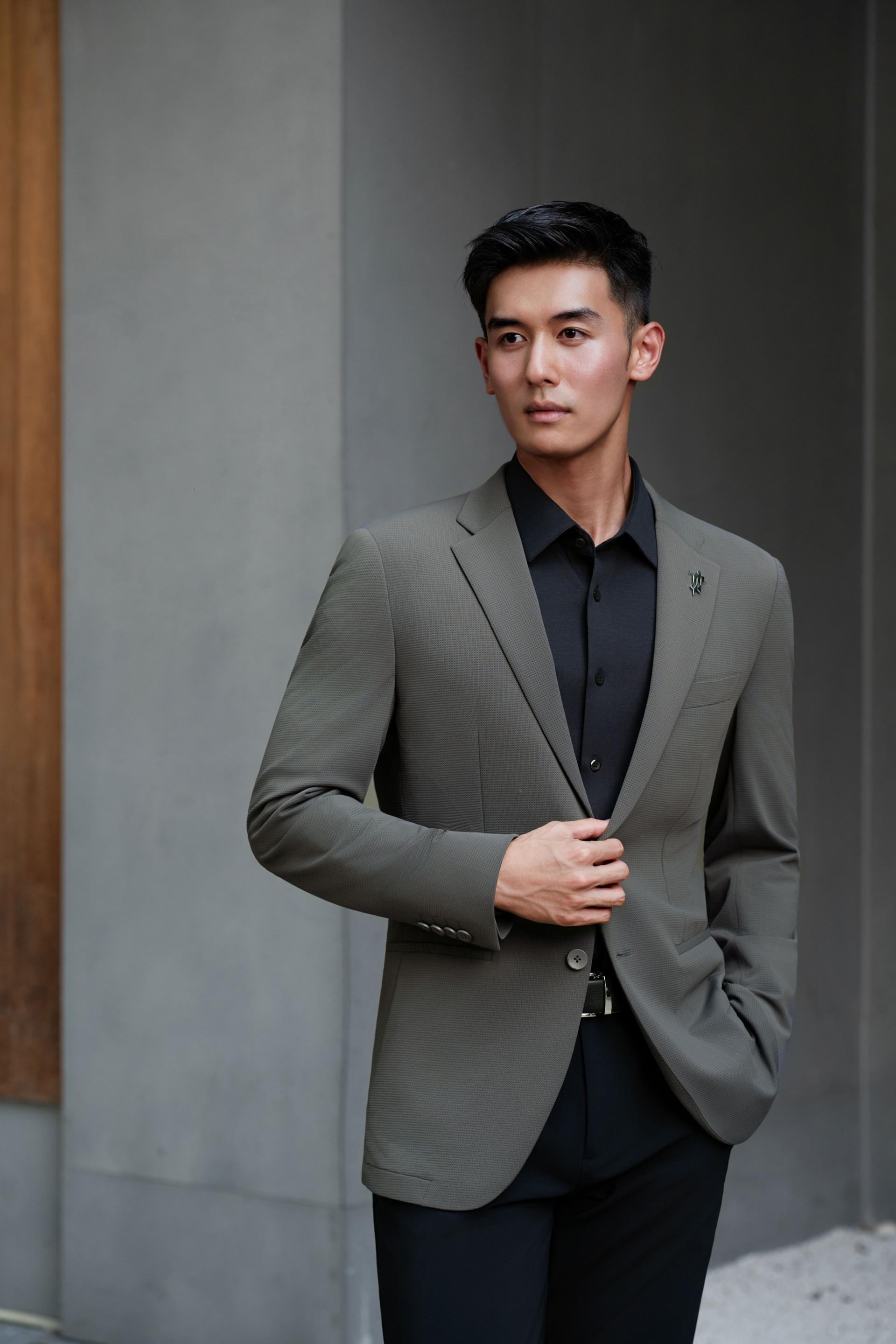 As for detail design, the sleeve head is strategically positioned forward and designed with a tapered front and a rounded back to accommodate the slightly forward-leaning posture of modern business professionals; at the same time, its lowered height allows greater freedom of arm movement. The waistline is subtly elevated by 2 cm to visually elongate the legs. Classic navy/gray as the main color, accented with a logo print in a contrasting hue, reflects refined taste. This blazer redefines the aesthetic standards of modern gentlemanly attire.