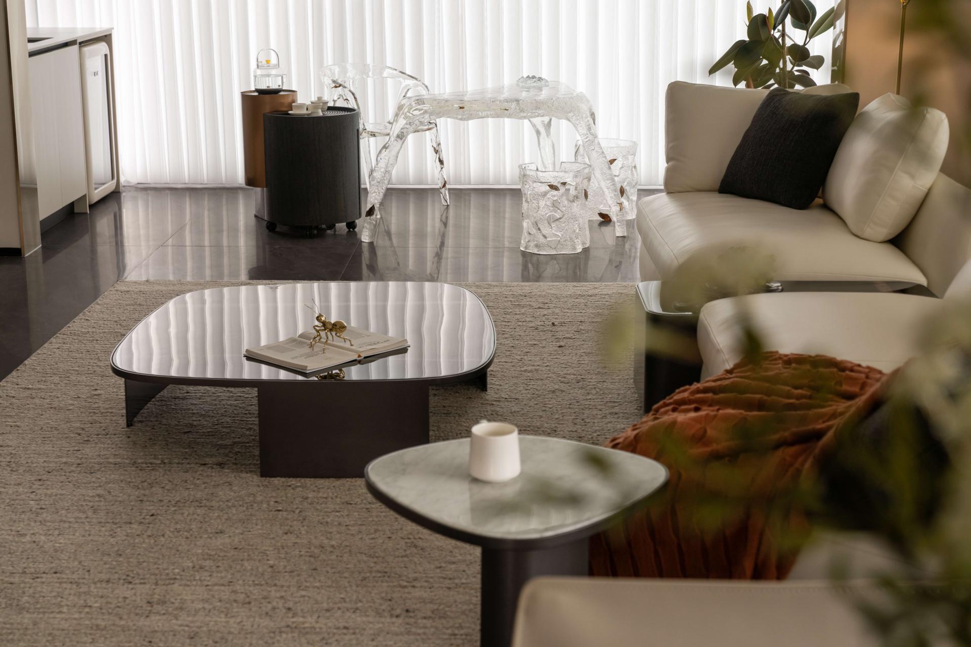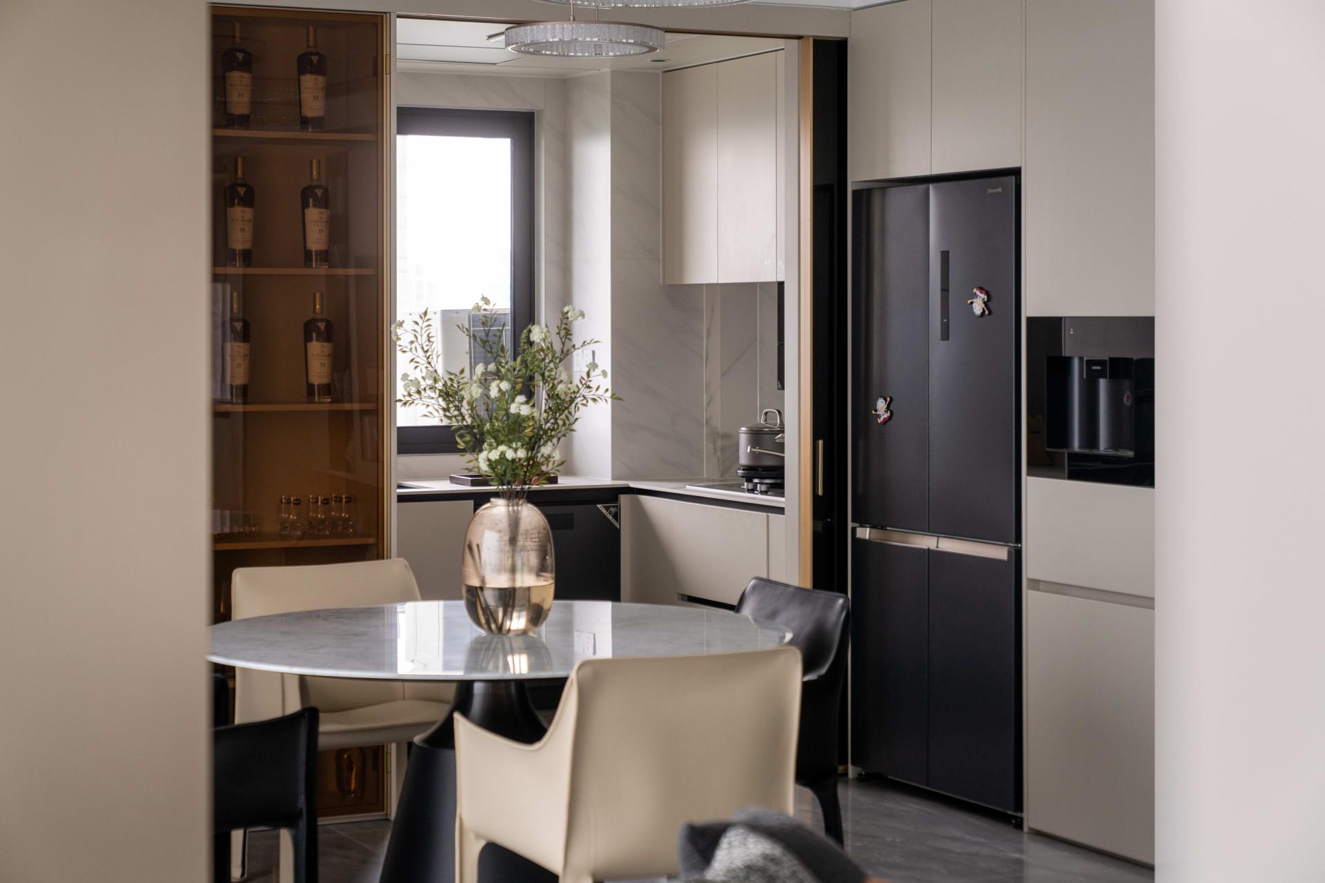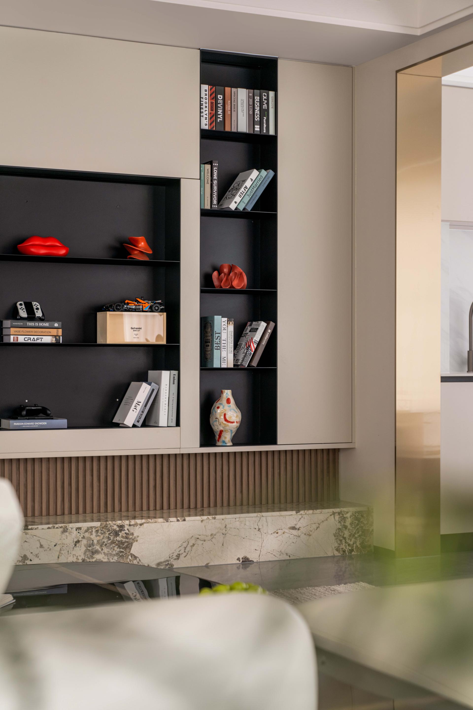 The kitchen employs hidden sliding glass partitions to switch between transparency and privacy, resolving the demands of open planning and Chinese cooking. The master suite integrates bedroom, wardrobe, and bathroom into one fluid sequence, anchored by a 12-meter custom storage system combining display and practicality. Bathrooms feature refined contrasts of stone and metal, echoing hotel-level sophistication. Secondary bedrooms and study areas maximize efficiency through multifunctional layouts that serve work, leisure, and guest accommodation.