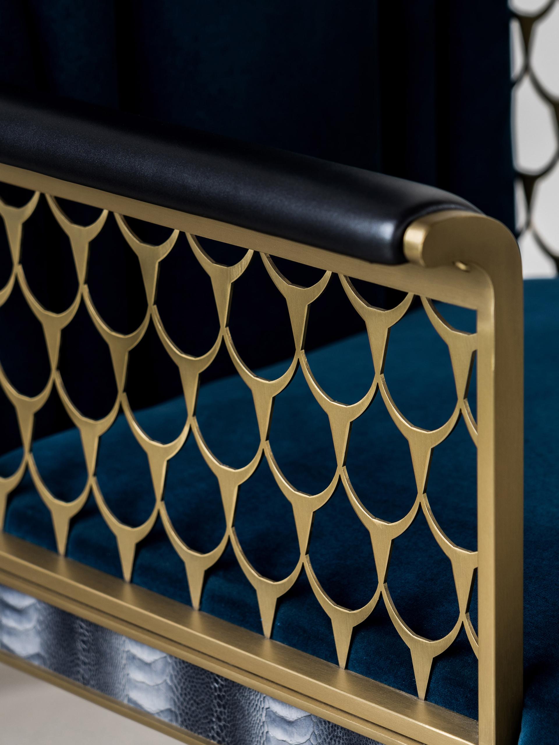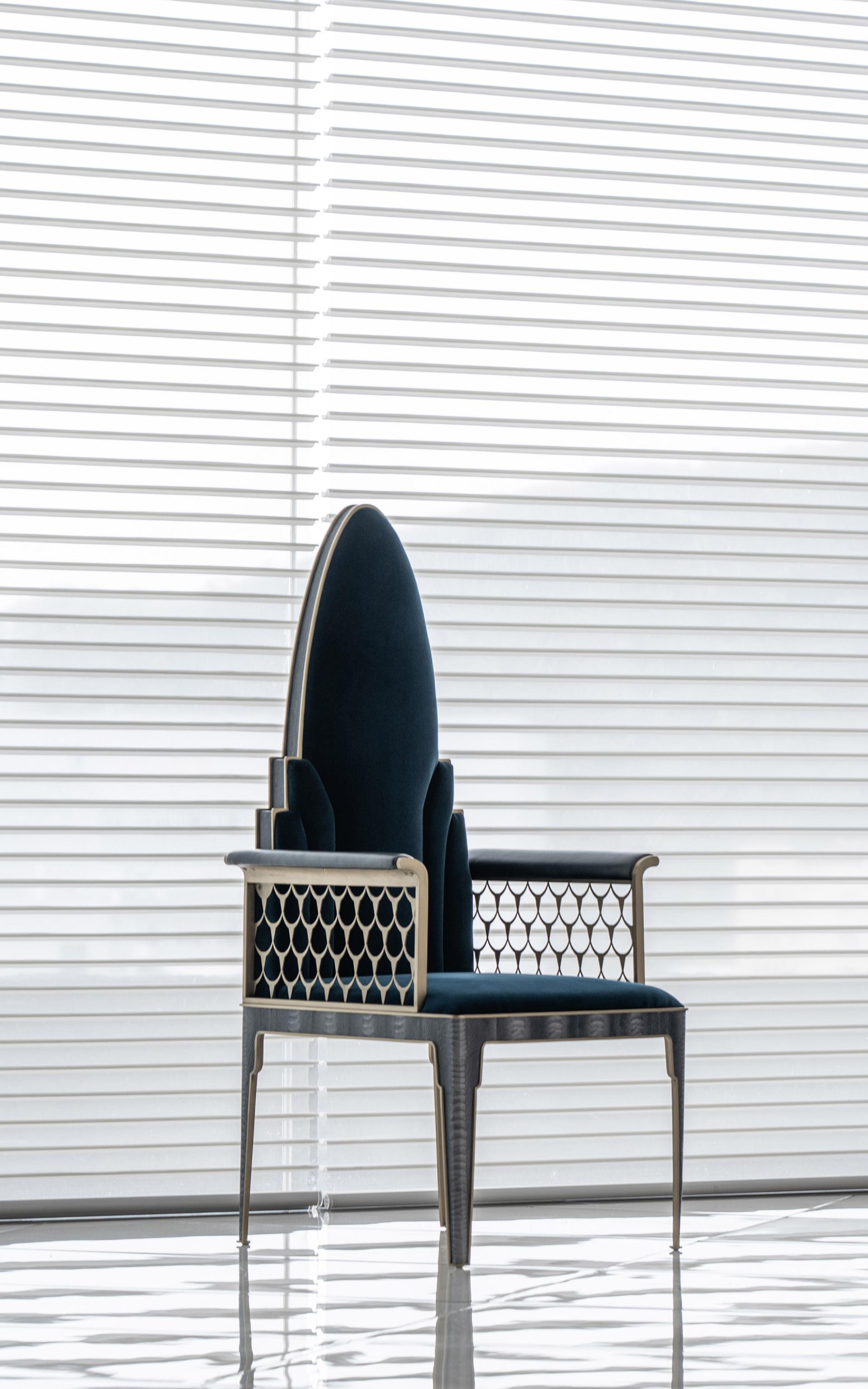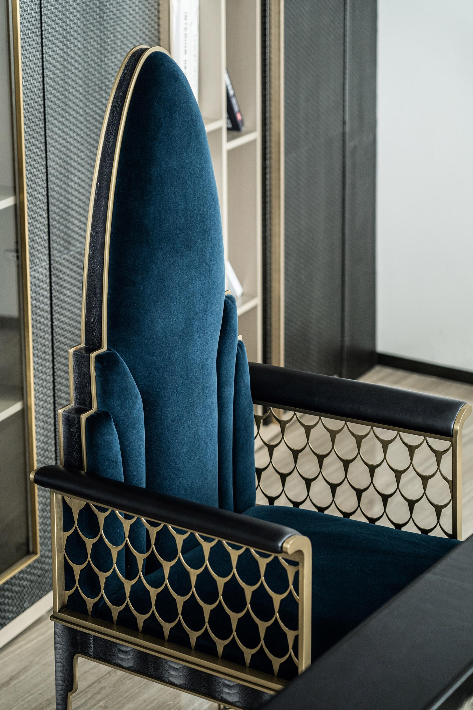 The design of the Chrysler Chair draws inspiration from the Chrysler Building, the world’s first skyscraper. It combines modern techniques with a classic retro style. Before the completion of the Empire State Building, the Chrysler Building dominated the New York skyline. Moreover, the Chrysler Building is a masterpiece of Art Deco architecture from the early 20th century. Its spire, resembling rays of sunlight, has become almost synonymous with the Art Deco style. The essence of the Chrysler Chair lies in its backrest, but beyond that, every detail contributes to its rich design. From the plush, comfortable upholstery of the seat and backrest, to the sleek metal lines that run along the chair’s edges, and the delicate leather upholstery on the armrests and legs, every element adds depth to its overall aesthetic. The openwork armrest design not only gives the chair a refined, luxurious look but also adds a sense of lightness, preventing it from feeling too heavy or rigid despite its substantial form. To showcase vibrant colors and a unique soft texture, the Chrysler Chair uses the highest quality leather and fabrics to ensure a comfortable seating experience for the user.