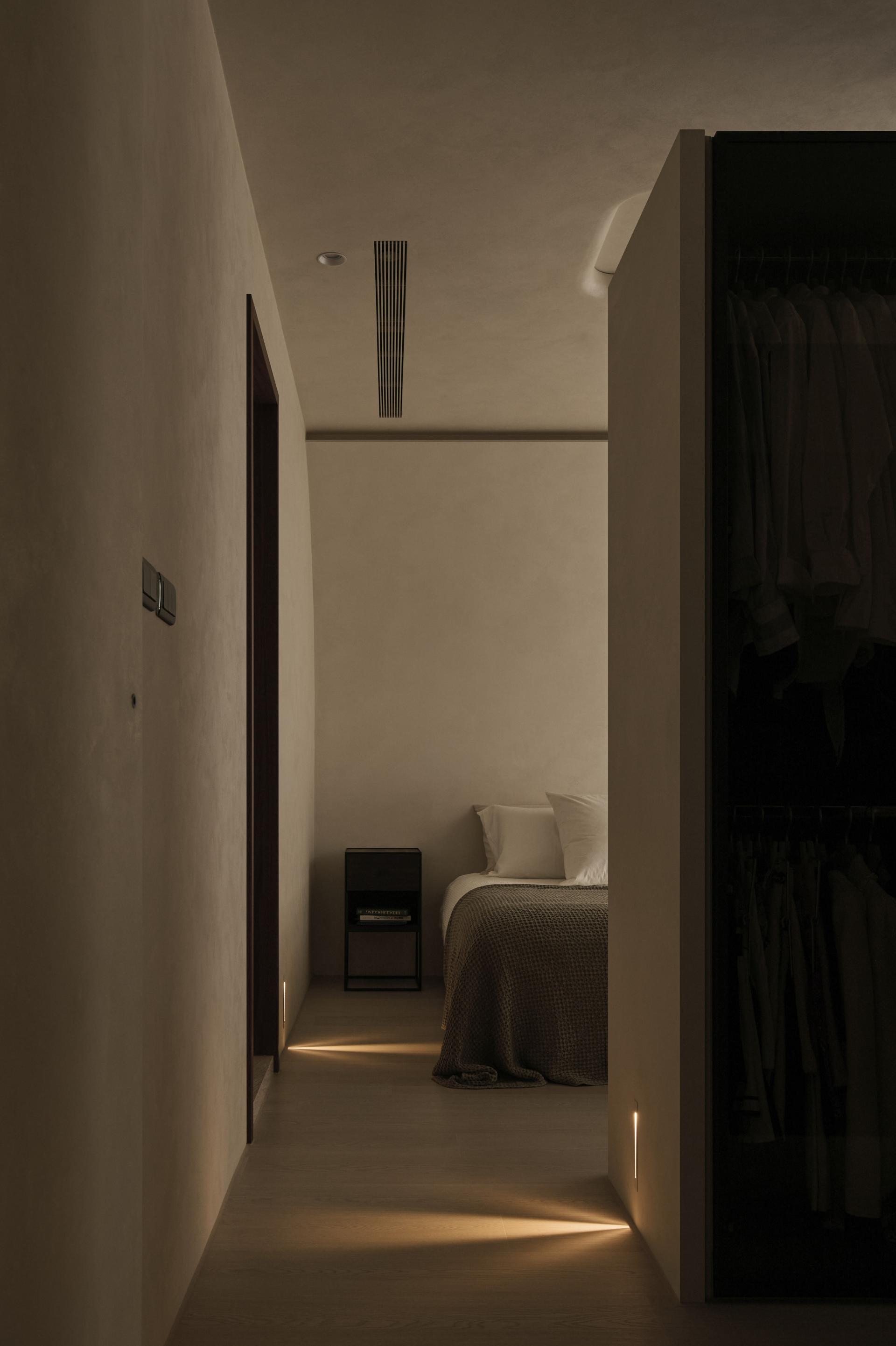 Practical details also reflect thoughtful care: circulation paths frame distant mountain views despite neighboring buildings, while motion-sensor floor lighting in the bedroom corridor addresses the owner’s night-blindness.