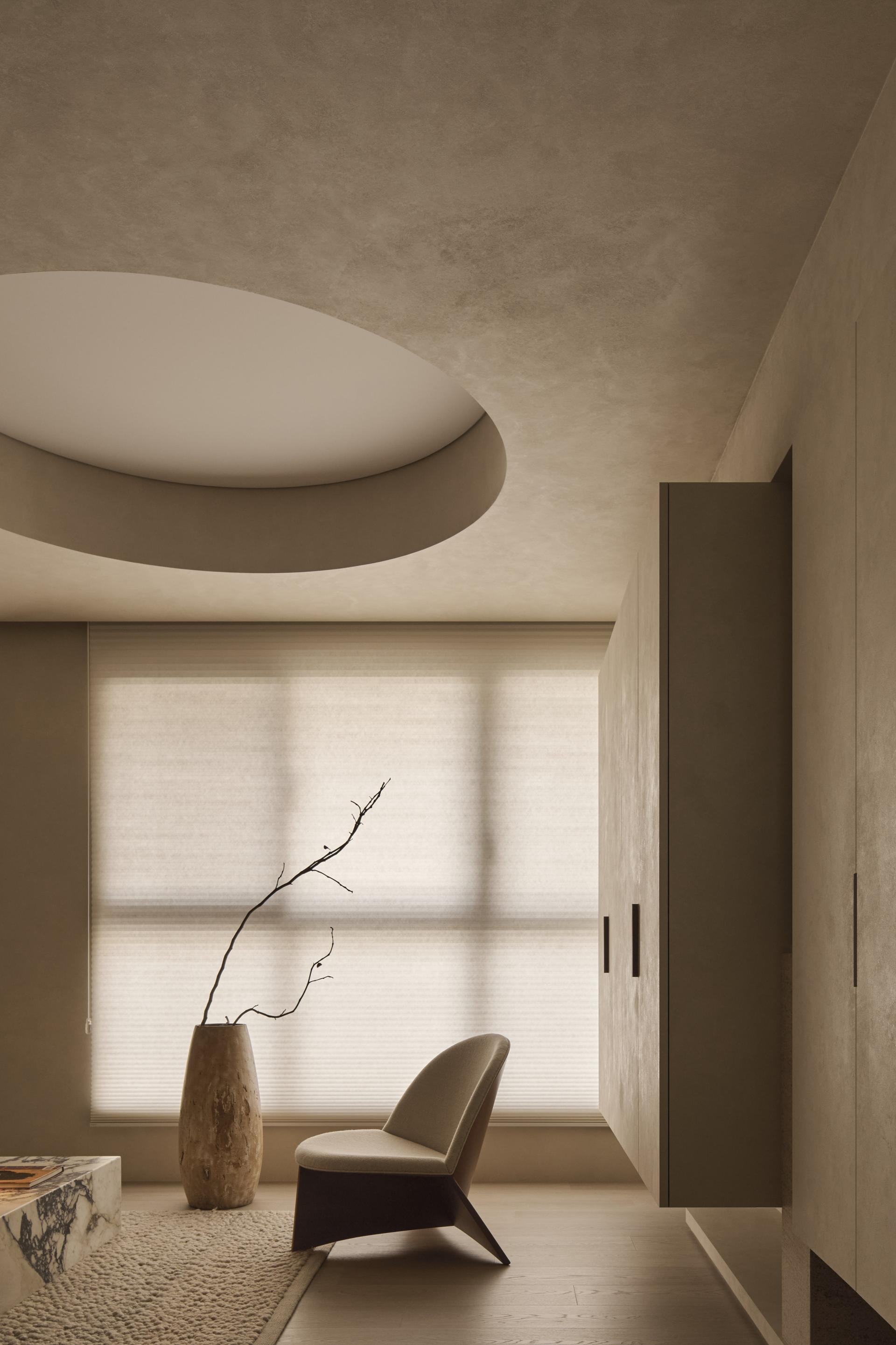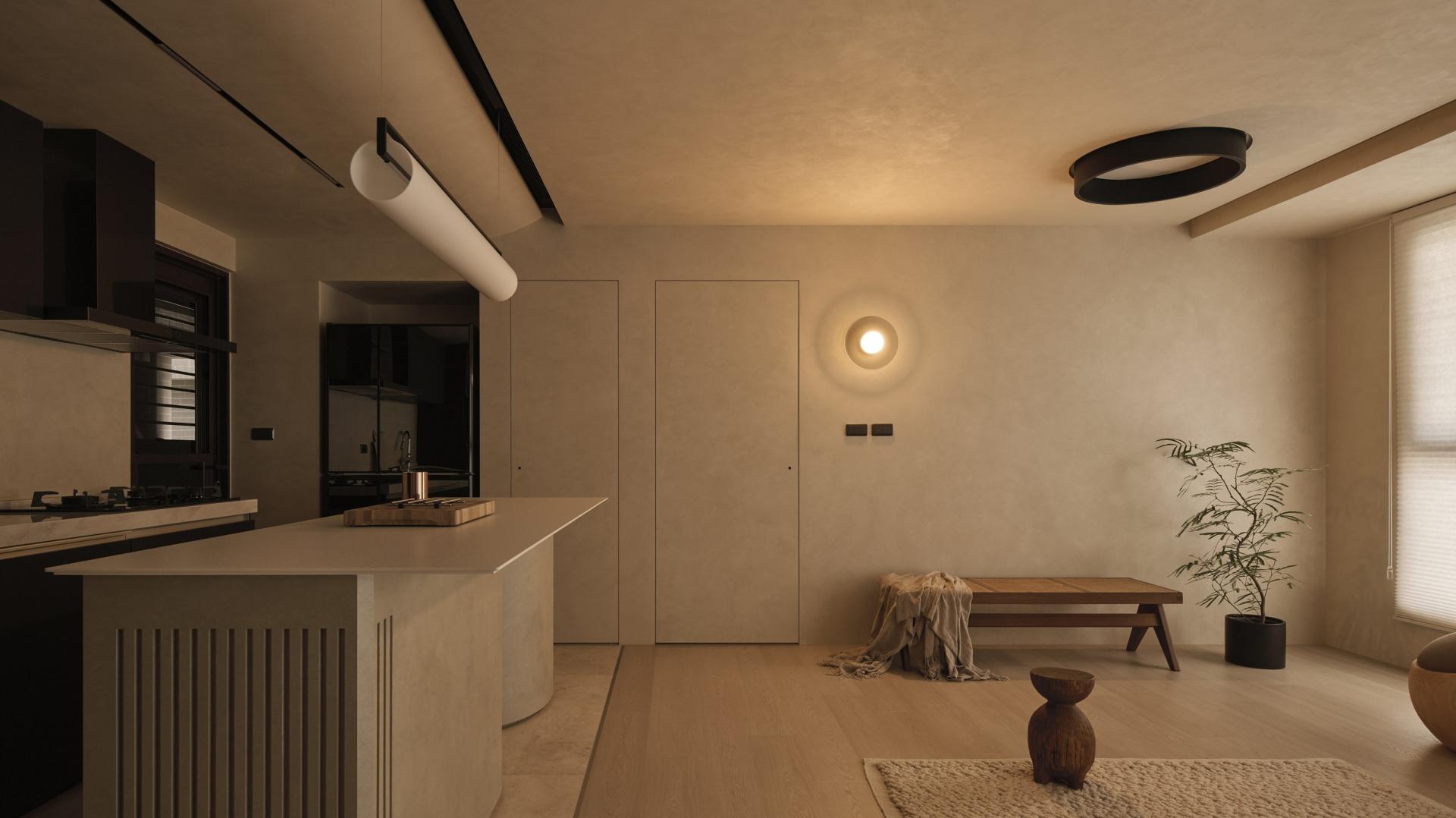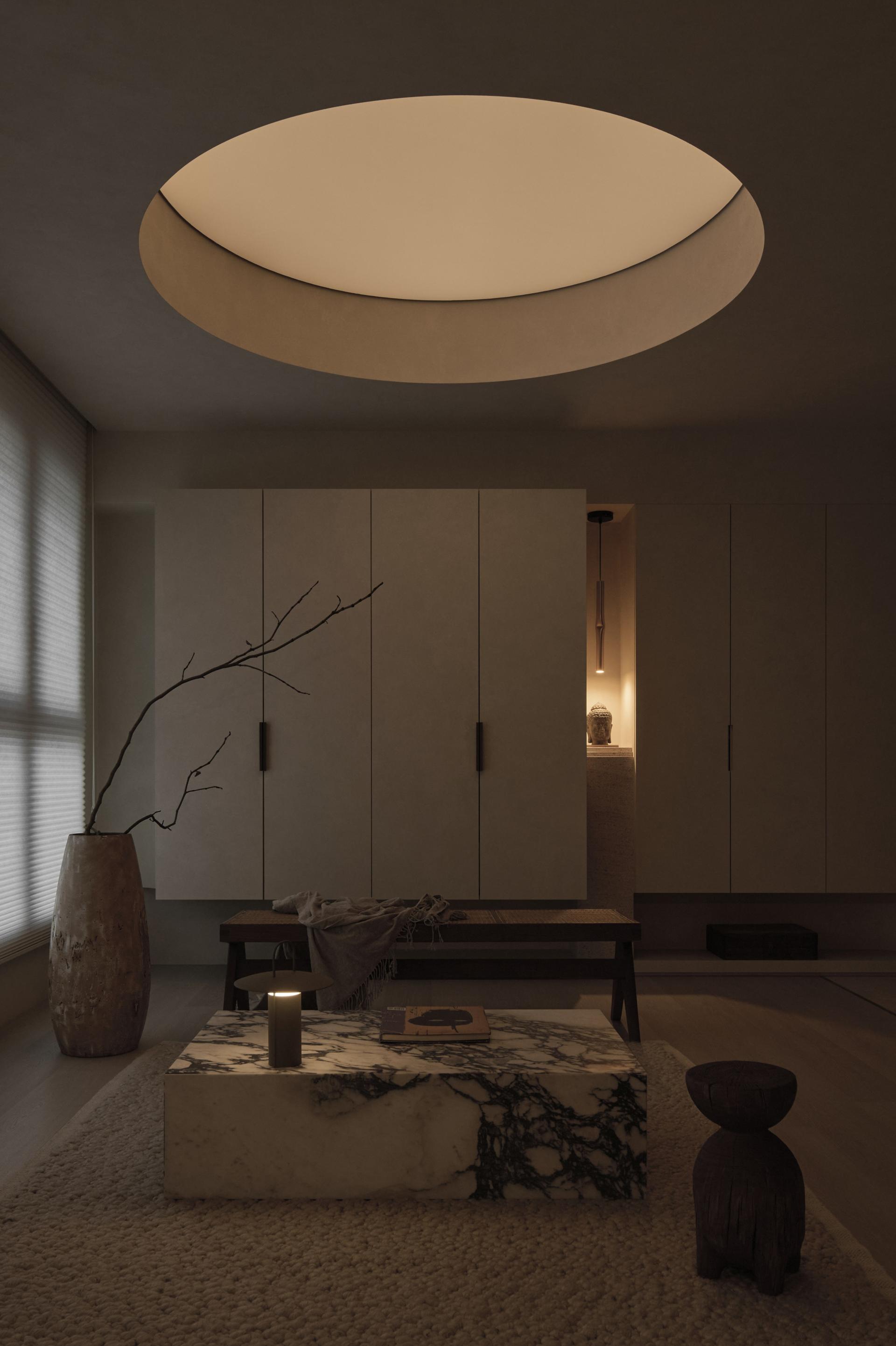 Without dominant walls or fixed orientations, furniture and functions can adapt to changing needs, turning the home into a stage for evolving daily life. Materiality and lighting further enhance this flexibility: mineral-based finishes and wood surfaces soften the interior, while circular ceiling lights—large for gatherings, small for solitude—create a poetic rhythm of light and shadow. Adjustable lighting levels respond to different moods and times of day, reinforcing the home’s fluid character.