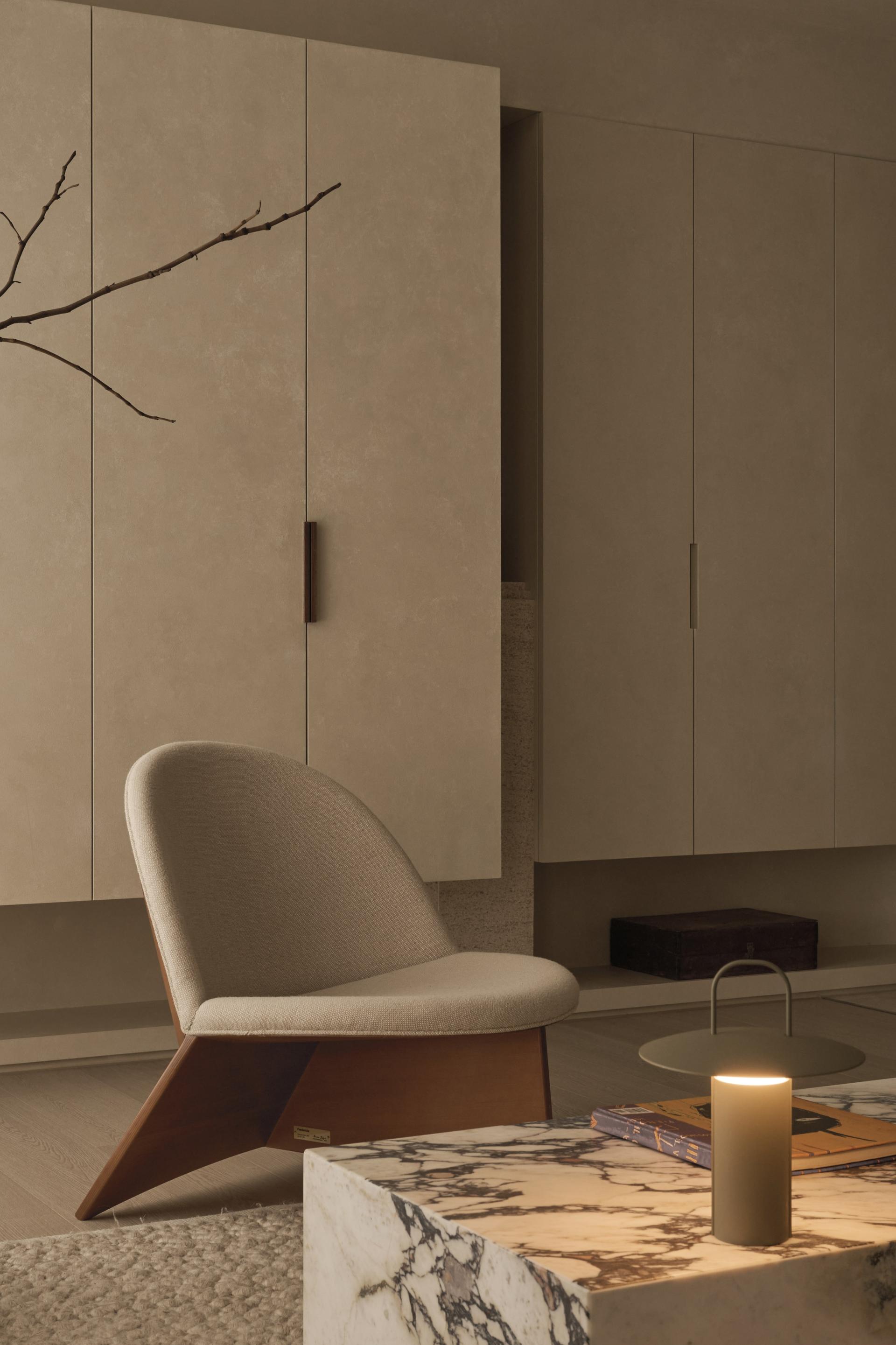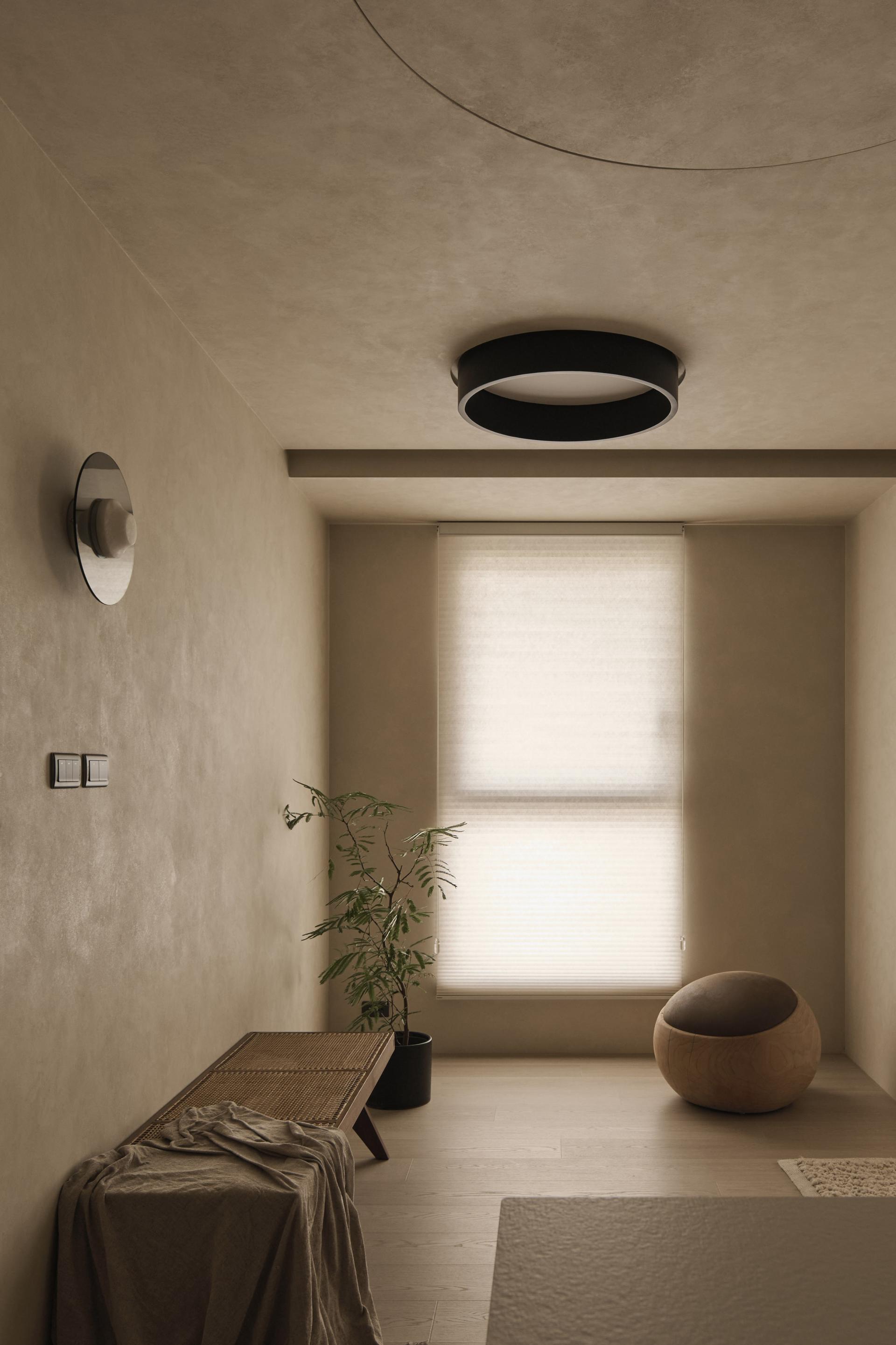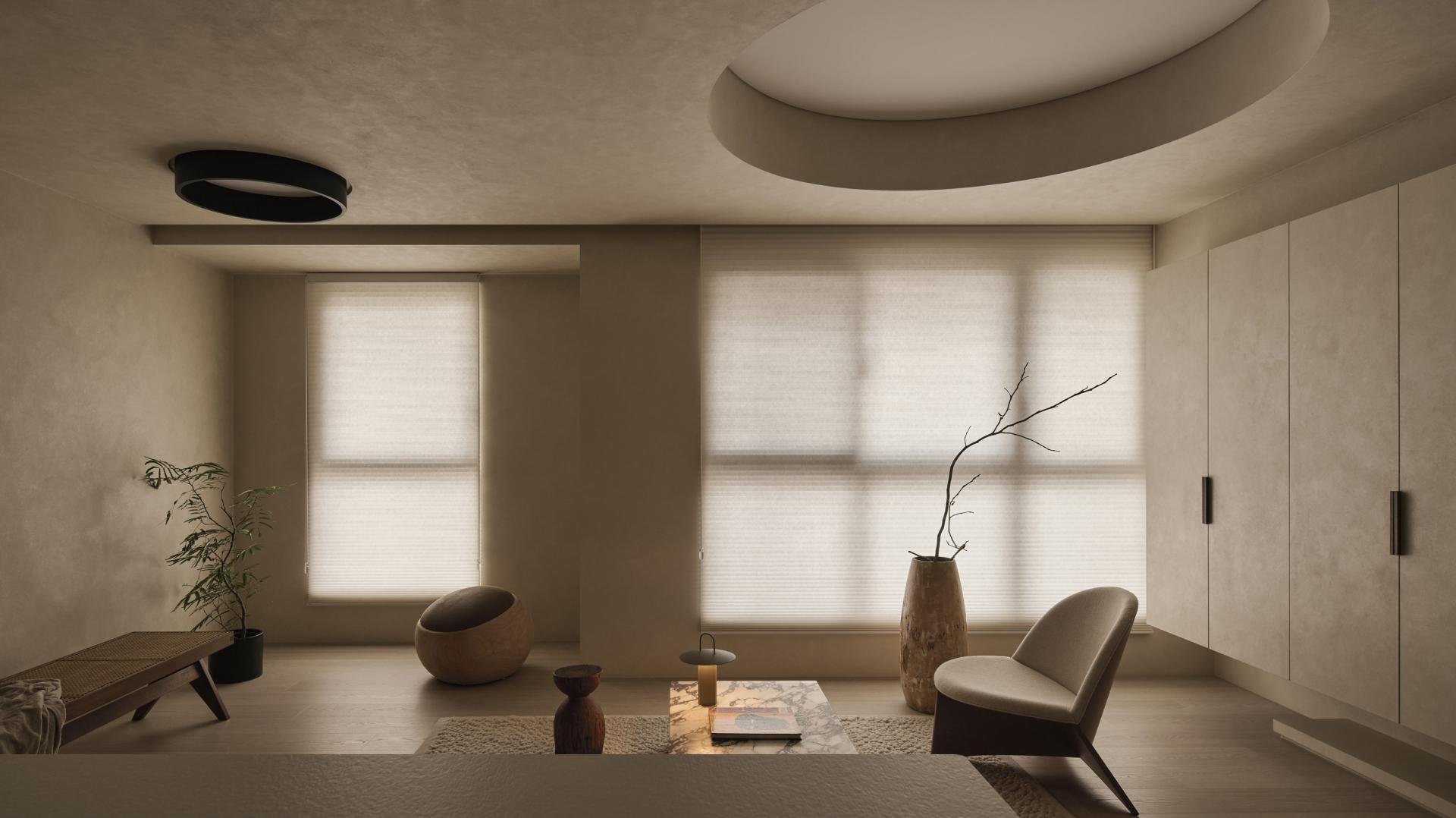 Without dominant walls or fixed orientations, furniture and functions can adapt to changing needs, turning the home into a stage for evolving daily life. Materiality and lighting further enhance this flexibility: mineral-based finishes and wood surfaces soften the interior, while circular ceiling lights—large for gatherings, small for solitude—create a poetic rhythm of light and shadow. Adjustable lighting levels respond to different moods and times of day, reinforcing the home’s fluid character.