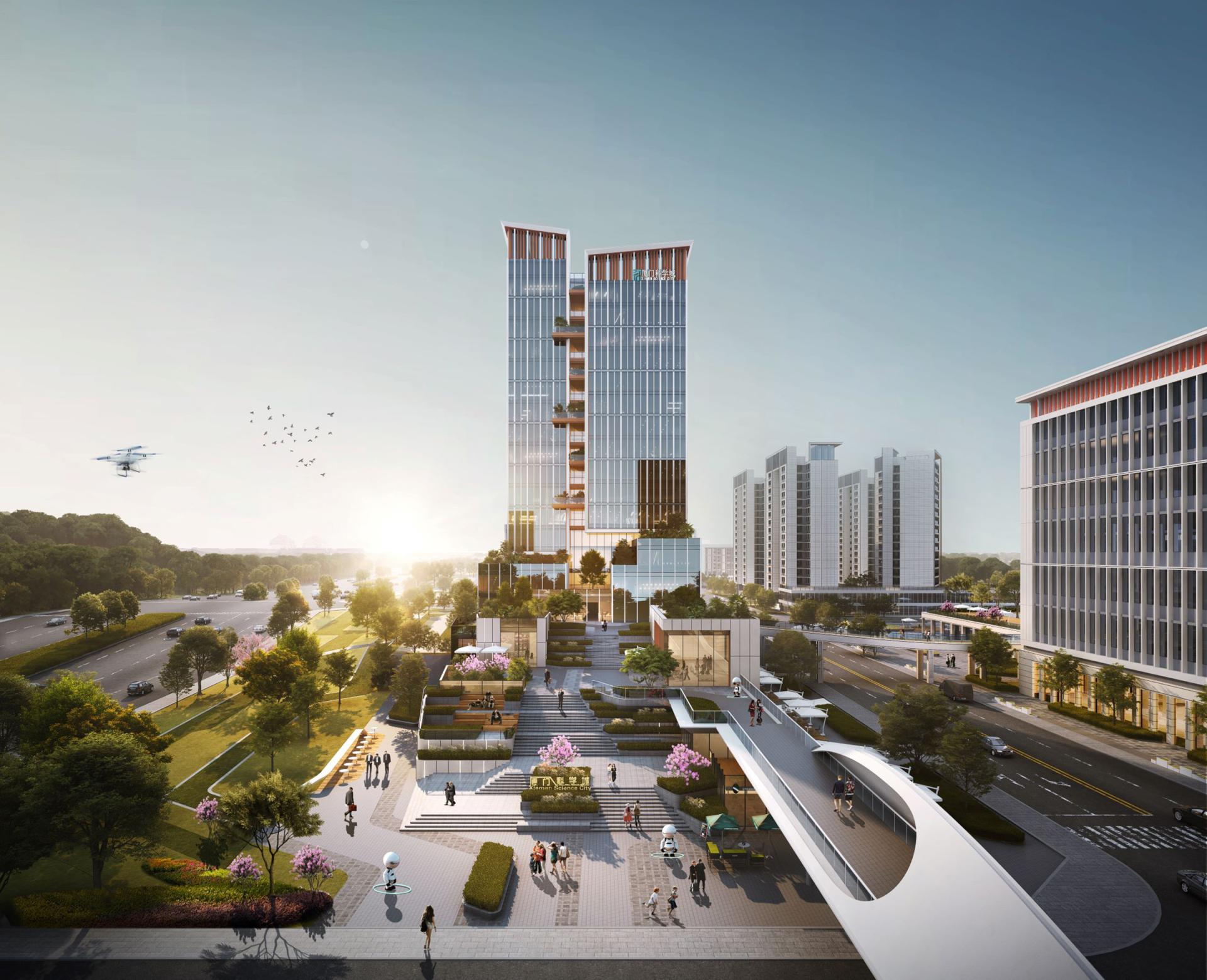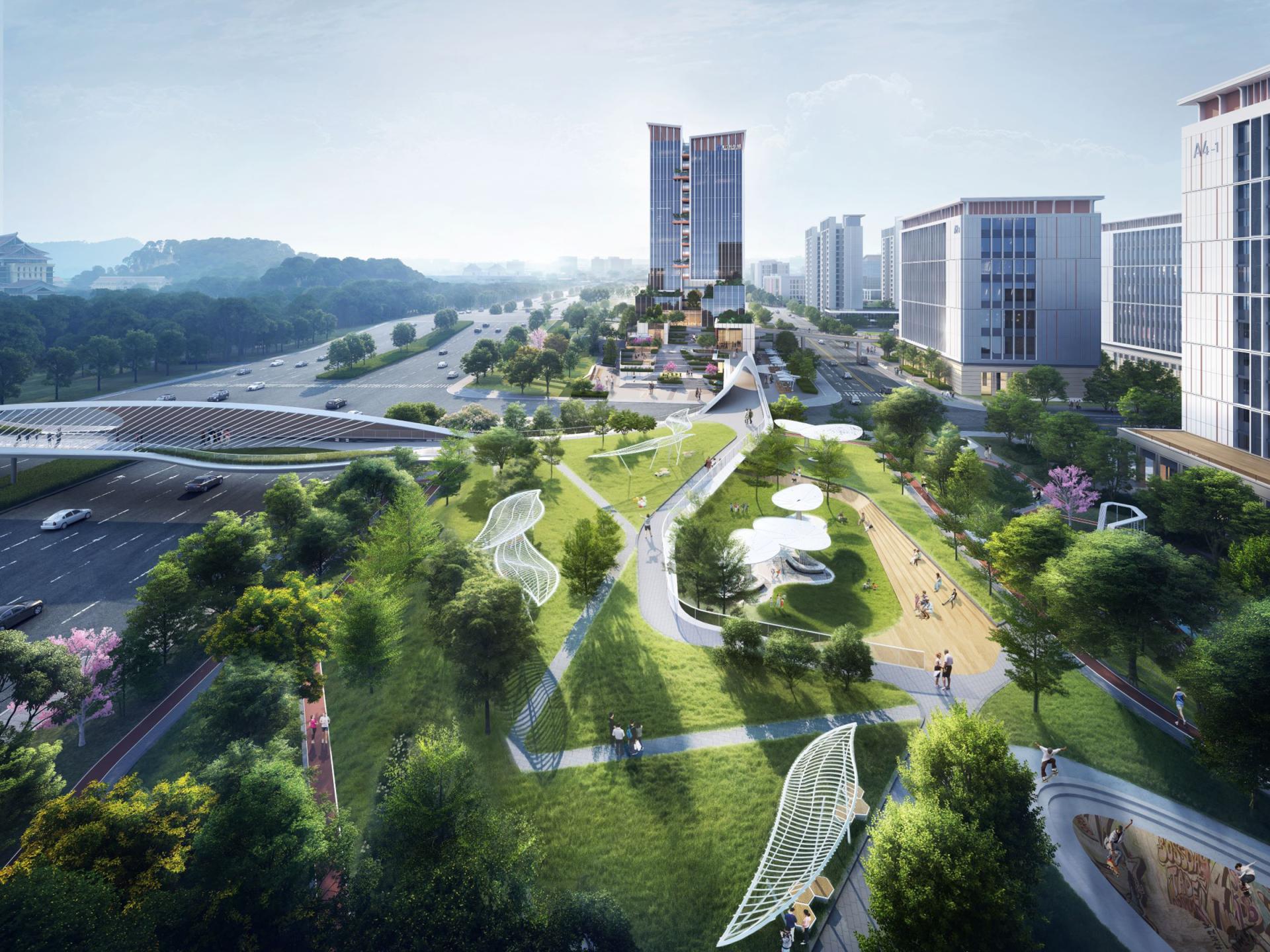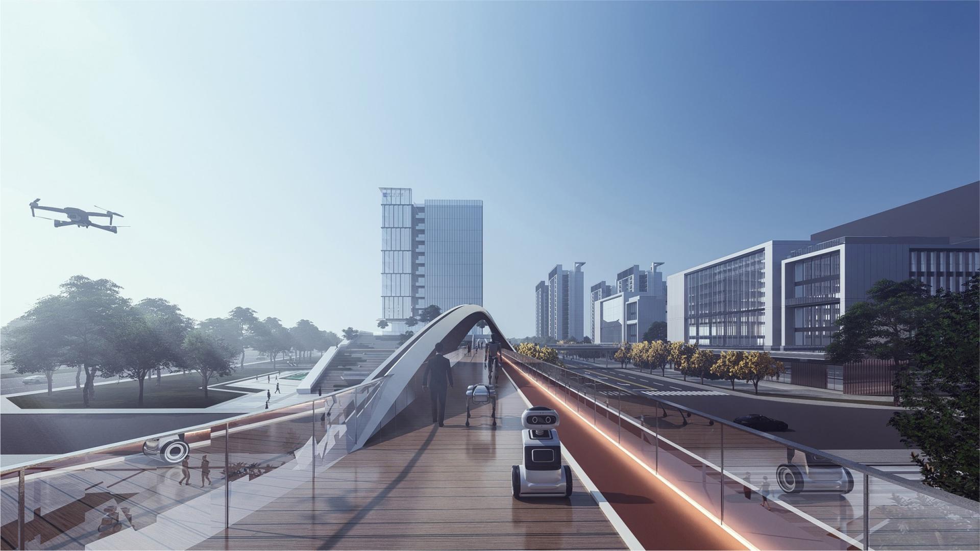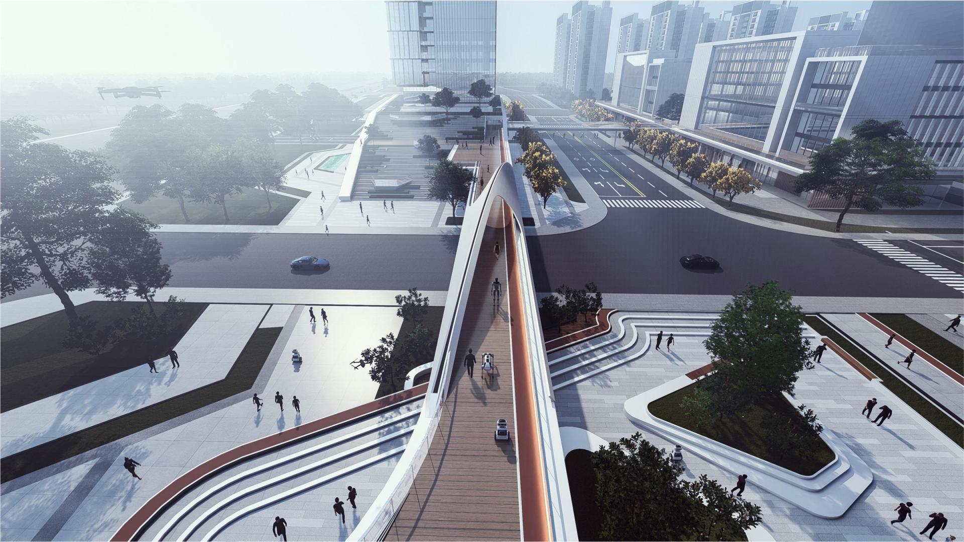 Innovation is achieved through multidimensional breakthroughs in space and function. Fast transit corridors guarantee efficiency for research and industry, while pedestrian-friendly zones encourage relaxation and social interaction, forming a natural urban rhythm. The landmark sky bridge links the northern municipal park with the innovation hub, extending greenery into the research zone and seamlessly blending nature with technology. The central courtyard acts as a shared reception and gathering space, filled with sunlight, water features, and greenery. Rooftop bridges, plazas, and commercial streets create a continuous landscape experience that encourages exchange and cultural vitality. Flexible layouts accommodate diverse industries, fostering an atmosphere where creativity, ecology, and art coexist.