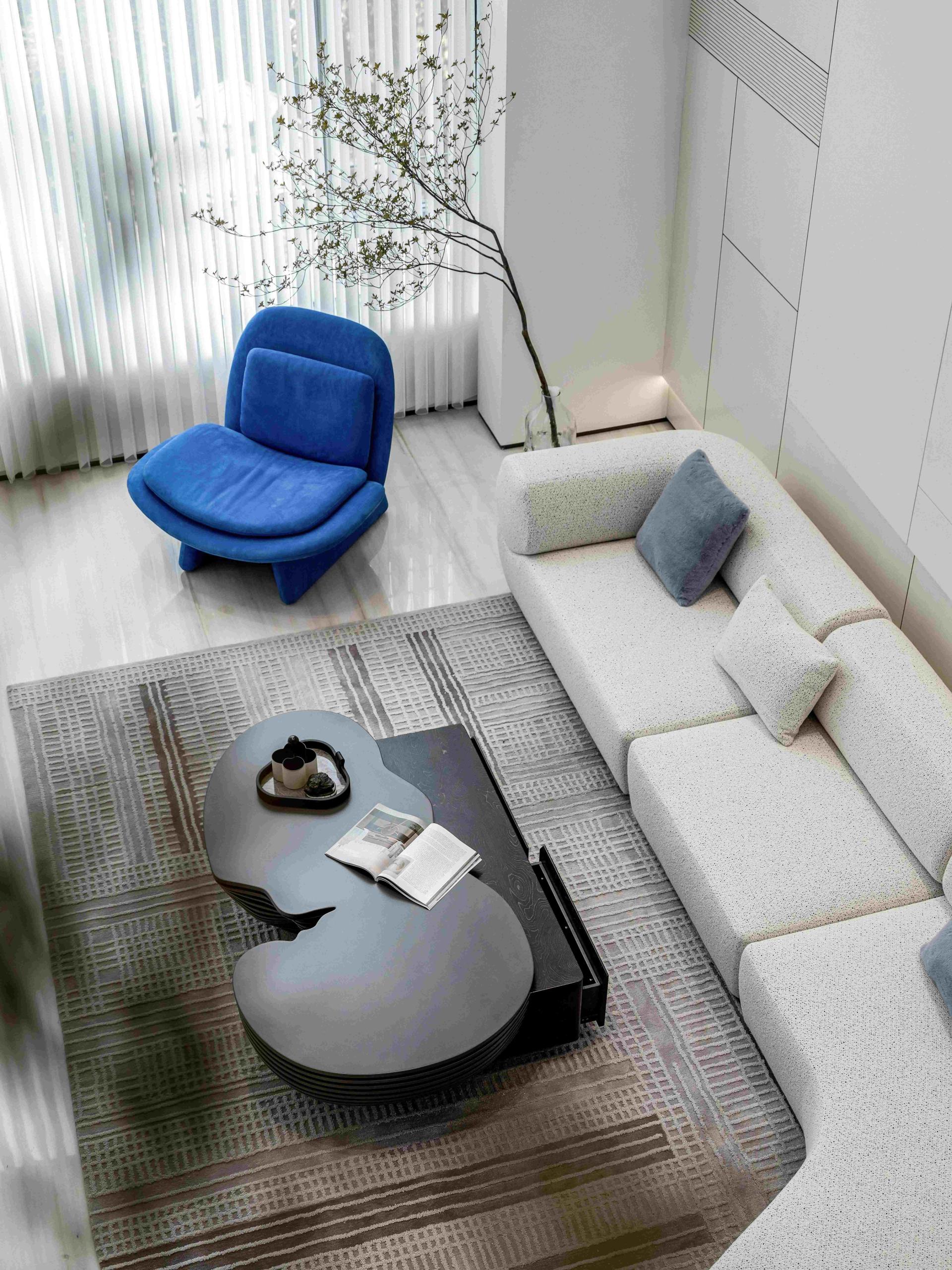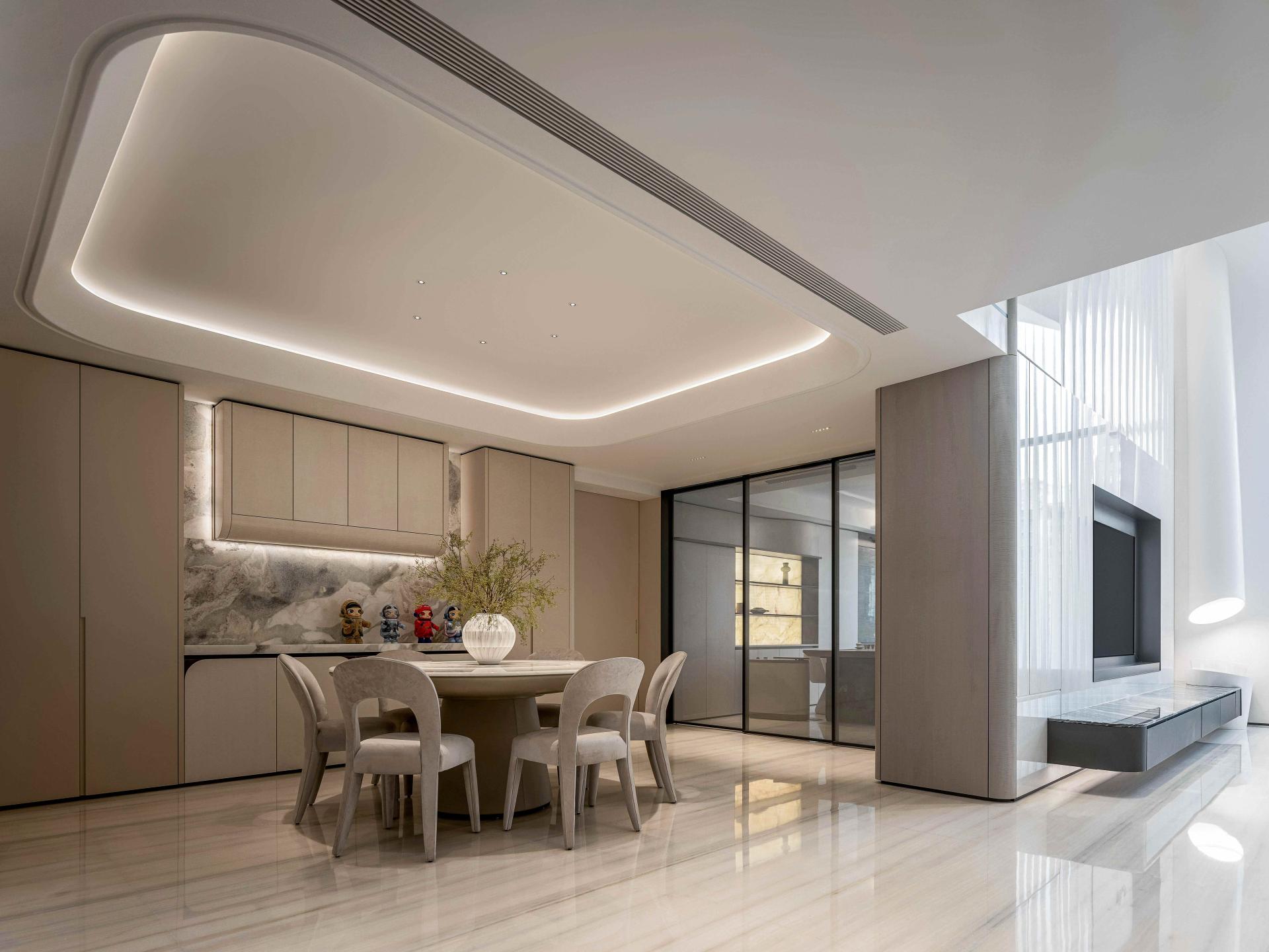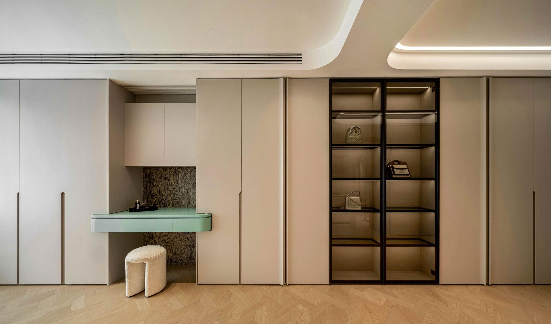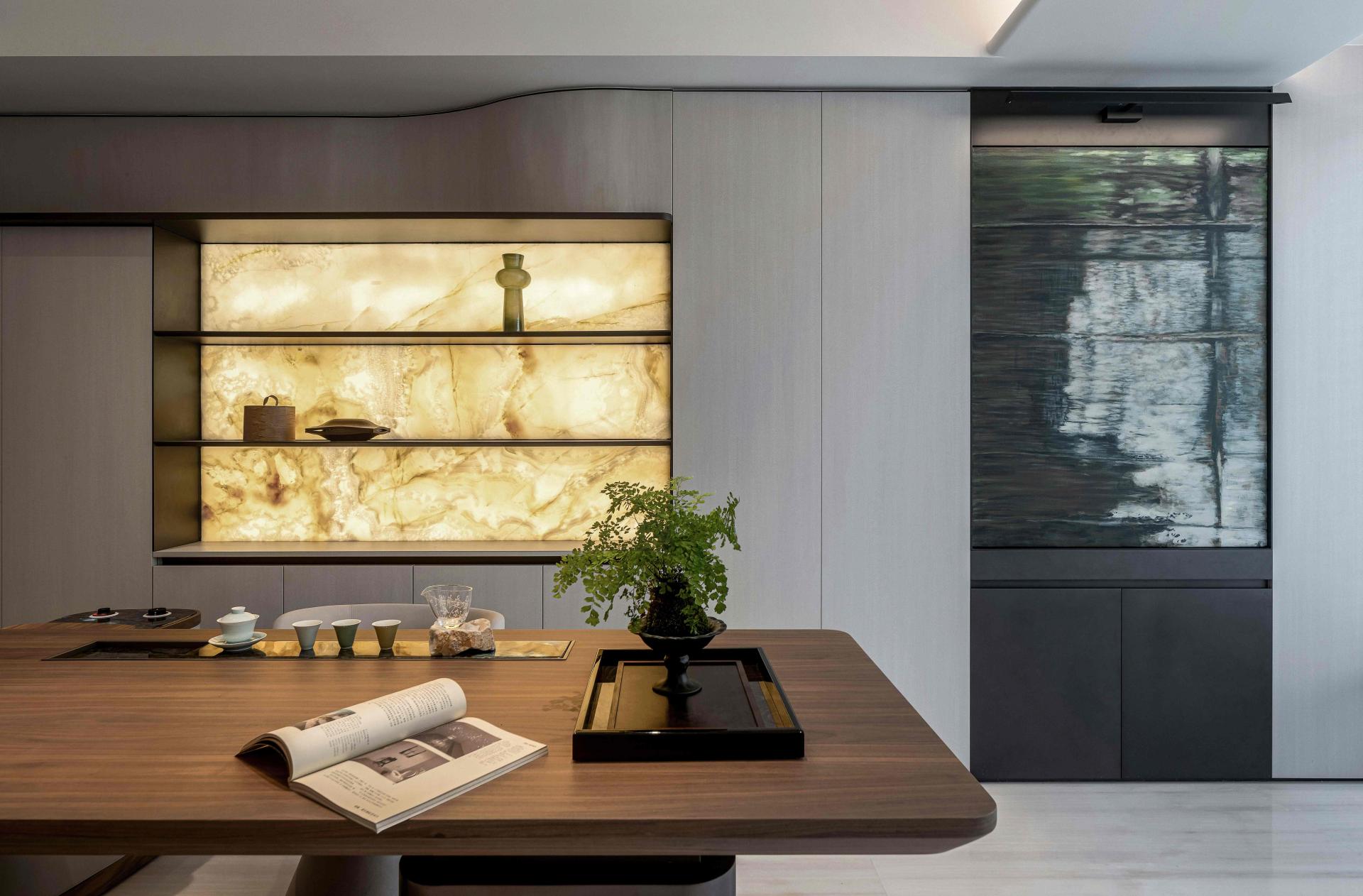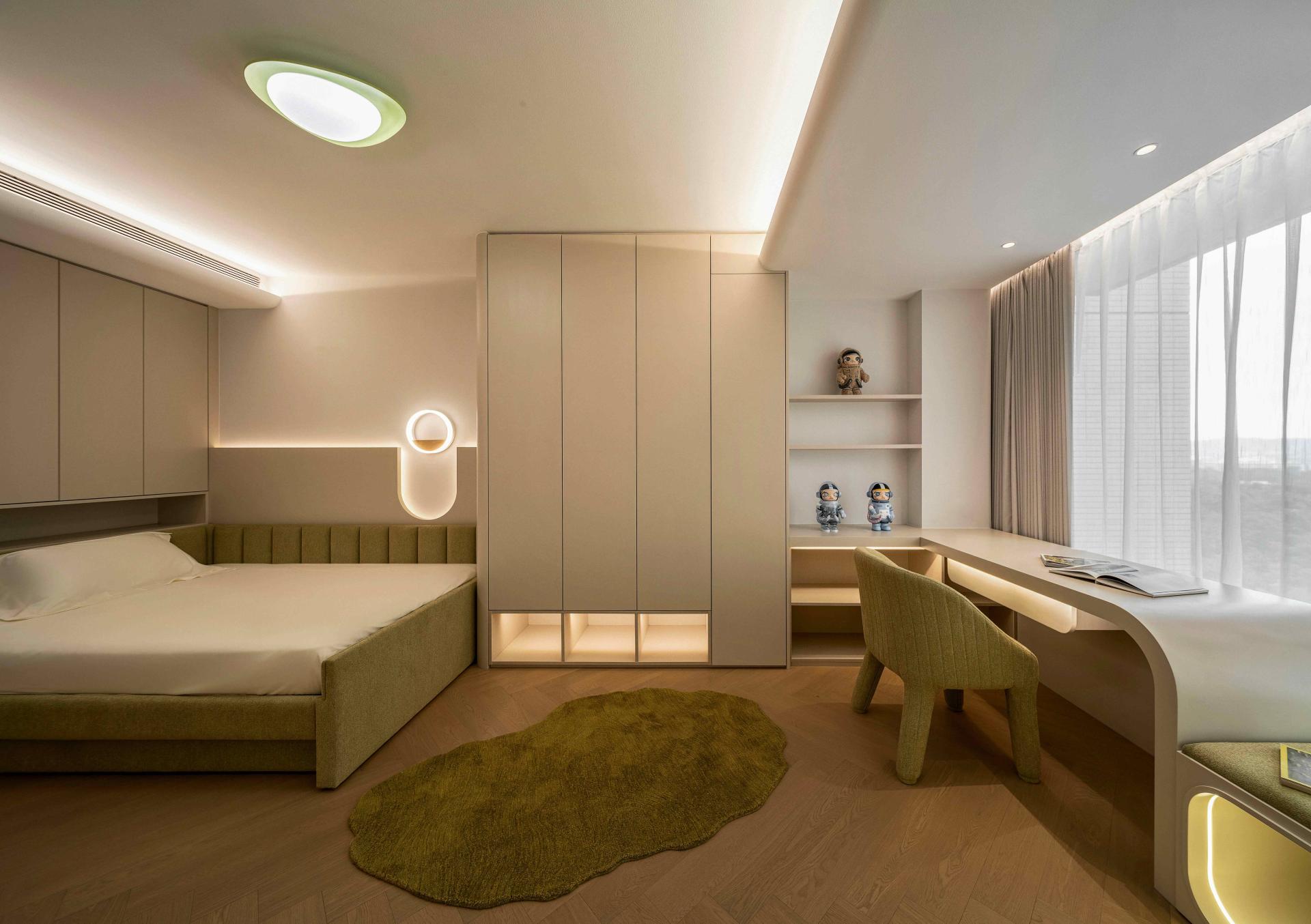 Each functional area demonstrates tailored innovation: the entrance doubles as a tea lounge, private meeting space, and smart pet zone; the dining area integrates dual prep zones for daily and entertaining use; the tea room accommodates musical performance alongside intimate gatherings; the living room evolves from a rigid cubic form into a flowing, horizontally extended space; the children’s room combines study, play, rest, and storage through a custom tatami system; the mezzanine passage incorporates a water bar, enhancing transition spaces; and the master suite maximizes storage while creating multiple lifestyle zones.