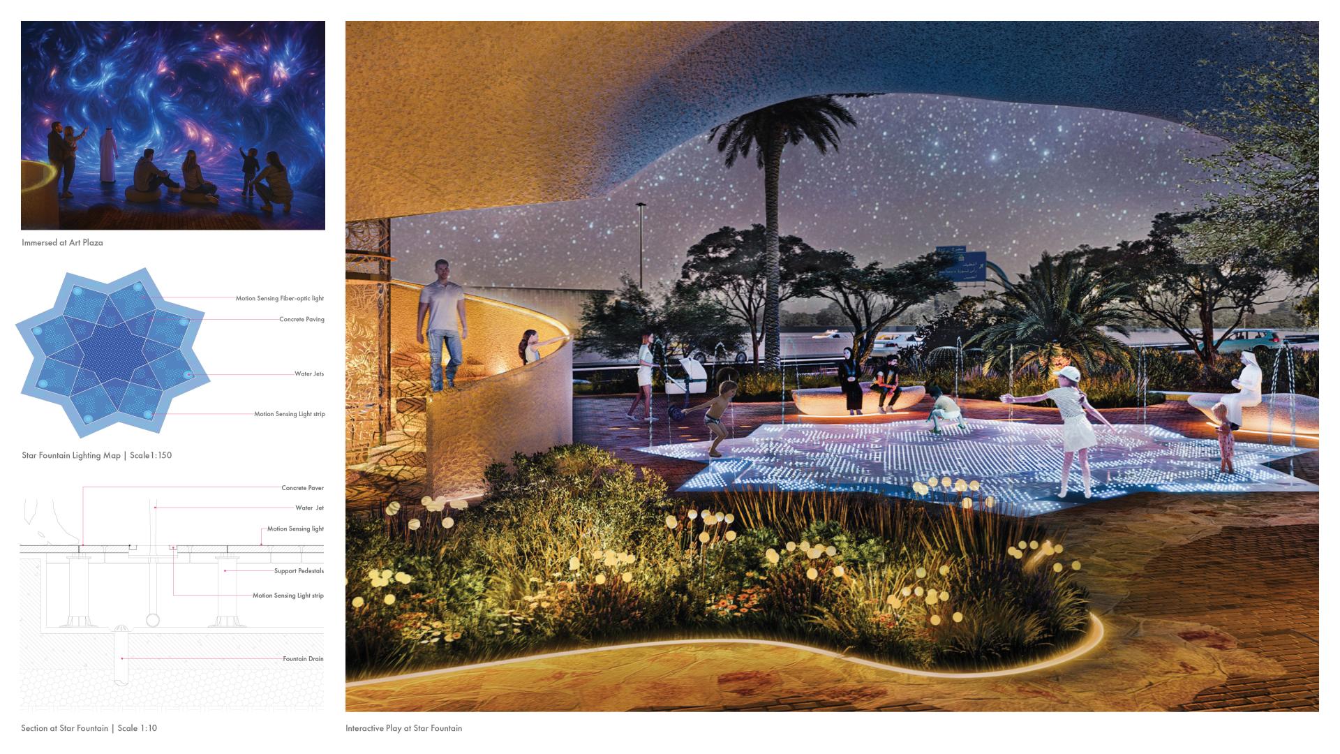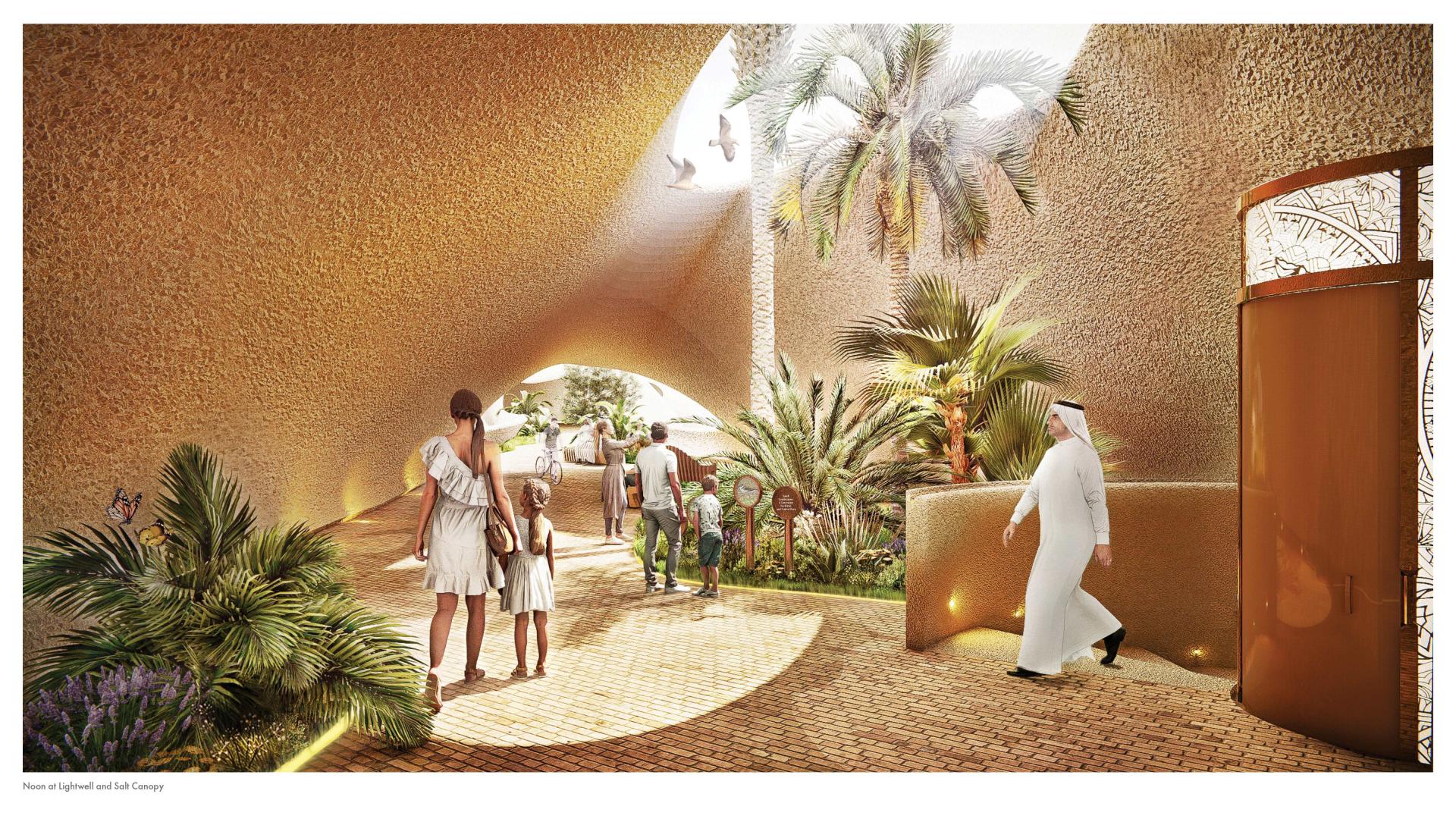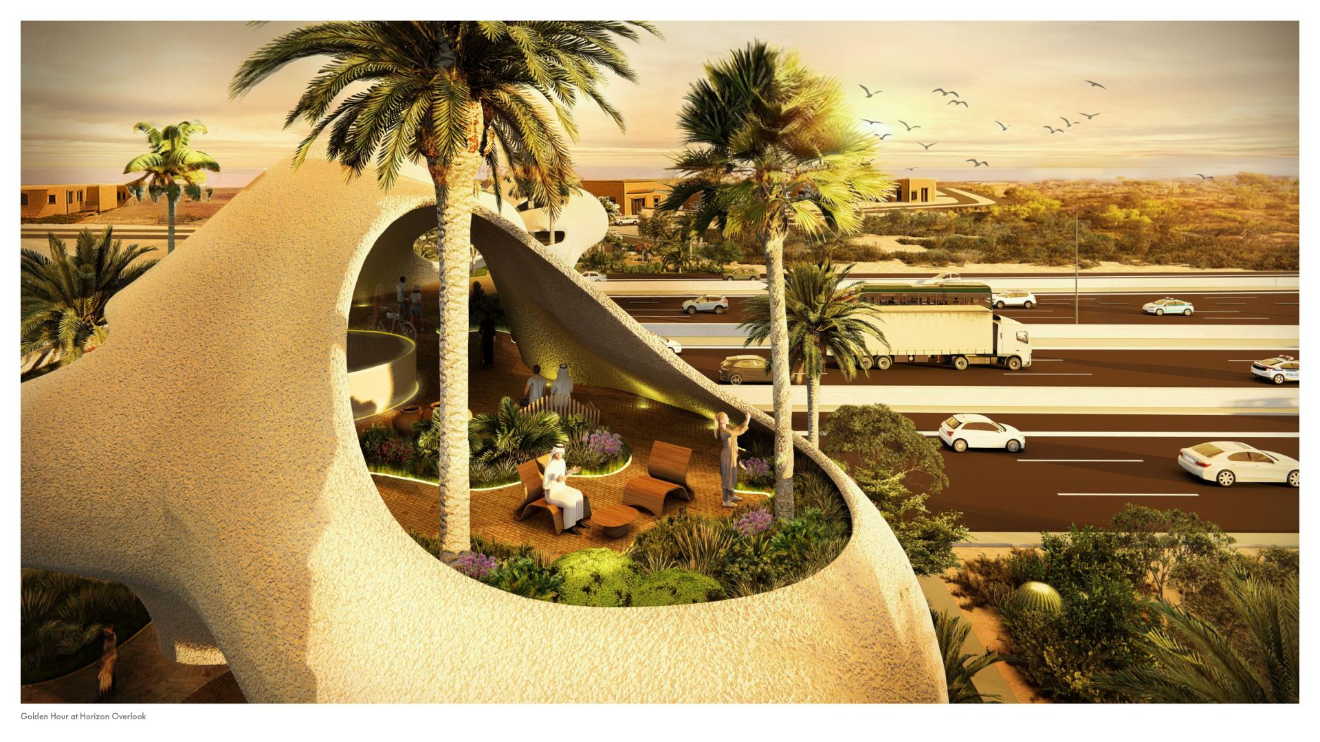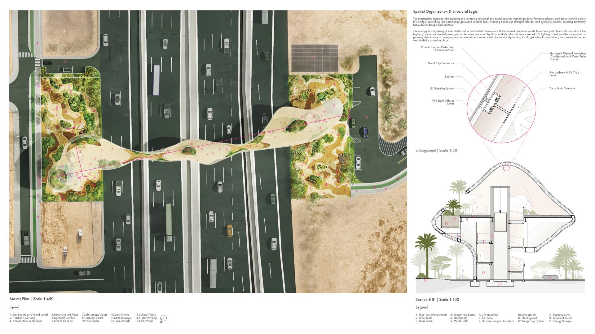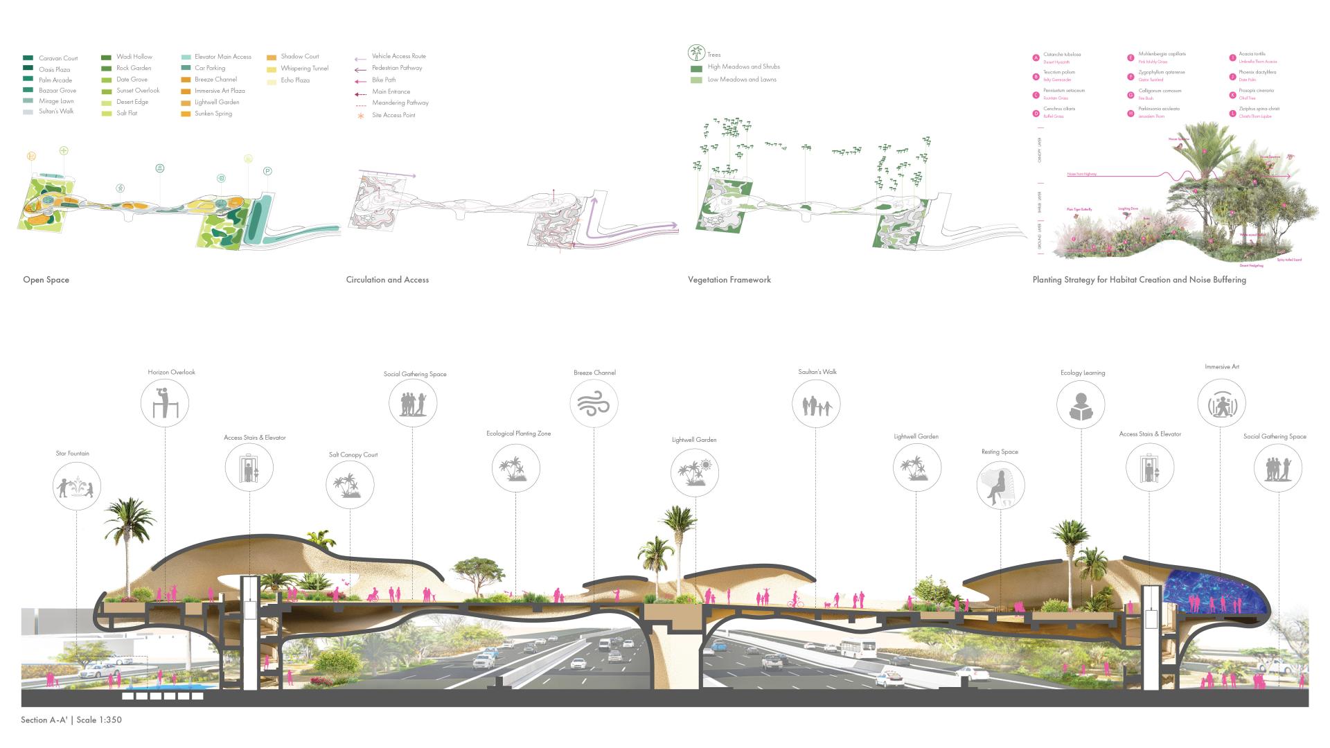 The crossing integrates layered ecological and social spaces: shaded gardens, elevated walkways, and gathering areas woven into a porous canopy. These create microclimates of respite in the harsh desert, combining native planting with interactive art, water features, and educational installations. Visitors encounter immersive projections, cultural narratives, and panoramic overlooks, forging links between land, memory, and future growth.