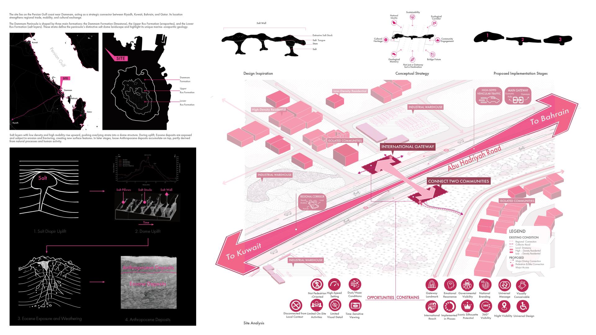 This project reimagines Abu Hadriyah Road in Dammam as more than a transport corridor—it becomes a monumental gateway rooted in the geology and culture of Eastern Arabia. Inspired by the Rus Formation, vast salt beds lying beneath the desert, the design rises as a sculptural canopy shaped by the natural process of salt uplift. The form transforms infrastructure into a symbolic landmark that unites heritage, ecology, and mobility.