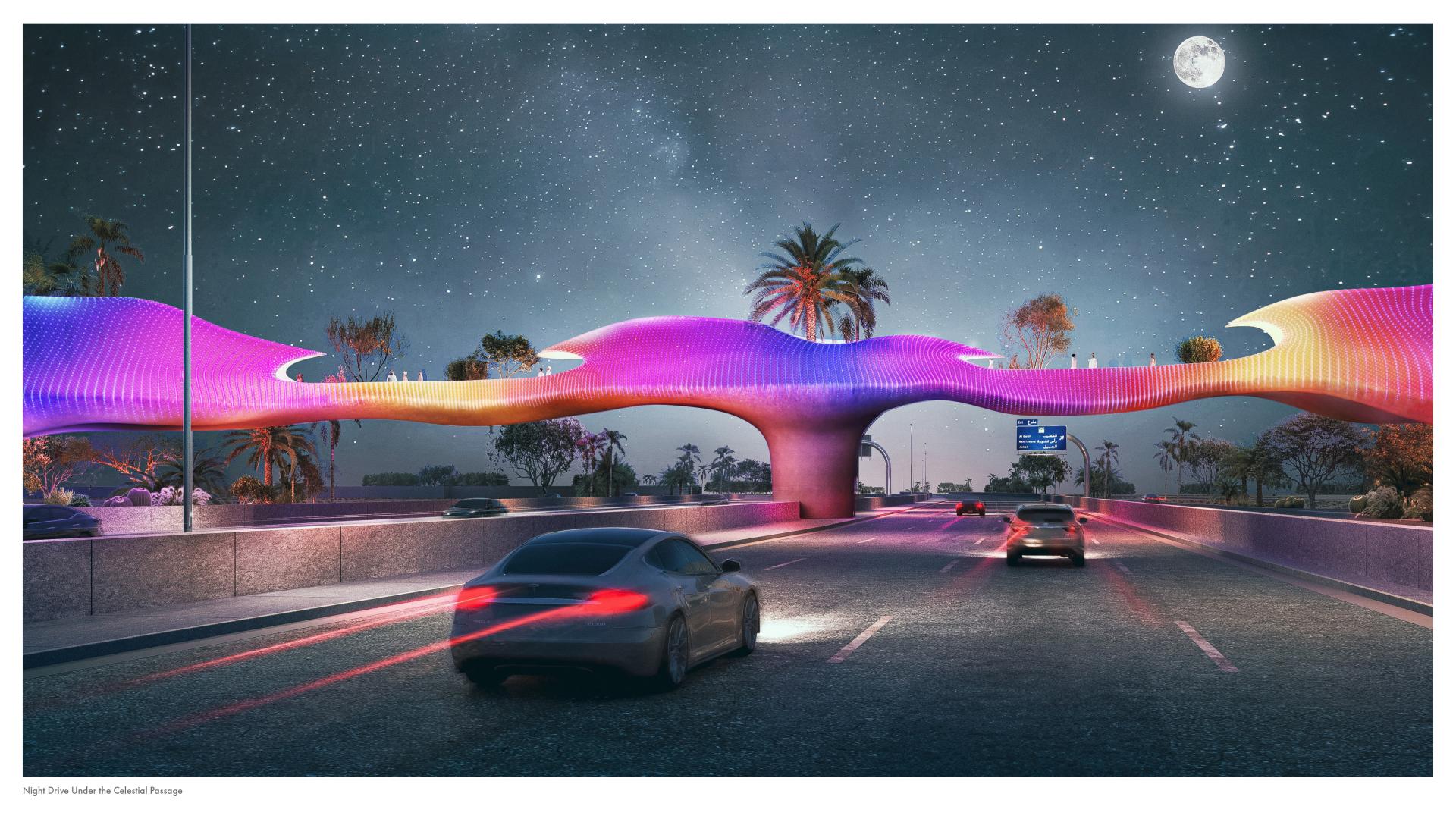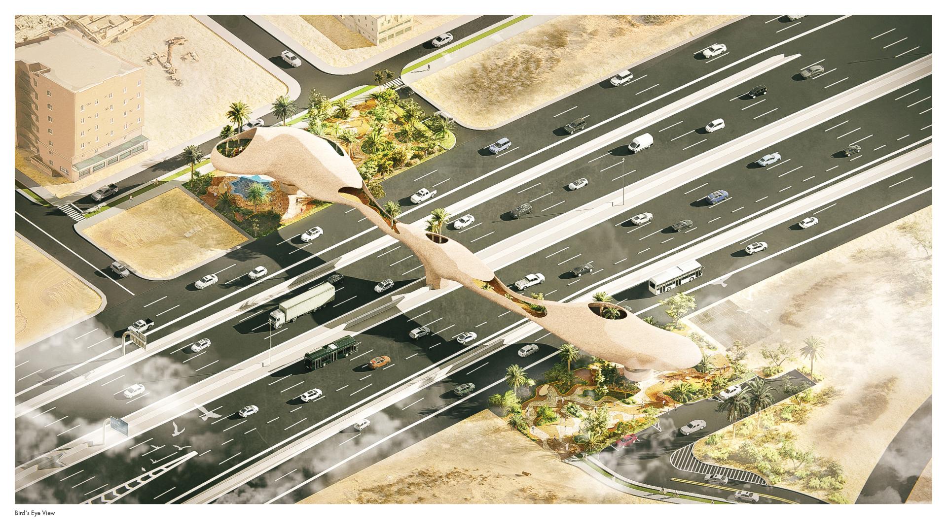 Sustainability is embedded in the design through lightweight shell structures, passive cooling strategies, renewable energy integration, and planting systems that encourage biodiversity. The project transforms leftover highway space into an active ecological corridor, while also improving safety by providing pedestrian and cycling connections across the road.