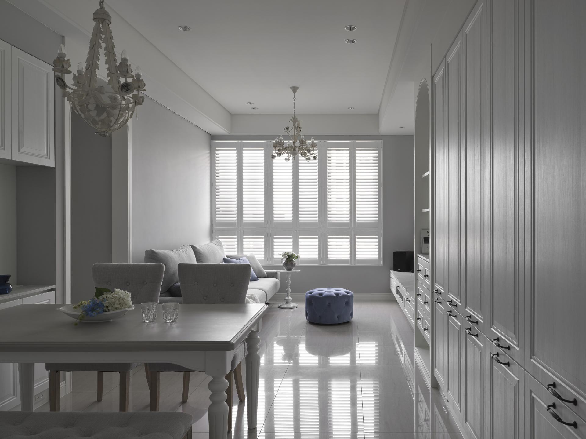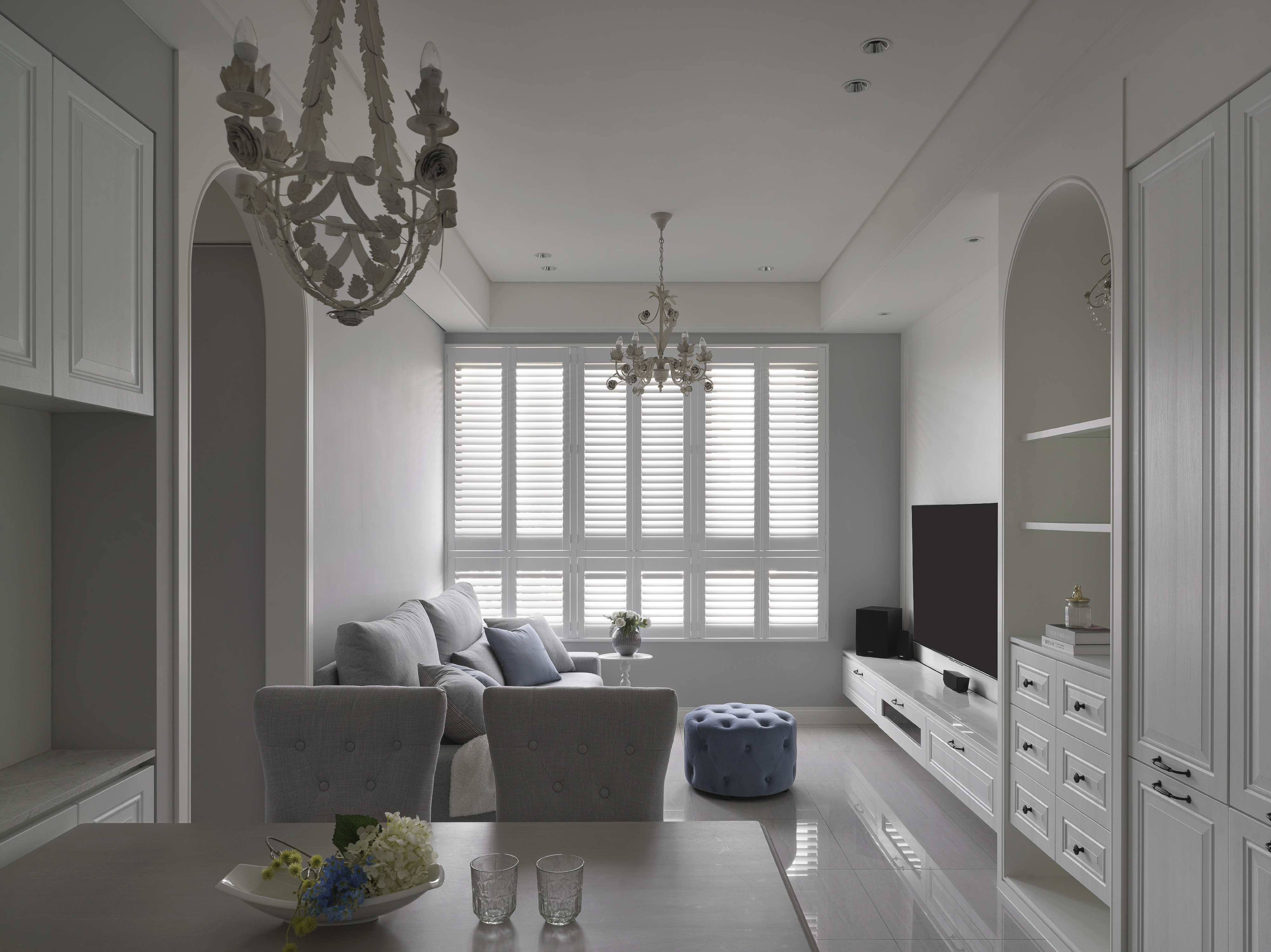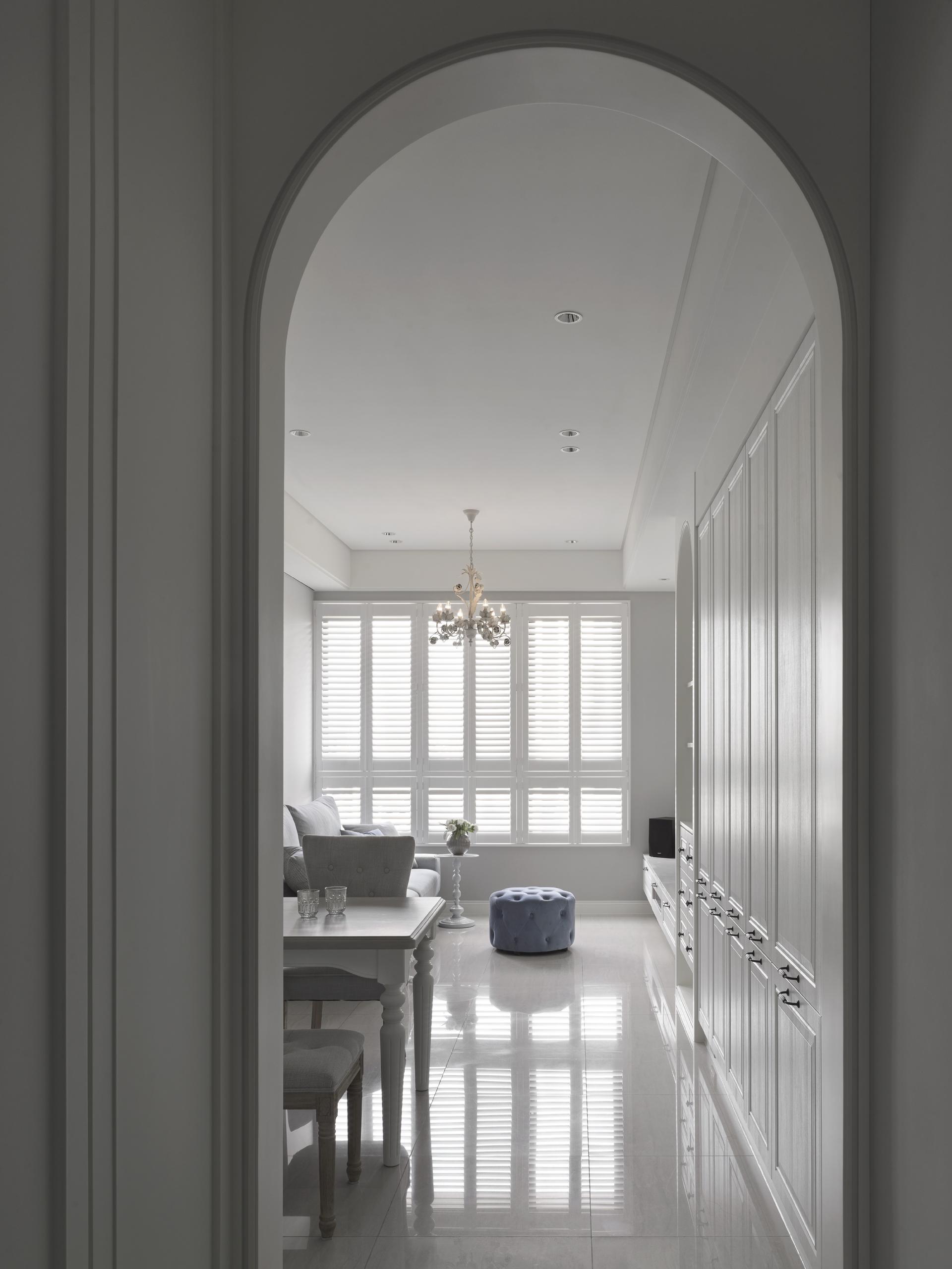As the first light of dawn filters through the blinds, the serene interior is transformed into a captivating stage where shadows and light intertwine, creating a soft, dreamy ambiance. The designer carefully created a palette of white, gray, and blue, and paired arched thresholds with intricate European chandeliers. Each element reflects the homeowner's princess dream, blending classical romance with a modern narrative. The meticulous attention to detail strikes a poised balance between practicality and aesthetics.
