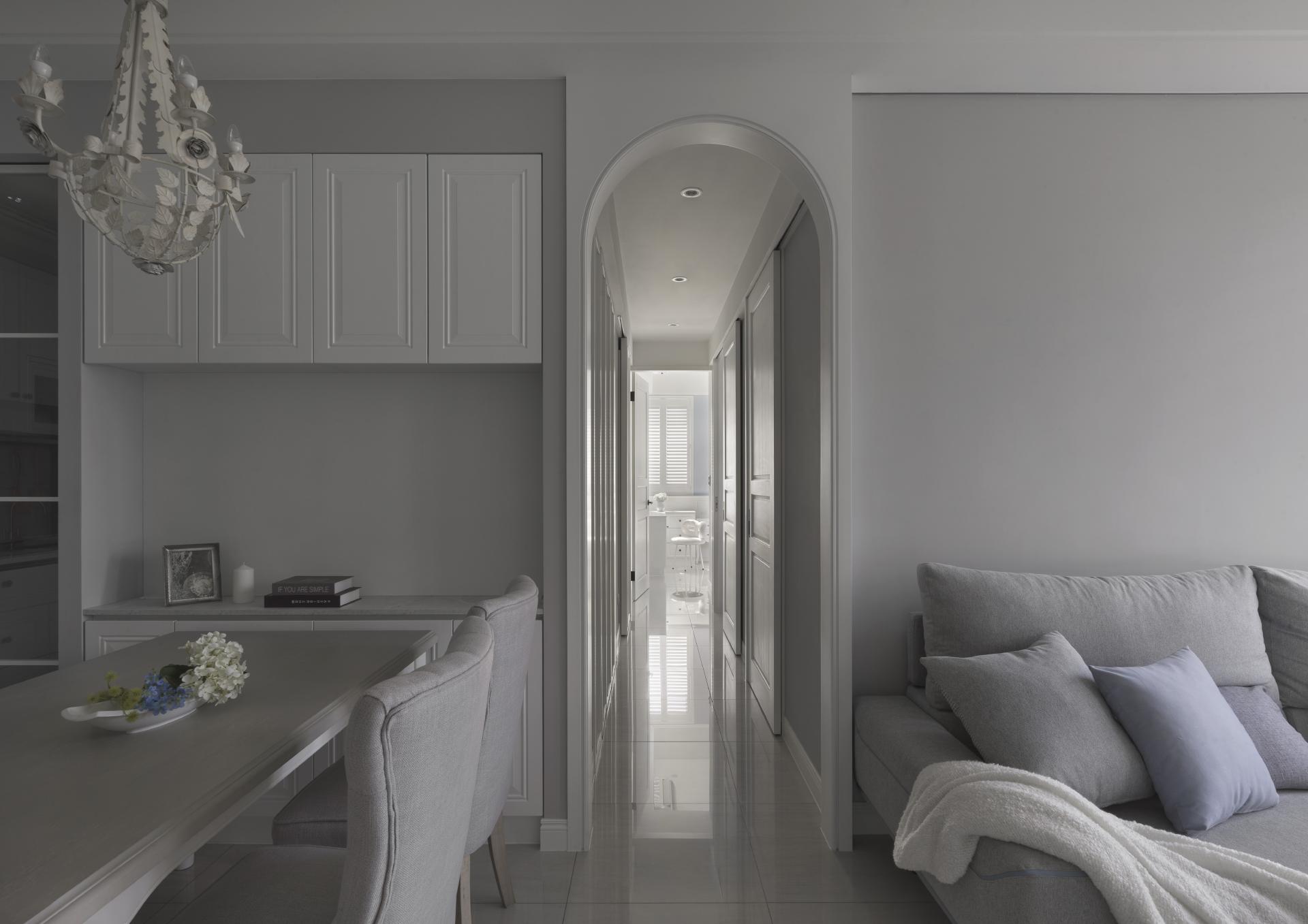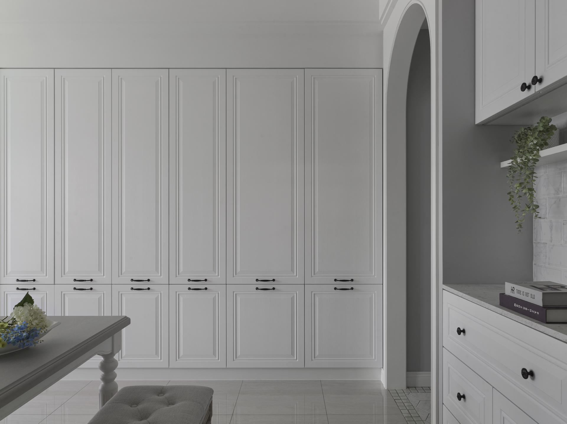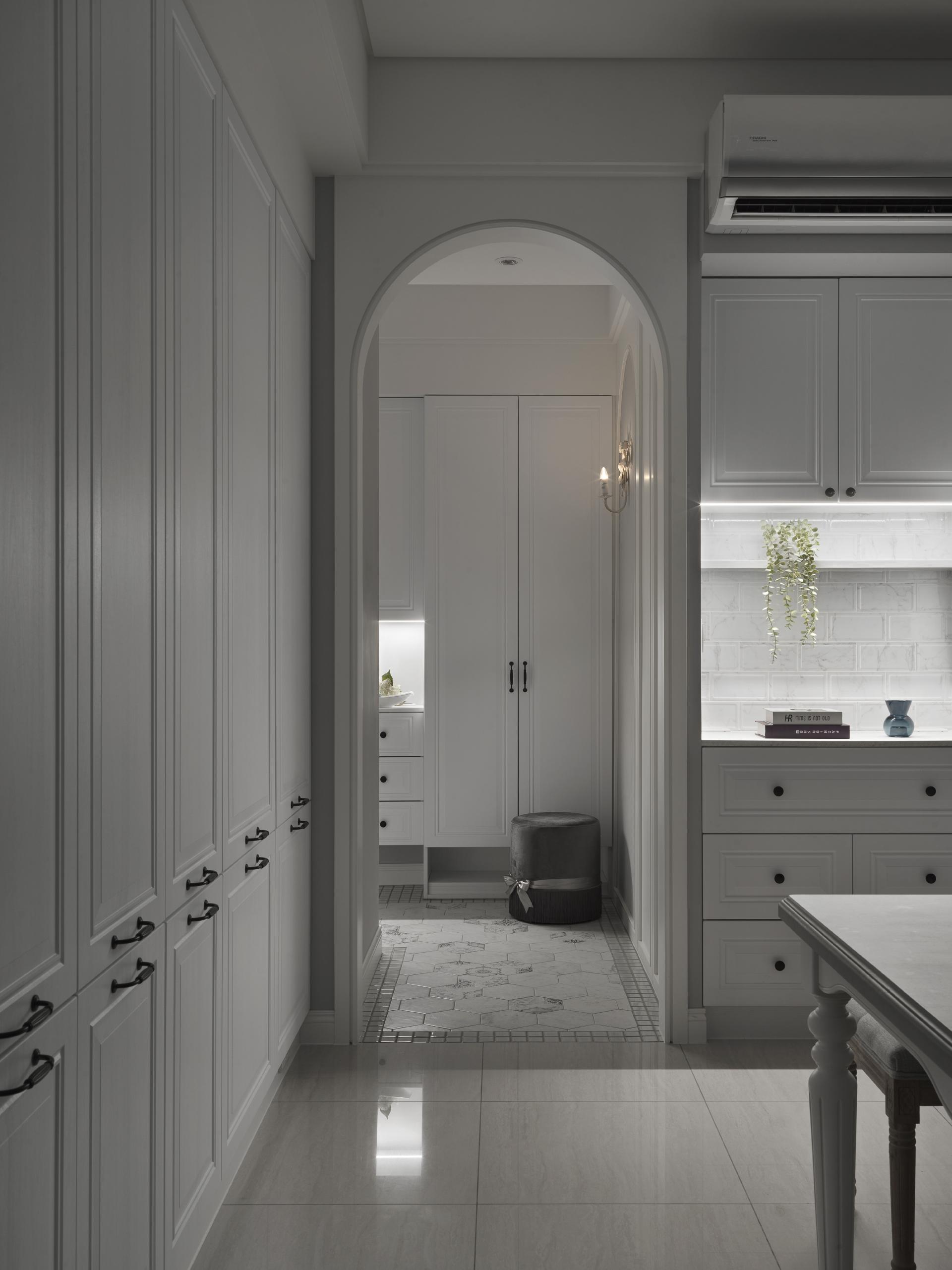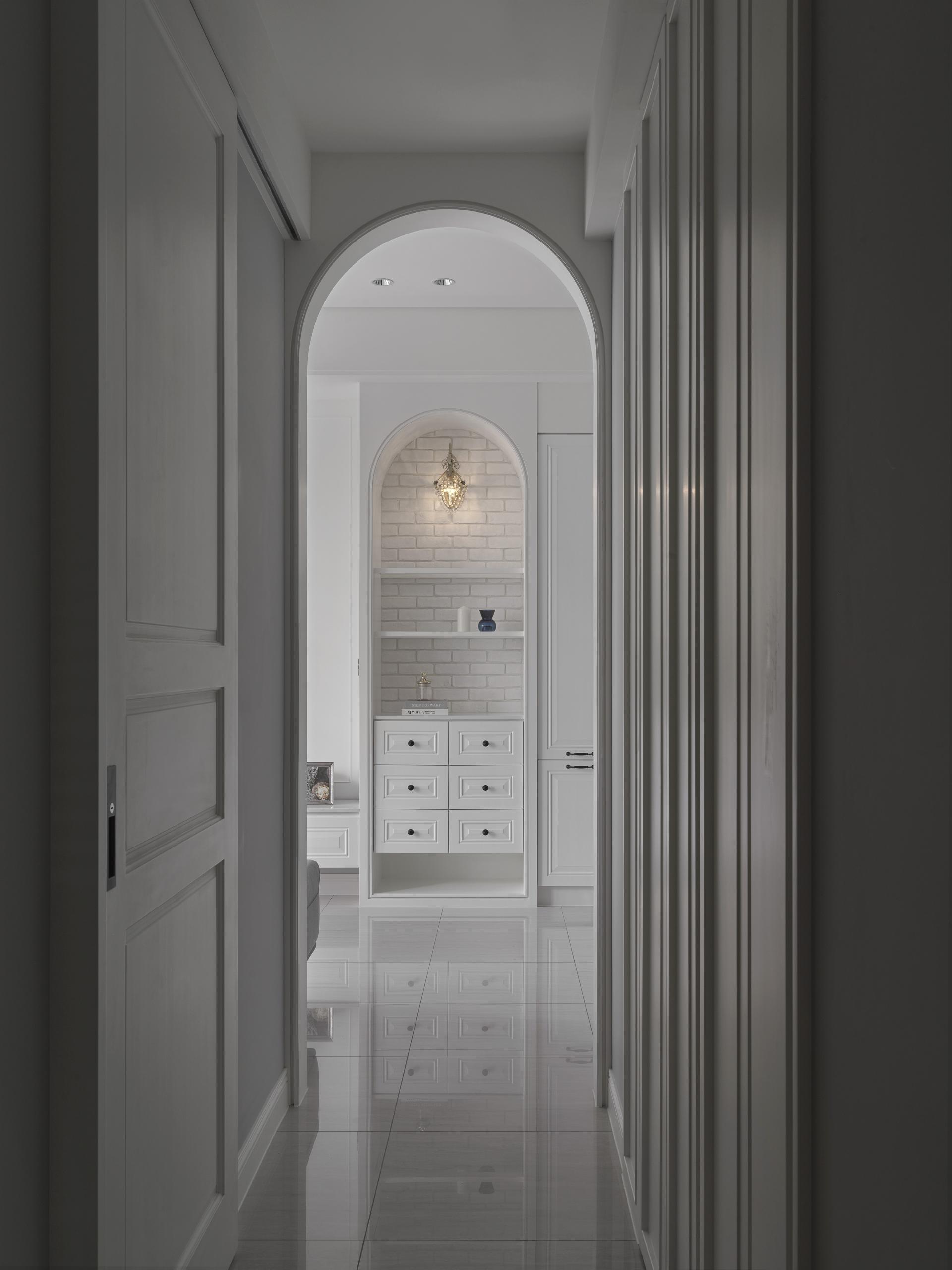 This project establishes its essential color palette of white, gray, and blue, unified by low-saturation hues that blend seamlessly across walls, furniture, and furnishings to create a serene and gentle home atmosphere. The finishes avoid ornate detailing, instead emphasizing streamlined molding and arched frames. These choices replace the typical grandeur of the neoclassical style with a more understated, modern American elegance. Complementing this restraint, European-style light fixtures with intricate silhouettes bring a refined decorative accent, enriching the visual depth and imbuing the space with subtle sophistication.
