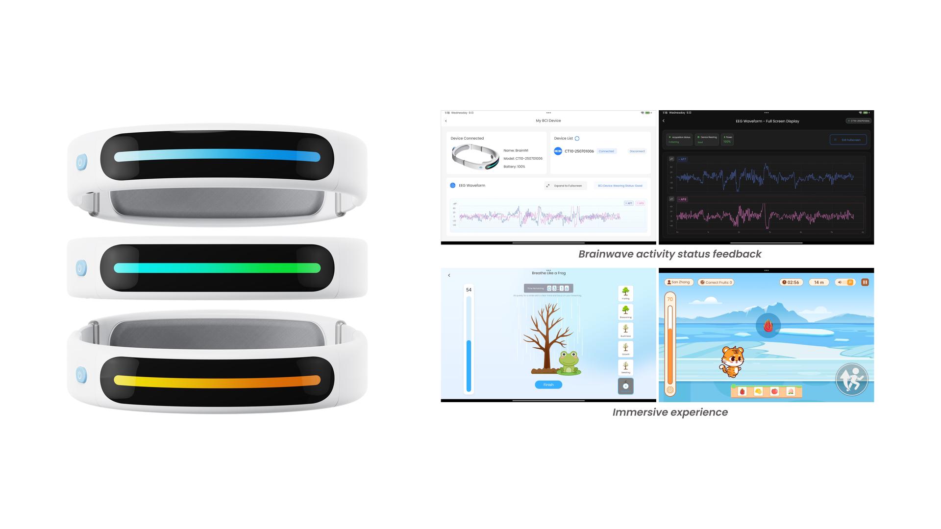 Breaking free from the traditional "bulky, lab-centric" image of brain-computer interfaces, this device establishes a new design paradigm with its lightweight, circular structure and sleek, minimalist, high-tech aesthetic. The intuitive rotary knob replaces traditional straps for quick and easy adjustment. Modular magnetic electrode pads eliminate inefficient factory repairs, demonstrating a deep understanding of user needs in its design. The large black mirrored surface combined with dynamic lighting effects gives the device strong recognition and a futuristic, high-tech presence, elevating it from a mere medical tool to a smart wearable that provides emotional value. The design features an integrated circular structure with a white base tone, conveying pure technological sophistication. A black functional area creates a visual focal point, while a colorful light strip provides an immersive user experience through breathing and rhythmic effects. In terms of material selection, silicone side wings ensure both skin-friendliness and safety, the woven back cushion offers comfort and breathability, and internal sponge padding ensures a light and snug fit. The IML-crafted panel appears as a smooth, understated mirror when idle; once activated, the flowing lights resemble a stage coming alive, vividly demonstrating the aesthetic contrast between "stillness" and "motion." The design revolves around three core principles: "seamless, intuitive, and flexible." Five front-mounted electrodes precisely conform to the forehead, ensuring stable EEG data collection. The rotary knob enables quick and easy fitting, avoiding complex operations. The magnetic electrode pads, with their dual-layer structure, accommodate various head shapes, showcasing the design's inclusivity for individual differences. LED light effects transform abstract data feedback into perceptible visual signals, allowing users to intuitively understand the device's status through changes in light color. This interactive visualization, an extension of its functionality, makes the BCI device less impersonal, fostering a sense of closeness in its use.