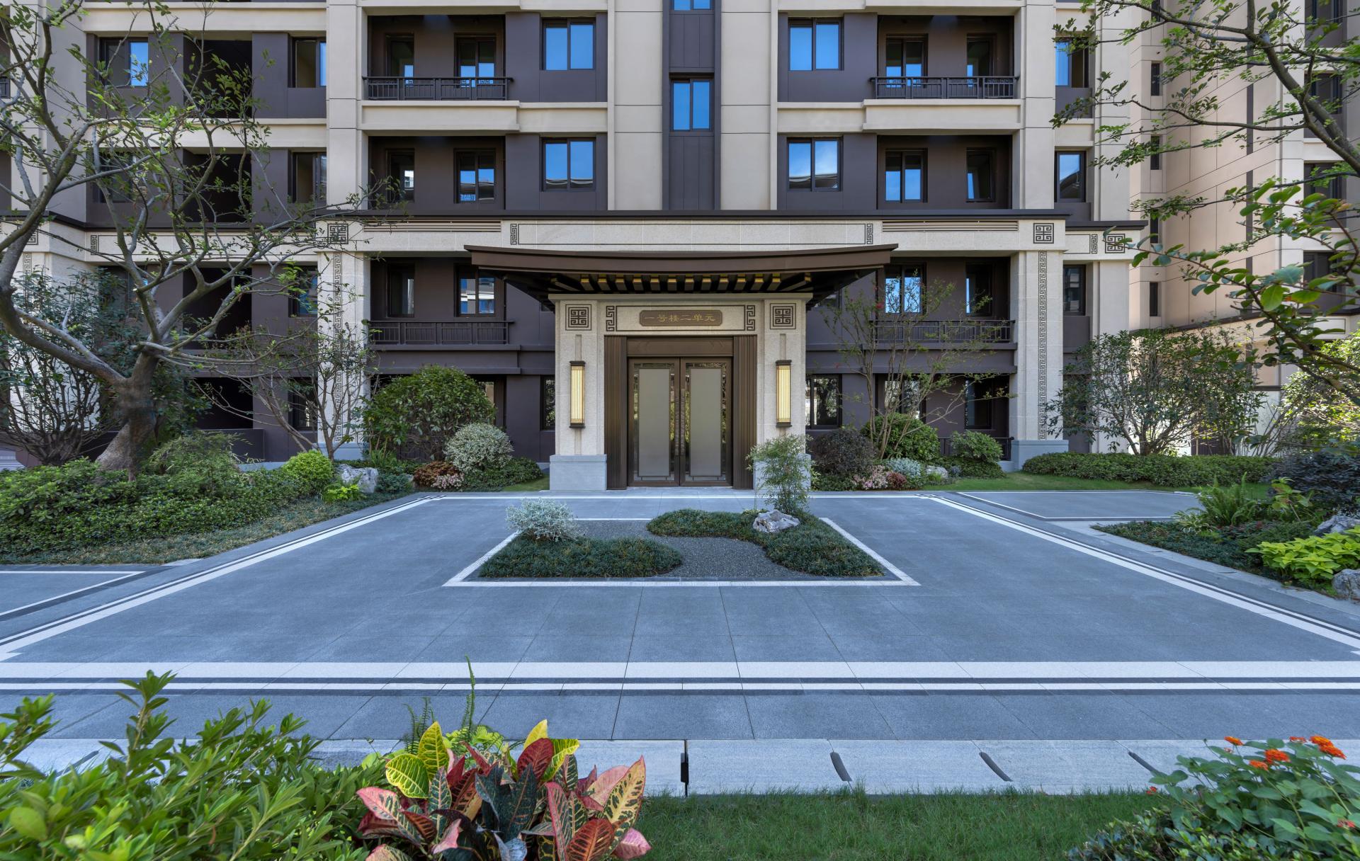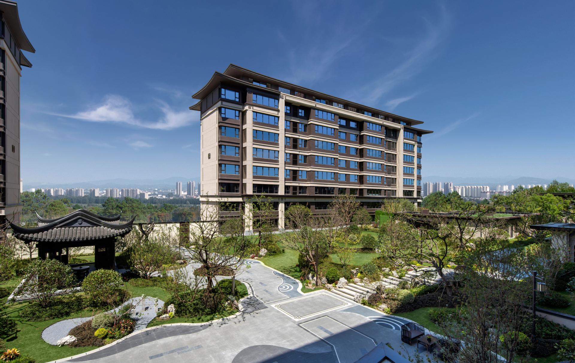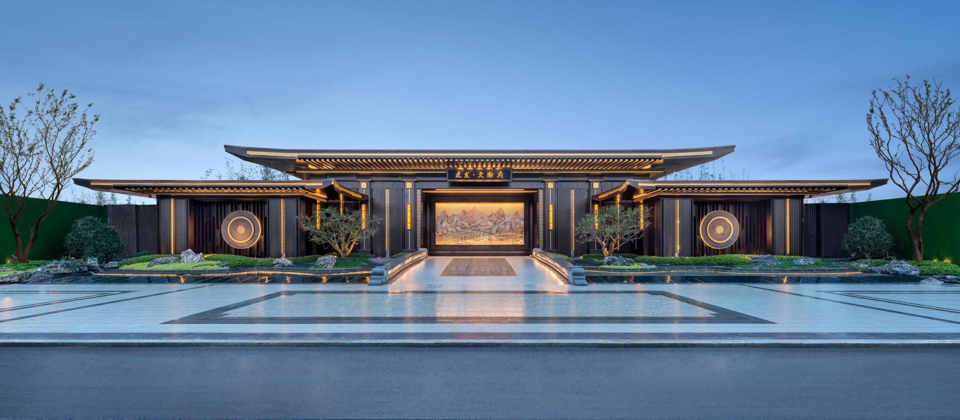 Architectural facades adopt a classic three-part composition in warm beige and deep coffee tones, exuding timeless simplicity and texture. A subtly elevated central cornice enhances symmetry and ritual, while expansive curved eaves reinterpret the principles of “central axis balance,” reimagining the beauty of traditional Chinese dwellings within a modern architectural language.