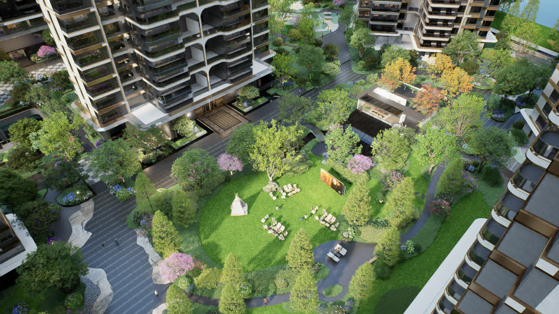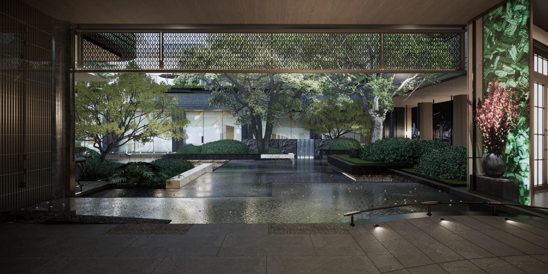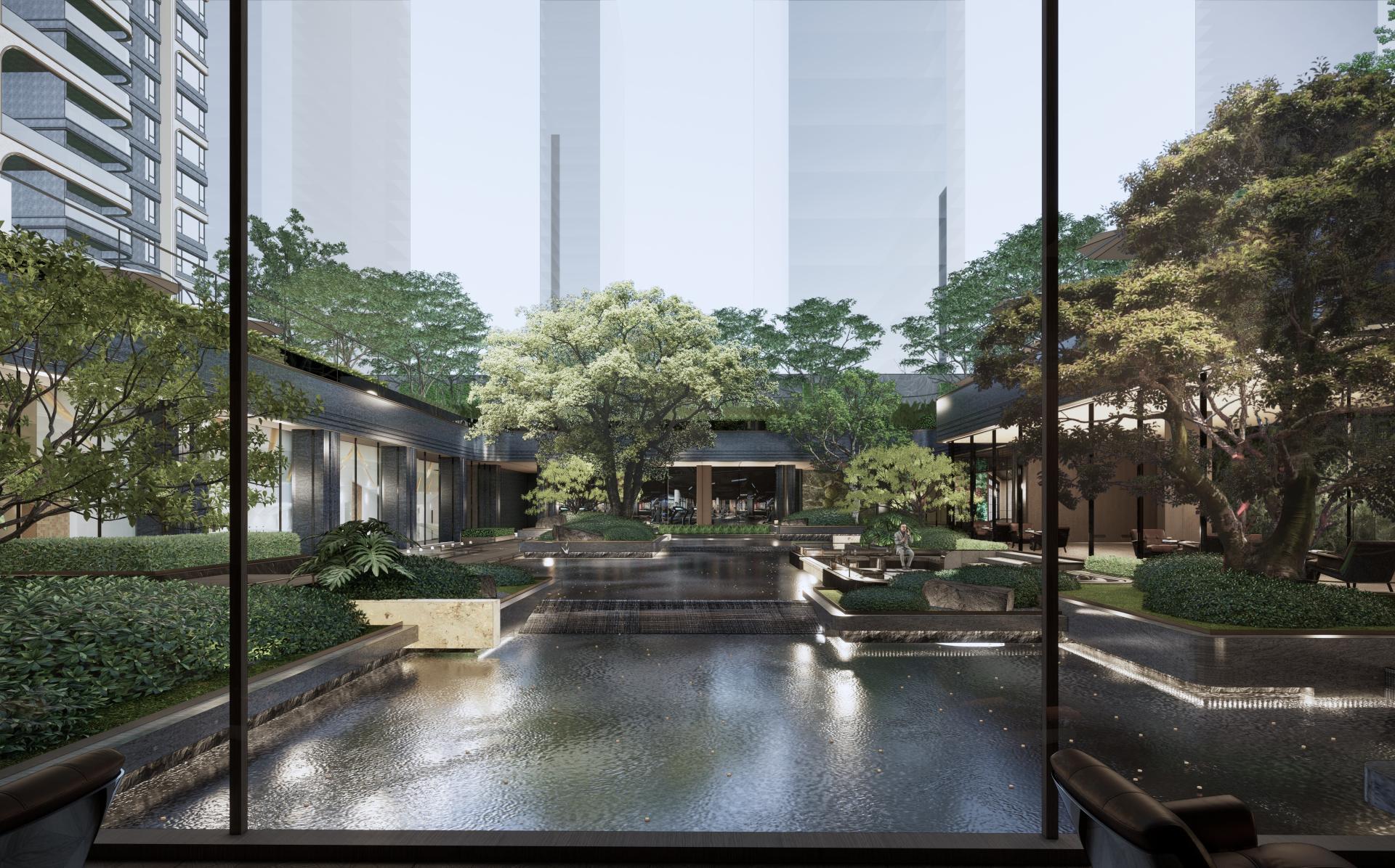 "One Garden" - Hiding Tranquility, drawing inspiration from the secluded beauty of Guifeng Mountain. The sunken water courtyard, covering over 1,000 square meters, integrates an open view with an oversized depth of 38 meters, and creates spatial cognition through the narrative of "Chasing the Deer in the Central Plains". Three branch lines extending from the water courtyard, with "water" as the motif, split into three natural Zen-themed theaters: Zen stones, moss, and waterfalls, which are independent yet interconnected. The first-floor afternoon tea garden is inspired by Bulgari, with Morandi-color flower borders paired with exquisite upholstered seats, creating a cozy atmosphere. The void deck of the premium building seamlessly blends with the external landscape, forming a private garden where every view is like a natural painting. The 258-square-meter cascading waterfall, combined with a corridor made of translucent luxury stones, constitutes a core highlight, and the 570-square-meter camping lawn provides a venue for community activities.