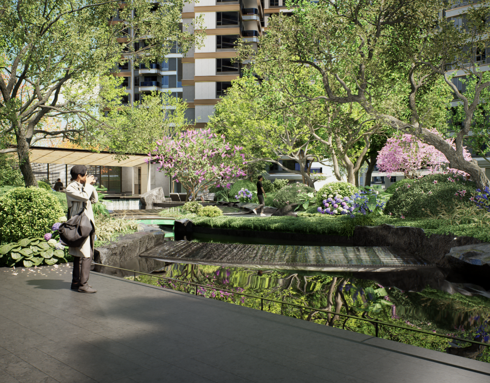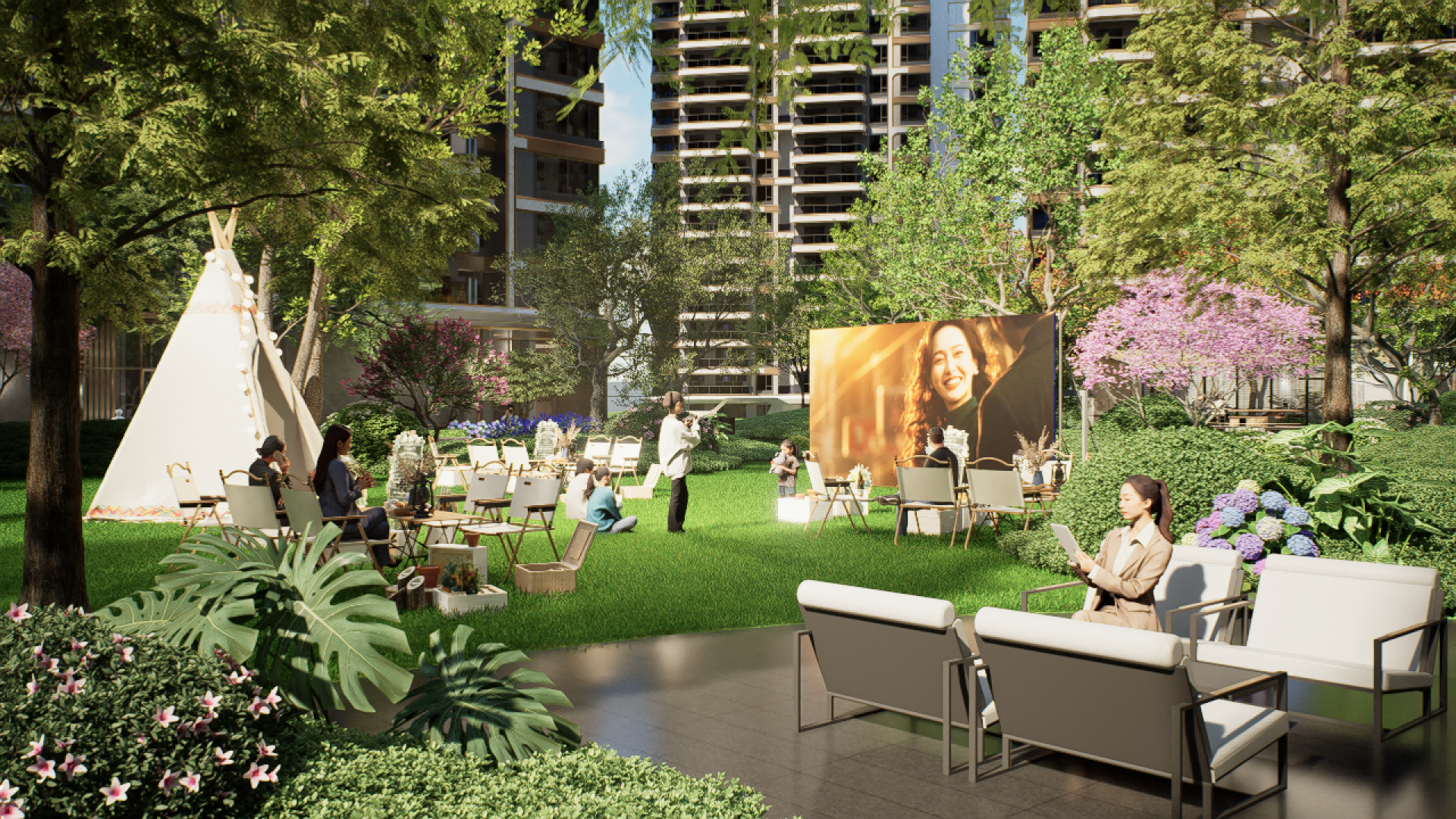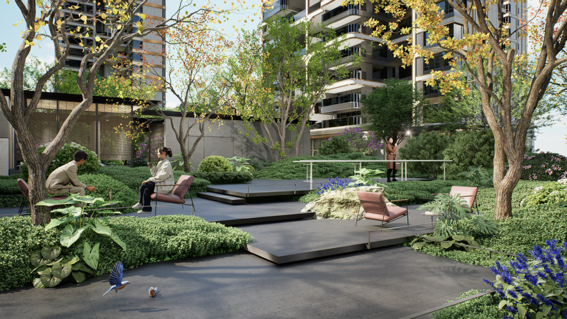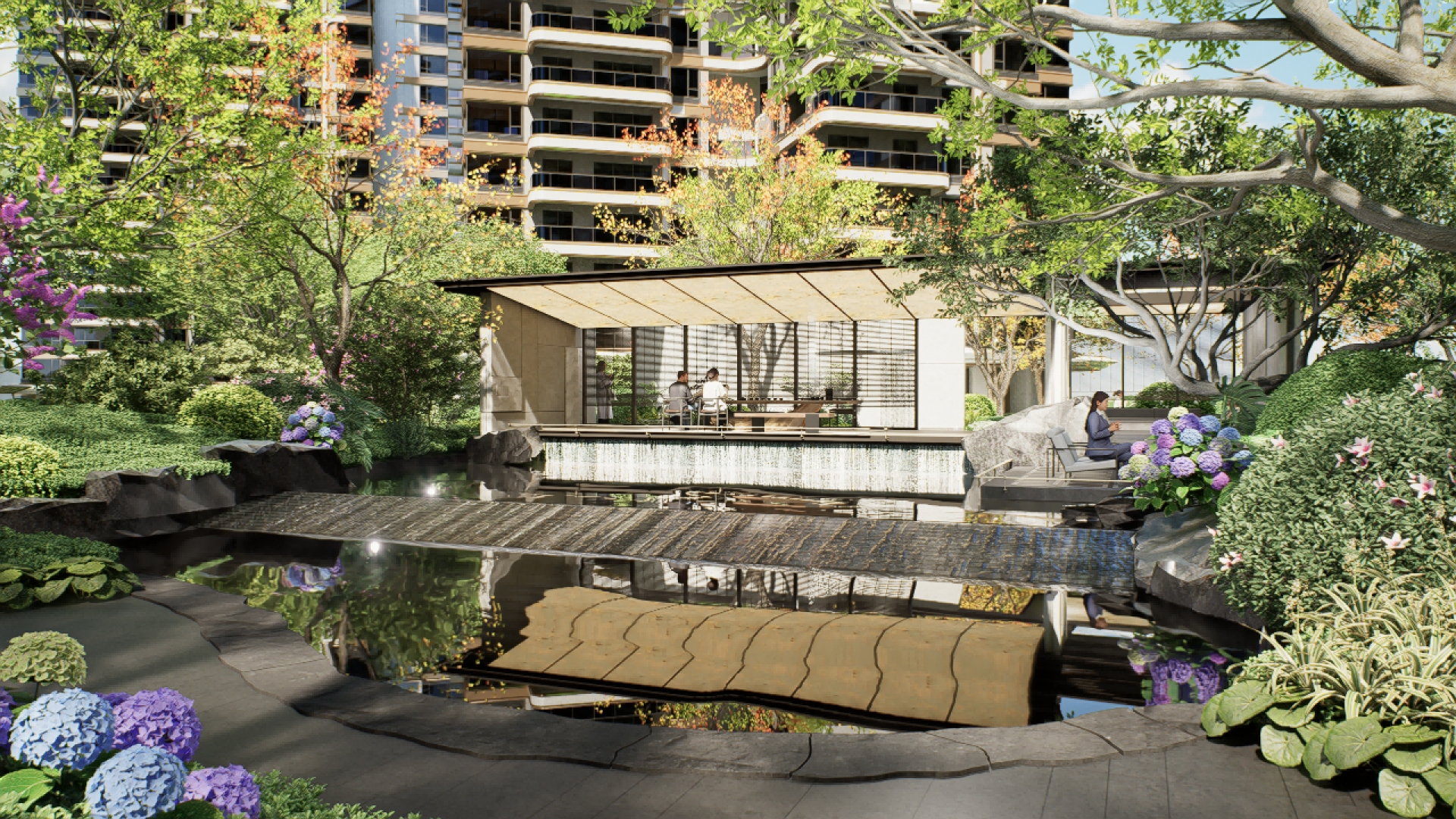 "One Garden" - Hiding Tranquility, drawing inspiration from the secluded beauty of Guifeng Mountain. The sunken water courtyard, covering over 1,000 square meters, integrates an open view with an oversized depth of 38 meters, and creates spatial cognition through the narrative of "Chasing the Deer in the Central Plains". Three branch lines extending from the water courtyard, with "water" as the motif, split into three natural Zen-themed theaters: Zen stones, moss, and waterfalls, which are independent yet interconnected. The first-floor afternoon tea garden is inspired by Bulgari, with Morandi-color flower borders paired with exquisite upholstered seats, creating a cozy atmosphere. The void deck of the premium building seamlessly blends with the external landscape, forming a private garden where every view is like a natural painting. The 258-square-meter cascading waterfall, combined with a corridor made of translucent luxury stones, constitutes a core highlight, and the 570-square-meter camping lawn provides a venue for community activities.